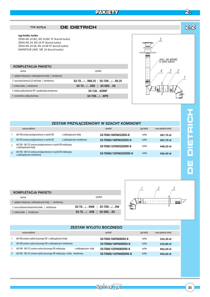 DE DIETRICH TYP KOT¸A typ kotła: turbo ZENA MS 24 BIC, MS 24 BIC FF (kocioł turbo) ZENA MS 24, MS 24 FF (kocioł turbo) ZENA MS 24 MI, MS 24 MI FF (kocioł turbo) MAINFOUR 240F, 18F, 24 (kocioł turbo) KOMPLETACJA PAKIETU symbol nazwa 1 adapter kolanowy z odskraplaczem biały | nierdzewny SX-TD.../…RB0,25 | SX-TDN…/…R0,25 2 rura dwuścienna 0,25 mb biała | nierdzewna 3 osłona biała | nierdzewna SX-TD…/…OSB | SX-OKD…OS ... O 4 kolano jednościenne 90 z podstawką nierdzewne SX-TJN…KS90P 5 wywiewka z płytą dachową ZESTAW PRZYŁÑCZENIOWY W SZACHT KOMINOWY nazwa pakietu symbol typ kotła cena pakietu netto 1 60/100 zestaw przyłączeniowy w szacht DD z odskraplaczem biały SX-TD60/100PAKSZDDO-B turbo 387,70 zł 2 60/100 zestaw przyłączeniowy w szacht DD z odskraplaczem nierdzewny SX-TDN60/100PAKSZDDO-N turbo 387,70 zł 3 60/100 - 80/125 zestaw przyłączeniowy w szacht DD redukcyjny z odskraplaczem biały SX-TD80/125PAKSZDDRO-B turbo 448,30 zł 4 60/100 - 80/125 zestaw przyłączeniowy w szacht DD redukcyjny z odskraplaczem nierdzewny SX-TDN80/125PAKSZDDRO-N turbo 450,40 zł DE DIETRICH SX-TDN…/…WPD KOMPLETACJA PAKIETU symbol nazwa 1 adapter kolanowy z odskraplaczem biały | nierdzewny 2 rura wylotowa dwuścienna biała | nierdzewna SX-TD…/...RWB | SX-TDN…/…RW 3 osłona biała | nierdzewna SX-TD…/…OSB | SX-OKD...OS.... ZESTAW WYLOTU BOCZNEGO nazwa pakietu symbol typ kotła cena pakietu netto 1 60/100 zestaw wylotu bocznego DD z odskraplaczem biały SX-TD60/100PAKBDDO-B turbo 335,30 zł 2 60/100 zestaw wylotu bocznego DD z odskraplaczem nierdzewny SX-TDN60/100PAKBDDO-N turbo 335,80 zł 3 60/100 - 80/125 zestaw wylotu bocznego DD redukcyjny SX-TD80/125PAKBDDRO-B turbo 402,50 zł 4 60/100 - 80/125 zestaw wylotu bocznego DD redukcyjny z odskr. nierdzewny SX-TDN80/125PAKBDDRO-N turbo 405,60 zł z odskraplaczem biały 35 DE DIETRICH TYP KOT¸A średnica przyłącza na kotle 60/100: MCR/II 24/28 BIC (kocioł kondensacyjny) MCR3 24T, 24S, 35S) (kocioł kondensacyjny) MCR3 24/28MI, 30/35MI (kocioł kondensacyjny) INNOVENS MCA 25/28 BIC (kocioł kondensacyjny) INNOVENS MCA 25/28 MI (kocioł kondensacyjny) INNOVENS MCA 15, 25, 35 (kocioł kondensacyjny) TWINEO EGC 25 (kocioł kondensacyjny) MODULENCS AGC (kocioł kondensacyjny) DuoTec Compact (kocioł kondensacyjny) średnica przyłącza na kotle 80/125: Innovens Pro MCA 45 (kocioł kondensacyjny) Elidens DTG E 130-35 (kocioł kondensacyjny) Elidens DTG E 1300-35 (kocioł kondensacyjny) Elidens DTG 1300-35 (kocioł kondensacyjny) Elidens DTG 130-35 / 45 (kocioł kondensacyjny) KOMPLETACJA PAKIETU nazwa symbol* 1 trójnik dwuścienny z deklem biały | nierdzewny 2 rura dwuścienna 0,25 mb biała | nierdzewna SX-TD…/…RB0,25 | SX-TDN…/…R0,25 3 osłona biała | nierdzewna SX-TD…/…OSB | 4 kolano jednościenne 90O z podstawką nierdzewne 5 płyta dachowa przelotowa z kołnierzem DE DIETRICH SX-OKD…OS... SX-TJN…KS90P SX-TJN…PP * - w miejsce kropek należy wprowadzić wartość liczbową odpowienich średnic ZESTAW PRZYŁÑCZENIOWY W SZACHT KOMINOWY nazwa pakietu symbol średnica przyłącza na kotle cena pakietu netto 1 60/100 zestaw przyłączeniowy w szacht DD biały SX-TD60/100PAKSZDD-B 60/100 332,20 zł 2 60/100 zestaw przyłączeniowy w szacht DD nierdzewny SX-TDN60/100PAKSZDD-N 60/100 331,40 zł 3 60/100 - 80/125 zestaw przyłączeniowy w szacht DD redukcyjny biały SX-TD80/125PAKSZDDR-B 60/100 426,70 zł 4 60/100 - 80/125 zestaw przyłączeniowy w szacht DD redukcyjny nierdzewny SX-TDN80/125PAKSZDDR-N 60/100 427,80 zł 5 80/125 zestaw przyłączeniowy w szacht DD biały 1) SX-TD80/125PAKSZDD-B 80/125 381,70 zł 6 80/125 zestaw przyłączeniowy w szacht DD nierdzewny 1) SX-TDN80/125PAKSZDD-N 80/125 381,70 zł 1) zestaw przeznaczony wyłącznie dla kotłów z przyłączem kominowym 80/125 KOMPLETACJA PAKIETU symbol* nazwa 1 trójnik dwuścienny z deklem biały | nierdzewny SX-TD…/...RWB | SX-TDN…/…RW 2 rura wylotowa dwuścienna biała | nierdzewna SX-TD…/…OSB | SX-OKD...OS... 3 osłona biała | nierdzewna * - w miejsce kropek należy wprowadzić wartość liczbową odpowienich średnic ZESTAW WYLOTU BOCZNEGO nazwa pakietu symbol cena pakietu netto 60/100 zestaw wylotu bocznego DD biały SX-TD60/100PAKBDD-B 2 60/100 zestaw wylotu bocznego DD nierdzewny SX-TDN60/100PAKBDD-N 60/100 391,00 zł 3 60/100 - 80/125 zestaw wylotu bocznego DD redukcyjny biały SX-TD80/125PAKBDDR-B 60/100 388,30 zł 4 60/100 - 80/125 zestaw wylotu bocznego DD redukcyjny nierdzewny SX-TDN80/125PAKBDDR-N 60/100 390,30 zł 5 80/125 zestaw wylotu bocznego DD biały 1) SX-TD80/125PAKBDD-B 80/125 373,30 zł 6 80/125 zestaw wylotu bocznego DD nierdzewny 1) SX-TDN80/125PAKBDD-N 80/125 373,30 zł 1) 36 średnica przyłącza na kotle 1 zestaw przeznaczony wyłącznie dla kotłów z przyłączem kominowym 80/125 60/100 390,90 zł