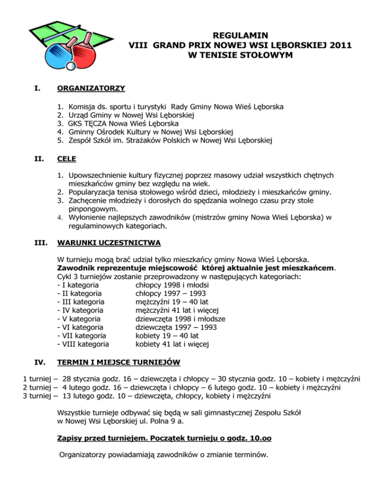 REGULAMIN VIII GRAND PRIX NOWEJ WSI LĘBORSKIEJ 2011 W TENISIE STOŁOWYM I. ORGANIZATORZY 1. 2. 3. 4. 5. II. Komisja ds. sportu i turystyki Rady Gminy Nowa Wieś Lęborska Urząd Gminy w Nowej Wsi Lęborskiej GKS TĘCZA Nowa Wieś Lęborska Gminny Ośrodek Kultury w Nowej Wsi Lęborskiej Zespół Szkół im. Strażaków Polskich w Nowej Wsi Lęborskiej CELE 1. Upowszechnienie kultury fizycznej poprzez masowy udział wszystkich chętnych mieszkańców gminy bez względu na wiek. 2. Popularyzacja tenisa stołowego wśród dzieci, młodzieży i mieszkańców gminy. 3. Zachęcenie młodzieży i dorosłych do spędzania wolnego czasu przy stole pinpongowym. 4. Wyłonienie najlepszych zawodników (mistrzów gminy Nowa Wieś Lęborska) w regulaminowych kategoriach. III. WARUNKI UCZESTNICTWA W turnieju mogą brać udział tylko mieszkańcy gminy Nowa Wieś Lęborska. Zawodnik reprezentuje miejscowość której aktualnie jest mieszkańcem. Cykl 3 turniejów zostanie przeprowadzony w następujących kategoriach: - I kategoria chłopcy 1998 i młodsi - II kategoria chłopcy 1997 – 1993 - III kategoria mężczyźni 19 – 40 lat - IV kategoria mężczyźni 41 lat i więcej - V kategoria dziewczęta 1998 i młodsze - VI kategoria dziewczęta 1997 – 1993 - VII kategoria kobiety 19 – 40 lat - VIII kategoria kobiety 41 lat i więcej IV. TERMIN I MIEJSCE TURNIEJÓW 1 turniej – 28 stycznia godz. 16 – dziewczęta i chłopcy – 30 stycznia godz. 10 – kobiety i mężczyźni 2 turniej – 4 lutego godz. 16 – dziewczęta i chłopcy – 6 lutego godz. 10 – kobiety i mężczyźni 3 turniej – 13 lutego godz. 10 – dziewczęta, chłopcy, kobiety i mężczyźni Wszystkie turnieje odbywać się będą w sali gimnastycznej Zespołu Szkół w Nowej Wsi Lęborskiej ul. Polna 9 a. Zapisy przed turniejem. Początek turnieju o godz. 10.oo Organizatorzy powiadamiają zawodników o zmianie terminów. V. SYSTEM ROZGRYWEK 1. Pojedynki między zawodnikami do 3 wygranych setów. 2. System rozgrywek uzależniony będzie od ilości startujących zawodników. 3. O końcowej klasyfikacji będzie decydować suma punktów uzyskanych w trzech turniejach według następującej punktacji: 4. Przy jednakowej liczbie punktów o pozycji decyduje wyższe miejsce uzyskane w trzecim turnieju. Punktacja Ilość uczestników Miejsce 1 miejsce 2 miejsce 3 miejsce 4 miejsce 5 - 6 miejsce 7 – 8 miejsce 9 – 12 miejsce 13 – 16 miejsce 17 – 24 miejsce 25 – 32 miejsce 33 – 48 miejsce powyżej 48 VI. 32 i więcej 20 - 31 25 21 18 15 12 9 7 5 4 3 2 1 21 18 15 12 9 7 5 3 2 1 Punkty 10 - 19 do 9 18 15 12 9 7 5 3 2 1 15 12 9 7 5 3 1 NAGRODY Po zakończeniu wszystkich trzech turniejów w punktacji ogólnej dla najlepszych trzech zawodników w każdej kategorii nagrody rzeczowe, dyplomy i puchary. Dla wszystkich miejscowości biorących udział w VIII GRAND PRIX (punktacja drużynowa) organizatorzy przewidzieli nagrody w postaci sprzętu sportowego. Przy równej liczbie punktów w końcowej klasyfikacji drużynowej, o wyższym miejscu decydują kolejno ilości I,II, III itd. miejsc uzyskanych w turniejach. VII. UWAGI KOŃCOWE 1. Wszystkie turnieje rozgrywane są zgodnie z przepisami PZTS. 2. W sprawach spornych nie objętych regulaminem decyduje sędzia główny turnieju Andrzej Czubaty. 3. Organizatorzy zastrzegają sobie prawo ewentualnych zmian regulaminu. 4. Organizator nie ponosi odpowiedzialności za wypadki i kradzieże jak i również nie ubezpiecza startujących. 5. Uczestników zawodów obowiązuje przestrzeganie regulaminu sali gimnastycznej i strój sportowy (koszulka w dowolnym kolorze z wyjątkiem białego oraz miękkie obuwie i własna rakietka).