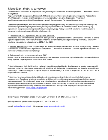 Menedżer jakości w turystyce Trwa rekrutacja do udziału w bezpłatnych certyfikowanych szkoleniach w ramach projektu Menedżer jakości w turystyce Regionalne Kadry Gospodarki, Działanie 8.1 Rozwój pracowników i przedsiębiorstw w regionie; Poddziałanie 8.1.1 Wspieranie rozwoju kwalifikacji zawodowych i doradztwo dla przedsiębiorstw. Projekt jest współfinansowany przez Unię Europejską w ramach Europejskiego Funduszu Społecznego. Uczestnicy projektu będą mieli możliwość przejść kurs przygotowujący do uznawanego i rozpoznawalnego na arenie międzynarodowej certyfikatu zarządzania projektami PRINCE2 FOUNDATION. Kurs zakończy się egzaminem przeprowadzonym przez akredytowaną instytucję. Każdy uczestnik szkolenia weźmie udział w jednym z trzech dodatkowych bloków szkoleniowych: 1. Pełnomocnik ds. systemów zarządzania jakością utrzymania oraz udoskonalania procesów zarządzania w przedsiębiorstwie. Ukończenie szkolenia i zdanie egzaminu pozwala na pełnienie funkcji pełnomocnika systemu zarządzania jakością wg. normy ISO 9001:2008 szkolenia na przełomie lutego i marca 2012, 4 dni (32h) 2. Auditor wewnętrzny - kurs przygotowuje do profesjonalnego prowadzenia auditów w organizacji, badania skuteczności i doskonalenia systemów zarządzania. Ukończenie szkolenia i zdanie egzaminu uprawnia do pełnienia funkcji auditora wewnętrznego 3. Pełnomocnik ds. systemu zarządzania BHP dostarczenie uczestnikom wiedzy umożliwiającej szeroką ocenę systemu zarządzania bezpieczeństwem i higieną pracy zgodnie z wymaganiami norm PN-N serii 18000 Projekt skierowany jest do 50 mikro, małych i średnich przedsiębiorstw działających w branży turystycznej i obsłudze ruchu turystycznego posiadających siedzibę lub jednostkę organizacyjną na terenie województwa lubelskiego i niekorzystających dotąd ze wsparcia szkoleniowego w ramach projektów 8.1.1 i 8.1.2 PO KL w województwie lubelskim. Projekt ma na celu podniesienie kwalifikacji osób pracujących w branży turystycznej i obsłudze ruchu turystycznego. Bezpłatne szkolenia umożliwią szybki rozwój przedsiębiorstw oraz podniesienie ich rynkowej konkurencyjności. W szkoleniach mogą brać udział zarówno właściciele firm jak i wydelegowani przez nich pracownicy wykonujący pracę na podstawie umowy o pracę. Uczestnicy szkolenia będą mieli zapewniona wysoko wykwalifikowaną kadrę, materiały szkoleniowe oraz poczęstunek. Więcej informacji na stronie internetowej projektu - www.wssp.edu.pl/projekt Biuro Projektu "Menedżer jakości w turystyce" ul. Choiny 2, 20-816 Lublin, pokój 45 godziny otwarcia: poniedziałek i piątek 9-13, tel. 728 327 187 e-mail: [email protected] Strona www: www.wssp.edu.pl/projekt Strona 1/1 Powered by TCPDF (www.tcpdf.org)