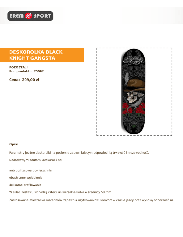 DESKOROLKA BLACK KNIGHT GANGSTA POZOSTALI Kod produktu: 25062 Cena: 209,00 zł Opis: Parametry jezdne deskorolki na poziomie zapewniającym odpowiednią trwałość i niezawodność. Dodatkowymi atutami deskorolki są: antypoślizgowa powierzchnia obustronne wgłębienie delikatne profilowanie W skład zestawu wchodzą cztery uniwersalne kółka o średnicy 50 mm. Zastosowana mieszanka materiałów zapewnia użytkownikowi komfort w czasie jazdy oraz wysoką odporność na ścieranie. Kółka znajdujące się w zestawie doskonale sprawdzą się na płaskich, twardych nawierzchniach np. na asfalcie. Aluminiowe trucki dodatkowo zwiększają niezawodność układu jezdnego. Materiał WYSOKIEJ JAKOŚCI KLON KANADYJSKI Długość całkowita 79 CM Szerokość 20 CM Grubość decka 1 - 2,1 cm Łożyska ABEC-7 Trucki ALUMINIUM Kółka CAST PU Rozstaw kółek 100A Waga 1,8 kg Maks. waga użytkownika 100 kg Opakowanie 2