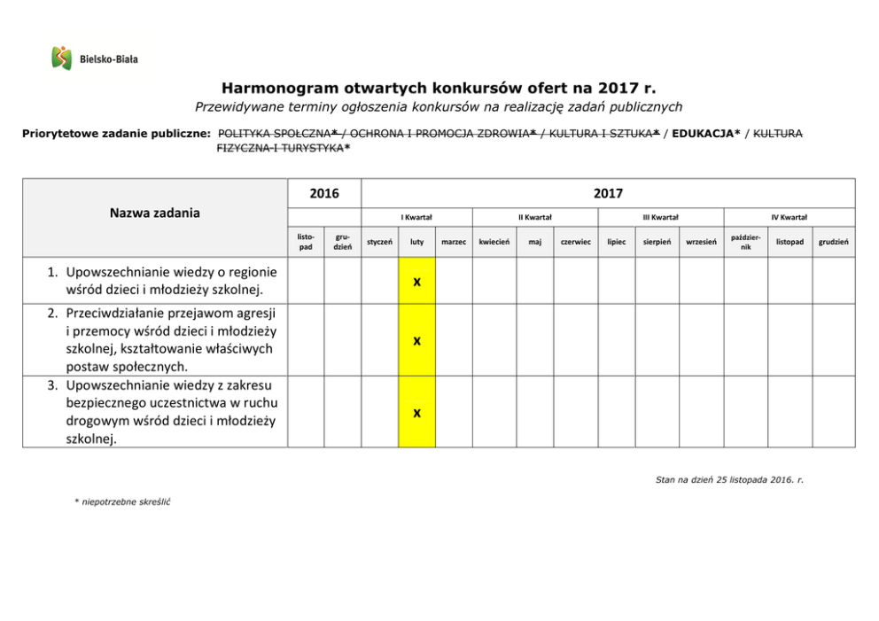 Harmonogram otwartych konkursów ofert na 2017 r. Przewidywane terminy ogłoszenia konkursów na realizację zadań publicznych Priorytetowe zadanie publiczne: POLITYKA SPOŁCZNA* / OCHRONA I PROMOCJA ZDROWIA* / KULTURA I SZTUKA* / EDUKACJA* / KULTURA FIZYCZNA I TURYSTYKA* 2016 2017 Nazwa zadania I Kwartał listopad 1. Upowszechnianie wiedzy o regionie wśród dzieci i młodzieży szkolnej. 2. Przeciwdziałanie przejawom agresji i przemocy wśród dzieci i młodzieży szkolnej, kształtowanie właściwych postaw społecznych. 3. Upowszechnianie wiedzy z zakresu bezpiecznego uczestnictwa w ruchu drogowym wśród dzieci i młodzieży szkolnej. grudzień styczeń luty II Kwartał marzec kwiecień maj III Kwartał czerwiec lipiec sierpień IV Kwartał wrzesień październik listopad x x x Stan na dzień 25 listopada 2016. r. * niepotrzebne skreślić grudzień