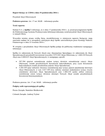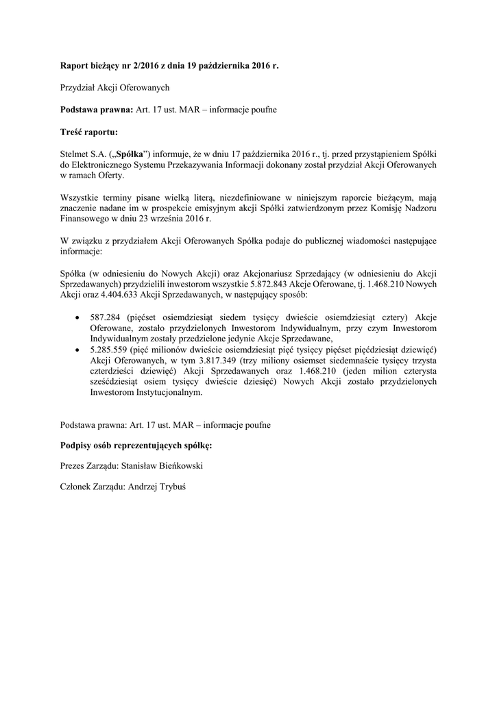 Raport bieżący nr 2/2016 z dnia 19 października 2016 r. Przydział Akcji Oferowanych Podstawa prawna: Art. 17 ust. MAR – informacje poufne Treść raportu: Stelmet S.A. („Spółka”) informuje, że w dniu 17 października 2016 r., tj. przed przystąpieniem Spółki do Elektronicznego Systemu Przekazywania Informacji dokonany został przydział Akcji Oferowanych w ramach Oferty. Wszystkie terminy pisane wielką literą, niezdefiniowane w niniejszym raporcie bieżącym, mają znaczenie nadane im w prospekcie emisyjnym akcji Spółki zatwierdzonym przez Komisję Nadzoru Finansowego w dniu 23 września 2016 r. W związku z przydziałem Akcji Oferowanych Spółka podaje do publicznej wiadomości następujące informacje: Spółka (w odniesieniu do Nowych Akcji) oraz Akcjonariusz Sprzedający (w odniesieniu do Akcji Sprzedawanych) przydzielili inwestorom wszystkie 5.872.843 Akcje Oferowane, tj. 1.468.210 Nowych Akcji oraz 4.404.633 Akcji Sprzedawanych, w następujący sposób: 587.284 (pięćset osiemdziesiąt siedem tysięcy dwieście osiemdziesiąt cztery) Akcje Oferowane, zostało przydzielonych Inwestorom Indywidualnym, przy czym Inwestorom Indywidualnym zostały przedzielone jedynie Akcje Sprzedawane, 5.285.559 (pięć milionów dwieście osiemdziesiąt pięć tysięcy pięćset pięćdziesiąt dziewięć) Akcji Oferowanych, w tym 3.817.349 (trzy miliony osiemset siedemnaście tysięcy trzysta czterdzieści dziewięć) Akcji Sprzedawanych oraz 1.468.210 (jeden milion czterysta sześćdziesiąt osiem tysięcy dwieście dziesięć) Nowych Akcji zostało przydzielonych Inwestorom Instytucjonalnym. Podstawa prawna: Art. 17 ust. MAR – informacje poufne Podpisy osób reprezentujących spółkę: Prezes Zarządu: Stanisław Bieńkowski Członek Zarządu: Andrzej Trybuś