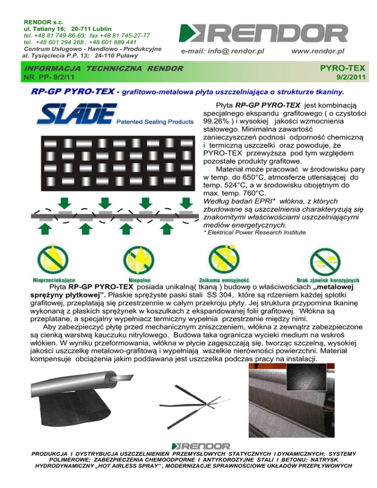RENDOR s.c. ul. Tatiany 16; 20-711 Lublin tel. +48 81 749-86-69; fax +48 81 745-27-77 tel. +48 601 294 288 ; +48 601 889 441 Centrum Usługowo - Handlowo - Produkcyjne al. Tysiąclecia P.P. 13; 24-110 Puławy e-mail: info@ rendor.pl www.rendor.pl INFORMACJA TECHNICZNA RENDOR PYRO-TEX NR PP- 9/2/11 9/2/2011 RP-GP PYRO-TEX - grafitowo-metalowa płyta uszczelniająca o strukturze tkaniny. Płyta RP-GP PYRO-TEX jest kombinacją specjalnego ekspandu grafitowego ( o czystości 99,26% ) i wysokiej jakości wzmocnienia stalowego. Minimalna zawartość zanieczyszczeń podnosi odporność chemiczną i termiczną uszczelki oraz powoduje, że PYRO-TEX przewyższa pod tym względem pozostałe produkty grafitowe. Materiał może pracować w środowisku pary w temp. do 650°C, atmosferze utleniającej do temp. 524°C, a w środowisku obojętnym do max. temp. 760°C. Według badań EPRI* włókna, z których zbudowane są uszczelnienia charakteryzują się znakomitymi właściwościami uszczelniającymi mediów energetycznych. * Elektrical Power Research Institute Płyta RP-GP PYRO-TEX posiada unikalną( tkaną ) budowę o właściwościach „metalowej sprężyny płytkowej”. Płaskie sprężyste paski stali SS 304, które są rdzeniem każdej splotki grafitowej, przeplatają się przestrzennie w całym przekroju płyty. Jej struktura przypomina tkaninę wykonaną z płaskich sprężynek w koszulkach z ekspandowanej folii grafitowej. Włókna są przeplatane, a specjalny wypełniacz termiczny wypełnia przestrzenie między nimi. Aby zabezpieczyć płytę przed mechanicznym zniszczeniem, włókna z zewnątrz zabezpieczone są cienką warstwą kauczuku nitrylowego. Budowa taka ogranicza wycieki medium na wskroś włókien. W wyniku przeformowania, włókna w płycie zagęszczają się, tworząc szczelną, wysokiej jakości uszczelkę metalowo-grafitową i wypełniają wszelkie nierówności powierzchni. Materiał kompensuje obciążenia jakim poddawana jest uszczelka podczas pracy na instalacji. PRODUKCJA I DYSTRYBUCJA USZCZELNIENIEŃ PRZEMYSŁOWYCH STATYCZNYCH I DYNAMICZNYCH; SYSTEMY POLIMEROWE; ZABEZPIECZENIA CHEMOODPORNE I ANTYKOROZYJNE STALI I BETONU; NATRYSK HYDRODYNAMICZNY „HOT AIRLESS SPRAY” , MODERNIZACJE SPRAWNOŚCIOWE UKŁADÓW PRZEPŁYWOWYCH Płyta RP-GP PYRO-TEX Tkana struktura płyty Pojedyncze włókna Elastyczna płyta NAZWA PŁYTY RP –GP PYRO-TEX PRODUCENT WŁÓKNA -włókna chronione patentem Slade, Inc. PRODUCENT PŁYTY Slade, Inc. WYŁĄCZNY DYSTRYBUTOR W POLSCE RENDOR s.c. Temp. pracy ciągłej w atmosferze obojętnej od -240°C do + 760°C Temp. pracy ciągłej w środowisku pary wodnej 650°C Temp. pracy w mediach utleniających -240°C ; +524°C Max ciśnienie Pmax (dopuszczalne ) 4500 psi / 310 bar Wytrzymałość na rozciąganie 2200 psi / 15,17 MPa Wytrzymałość na ściskanie 35000 psi / 241 MPa Ściśliwość 34% ( przy naciskach 5000 psi/ 34 N/mm2 ) Powrót sprężysty w temp. toczenia 10% Powrót sprężysty 6% ( DIN 28090-2) Powrót elastyczny w temp. otoczenia 40% Powrót elastyczny min 30% Zawartość siarki < 360 ppm Zawartość popiołów < 0,74 % Zawartość chlorków < 10 ppm Współczynniki obliczeniowe „m” m=4 Współczynniki obliczeniowe „y” y = 3190 psi / 22 MPa Współczynnik „m” (dla L 0,1 wg DIN 28090-1:1995) 3 Współczynnik „y” (dla L 0,1 wg DIN 28090-1:1995) 13 MPa Szczelności przy naciskach 2900psi / 20 MPa Qmin ( 0,1mg/m/s) Szczelności przy naciskach 5000psi / 35 MPa Qmin ( 0,01mg/m/s) Gęstość płyty 1,20 g/cm3 Dostępne formaty 1,5x1,5; 2,0x2,0; 3,0x3,0 m Dostępne grubości 1,9 mm / inne grubości prosimy o kontakt z naszym doradcą technicznym RODZAJ WŁÓKNA GŁÓWNY SKŁADNIK BUDOWA PŁYTY I SKŁAD WŁÓKIEN PATENT Sprężyste paski SS 304 w indywidualnej koszulce z ekspandu grafitowego Stal SS 304 i specjalny, bardzo wysokiej czystości ( 99,26%) ekspand grafitowy ZALETY: • Uszczelka nie traci masy wraz z czasem eksploatacji, nie ulega procesom starzenia. • Jest niepalna, utrzymuje szczelność połączenia podczas pożaru. • Opatentowane połączenie grafitu z wzmocnieniem stalowym, nadaje wytrzymałość mechaniczną oraz powrót sprężysty. PRODUKCJA I DYSTRYBUCJA USZCZELNIENIEŃ PRZEMYSŁOWYCH STATYCZNYCH I DYNAMICZNYCH; SYSTEMY POLIMEROWE; ZABEZPIECZENIA CHEMOODPORNE I ANTYKOROZYJNE STALI I BETONU; NATRYSK HYDRODYNAMICZNY „HOT AIRLESS SPRAY” , MODERNIZACJE SPRAWNOŚCIOWE UKŁADÓW PRZEPŁYWOWYCH • • • • • • • Uszczelki posiadają dużą odporność na naciski powierzchniowe. Doskonale układa się na kołnierzu, wypełniając wszelkie niedokładności powierzchni. Niespotykana, w grupie płyt uszczelniających, elastyczność umożliwiające składanie, zwijanie wyciętych uszczelek i poprawny montaż po ponownym ich rozłożeniu. Możliwość montażu w miejscach, gdzie otwór aplikacyjny jest mniejszy od średnicy zewnętrznej uszczelki i przełożenie tradycyjnej sztywnej uszczelki jest kłopotliwe. „Tkaninowa” struktura materiału o właściwościach płaskich, metalowych sprężynek w osnowie grafitowej, umożliwia wycinanie wysokojakościowych uszczelek w warunkach warsztatowych ( np. zwykłymi ostrymi nożyczkami ). Szeroki zakres odporności chemicznej ( szczegóły IT OC/PP-12/1/11 ). Wysokiej jakości grafit i specjalny przeciwutleniacz umożliwia pracę w wyższych temperaturach niż powszechnie stosowane materiały uszczelniające. Wysoki poziom szczelności płyt RP-GP PYRO-TEX uzyskiwany jest przy dużej ściśliwości materiału i małym powrocie sprężystym. Elastomer, którym pokryte są zewnętrzne powierzchnie włókien wulkanizuje i szczelnie wypełnia ewentualne niedokładności kołnierza. Hamuje wyciek między powierzchnią uszczelki i kołnierzem. Przeformowanie uszczelki pod wpływem nacisków montażowych i roboczych o więcej niż 50% prowadzi do zagęszczenia materiału i zblokowaniu wycieku między włóknami. Właściwości uszczelniające płyty PYRO-TEX z
