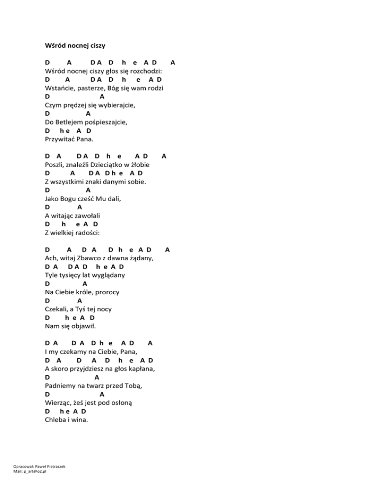 Wśród nocnej ciszy D A DA D h e A D A Wśród nocnej ciszy głos się rozchodzi: D A DA D h e A D Wstańcie, pasterze, Bóg się wam rodzi D A Czym prędzej się wybierajcie, D A Do Betlejem pośpieszajcie, D he A D Przywitać Pana. D A DA D h e A D Poszli, znaleźli Dzieciątko w żłobie D A DA Dh e A D Z wszystkimi znaki danymi sobie. D A Jako Bogu cześć Mu dali, D A A witając zawołali D h e A D Z wielkiej radości: D A D A D h e A D Ach, witaj Zbawco z dawna żądany, D A DA D h e A D Tyle tysięcy lat wyglądany D A Na Ciebie króle, prorocy D A Czekali, a Tyś tej nocy D h e A D Nam się objawił. D A D A D h e A D A I my czekamy na Ciebie, Pana, D A D A D h e A D A skoro przyjdziesz na głos kapłana, D A Padniemy na twarz przed Tobą, D A Wierząc, żeś jest pod osłoną D he A D Chleba i wina. Opracował: Paweł Pietraszek Mail: [email protected] A A