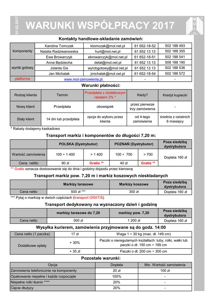 01.02.2017 WARUNKI WSPÓŁPRACY 2017 Kontakty handlowe-składanie zamówień: komponenty Karolina Tomczak [email protected] 61 652-18-52 Natalia Radziwanowska [email protected] 61 652 13 13 502 188 493 502 188 355 Ewa Browarczyk [email protected] 61 652-18-51 502 188 541 Anna Będziecha [email protected] 61 652 13 13 Jolanta Gis [email protected] 61 652 13 13 508 188 190 502 188 536 Jan Michalak [email protected] 61 652-18-54 502 188 572 - - wyrób gotowy platforma www.mol-zamowienia.pl Warunki płatności: Rodzaj klienta Termin Przedpłata z dodatkowym rabatem 2% * Kiedy? Kredyt kupiecki Nowy klient Przedpłata obowiązek przez pierwsze trzy zamówienia - Stały klient 14 dni lub przedpłata opcja do wyboru przez klienta od 4-tego zamówienia średnia z ostatnich 6 miesięcy * Rabaty dodajemy kaskadowo Transport markiz i komponentów do długości 7,20 m: POLSKA (Dystrybutor) POZNAŃ (Dystrybutor) Wartość zamówienia 100 ÷ 1 400 > 1 400 100 ÷ 700 > 700 Cena nettto 90 zł Gratis ** 40 zł Gratis ** Poza siedzibą dystrybutora Dopłata 160 zł ** Gratis oznacza dostosowanie się do dnia i godziny dojazdu przez kierowcę Transport markiz pow. 7,20 m i markiz koszowych nieskładanych Cena netto Markizy tarasowe Markizy koszowe 500 zł *** 300 zł Poza siedzibą dystrybutora Dopłata 160 zł *** Pytaj o markizę w dwóch częściach (transport GRATIS) Transport dedykowany na wyznaczony dzień i godzinę markizy tarasowe do 7,20 markizy pow. 7,20 500 zł 1 200 zł Cena netto Poza siedzibą dystrybutora Dopłata 160 zł Wysyłka kurierem, zamówienia przyjmowane są do godz. 14:00 Cena netto (1 paczka) Dodatkowe opłaty 17 zł Waga 1 ÷ 30 kg (max. dł. 149 cm) + 30% Paczki o nieregularnych kształtach: tuby, rolki, wałki lub paczki o dł. 150 cm ÷ 199 cm + 35 zł Paczki o dł. 200 cm ÷ 300 cm Pozostałe warunki: Opcja Dopłata Min. Wartość zamówienia Zamówienia telefonicznie na komponenty 20 zł 100 zł Opakowanie niepełne i każde rozpoczęte 100% - Niepełne rolki tkanin **** 20% - Cięcie dłużycy 20% -
