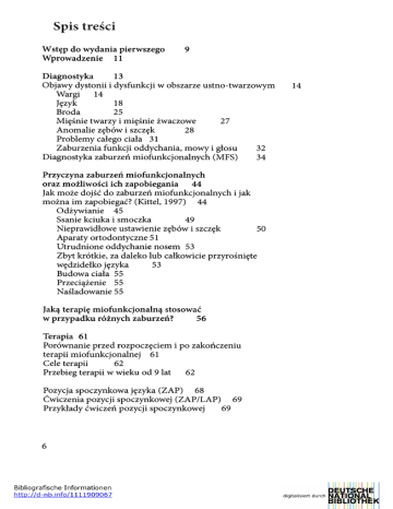 Spis treści ■ t ę p do p i a n i a pierwszego Wprowadzenie 11 9 Diagnostyka 13 Objawy dystonii i dysfunkcji w obszarze ustno-twarzowym W agi 14 Język 18 Broda 25 Mięsnie twarzy i mięsnie zwaczowe 27 Anomalie zębów i szczęk 28 Problemy całego ciała 31 Zaburzenia funkcji oddychania, mowy i głosu 32 Diagnostyka zaburzeń miofunkcjonalnych (MFS) 34 Przyczyna zaburzeń miofunkcjonalnych oraz możliwości ich zapobiegania 44 Jak może dojsc do zaburzeń miofunkcjonalnych i jak można im zapobiegać? (Kittel,1997) 44 Odżywianie 45 Ssanie kciuka i smoczka 49 Nieprawidłowe ustawienie zębów i szczęk 50 Aparaty ortodontyczne 51 Utrudnione oddychanie nosem 53 Zbyt krótkie, za daleko lub całkowicie przyrośnięte wędzidełko języka 53 Budowa ciała 55 Przeciążenie 55 Naśladowanie 55 Jaką terapi ؟miofunKcjonalną stosować w przypadku różnych zaburzeń56 ؟ Terapia 61 Porównanie przed rozpoczęciem i po zakończeniu terapii miofunkcjonalnej 61 Celeterapii 62 Przebieg terapii w wieku od 9 lat 62 Pozycja spoczynkowa języka (ZAP) 68 Ćwiczenia pozycji spoczynkowej (ZAP/LAP) 69 Przykłady Cwiczeń pozycji spoczynkowej 69 Ćwiczenie mięśni w obszarze ustno-twarzowym Obszar cwiczeń-język 75 BI Gwiczenia języka 75 Podsumowanie ćwiczeń jẹzỵka 97 Obszar Cwiczeń warg/twarzy 99 Obszar Cwiczeń warg 100 Β2 Ćwiczenia warg 100 Podsumowanie ćwiczeń wargi górnej Podsumowanie ćwiczeń warg 121 121 Obszar Cwiczeń- środkowa część oraz brzegi języka ВЗ Ćwiczenia zasysania 124 Podsumowanie Cwiczeń zasysania 140 Ćwiczenia połykania 142 Połykanie pojedynczych kęsów pokarmu stałego Połykanie płynów 147 Podsumowanie ćwiczeń połykania 150 Automatyzacja ״nowego” 151 Podsumowanie 156 Kontrola efektów 156 Leczenie interwałowe 158 Koordynacja całego ciaỉa (KCC) 159 Percepcja ciaia 160 Koordynacja 161 Postawa ciała 162 Wzmacnianie mięśni brzucha i pleców 164 Oddychanie przez nos 168 Czynność przepony 172 Podsumowanie ćwiczeń koordynacji całego ciała Ćwiczenia ciała 144 173 176 Przebieg terapii w wieku od 4 lat Sygmatyzm 124 180 182 ״sTArs١, ־specjalna terapia artykulacji głoski ״s״/,,sz185״ Diagnostyka 185 Sygmatyzm przyzębowy - terapia 185 Sygmatyzm miẹdzỵzẹbowỵ ־terapia 185 Sygmatyzm lateralny - terapia 186 Specjalna terapia ״S ״/ ״SZ١J 187 Torowanie głosek 187 Głoska, , s” 187 Głoska ״sz188 ״ Poziom sylaby w nagłosie 189 Poziom wyrazu/zdania w nagłosie 190 Poziom ş a z u w wygłosie/ poziom zdania w nagłosie i wygłosie Poziom wyrazu w srodgłosie 190 Podsumowanie: zasady ״sTArs” 191 Przykład terapii 192 Dokumentacja 193 Schemat przebiegu terapii MFT od 9 roku życia Uwagi końcowe 194 Załącznik 197 Literatura 199 194