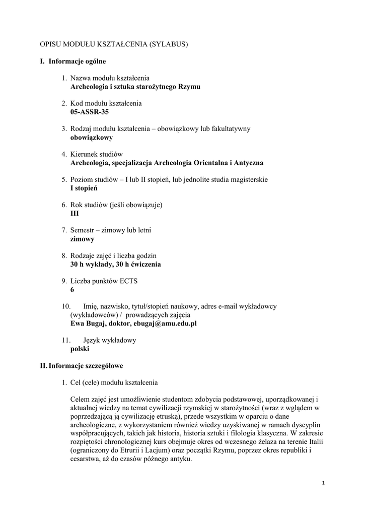 OPISU MODUŁU KSZTAŁCENIA (SYLABUS) I. Informacje ogólne 1. Nazwa modułu kształcenia Archeologia i sztuka starożytnego Rzymu 2. Kod modułu kształcenia 05-ASSR-35 3. Rodzaj modułu kształcenia – obowiązkowy lub fakultatywny obowiązkowy 4. Kierunek studiów Archeologia, specjalizacja Archeologia Orientalna i Antyczna 5. Poziom studiów – I lub II stopień, lub jednolite studia magisterskie I stopień 6. Rok studiów (jeśli obowiązuje) III 7. Semestr – zimowy lub letni zimowy 8. Rodzaje zajęć i liczba godzin 30 h wykłady, 30 h ćwiczenia 9. Liczba punktów ECTS 6 10. Imię, nazwisko, tytuł/stopień naukowy, adres e-mail wykładowcy (wykładowców) / prowadzących zajęcia Ewa Bugaj, doktor, [email protected] 11. Język wykładowy polski II. Informacje szczegółowe 1. Cel (cele) modułu kształcenia Celem zajęć jest umożliwienie studentom zdobycia podstawowej, uporządkowanej i aktualnej wiedzy na temat cywilizacji rzymskiej w starożytności (wraz z wglądem w poprzedzającą ją cywilizację etruską), przede wszystkim w oparciu o dane archeologiczne, z wykorzystaniem również wiedzy uzyskiwanej w ramach dyscyplin współpracujących, takich jak historia, historia sztuki i filologia klasyczna. W zakresie rozpiętości chronologicznej kurs obejmuje okres od wczesnego żelaza na terenie Italii (ograniczony do Etrurii i Lacjum) oraz początki Rzymu, poprzez okres republiki i cesarstwa, aż do czasów późnego antyku. 1 2. Wymagania wstępne w zakresie wiedzy, umiejętności oraz kompetencji społecznych (jeśli obowiązują) Podstawy wiedzy z zakresu wstępu do archeologii, wprowadzenia do archeologii śródziemnomorskiej oraz archeologii i sztuki starożytnej Grecji. 3. Efekty kształcenia w zakresie wiedzy, umiejętności oraz kompetencji społecznych dla modułu kształcenia i odniesienie do efektów kształcenia dla kierunku studiów Symbol efektów kształcenia ASSR_01 ASSR_02 ASSR_03 ASSR_04 ASSR_05 ASSR_06 ASSR_07 Po zakończeniu modułu (przedmiotu) i potwierdzeniu osiągnięcia efektów kształcenia student: potrafi wykazać się podstawową wiedzą na temat źródeł archeologicznych pochodzących z kolejnych okresów rozwoju cywilizacji rzymskiej, od etruskich początków po czasy późnego antyku; potrafi wykazać się podstawową wiedzą na temat rozwoju kulturowego świata rzymskiego na polu urbanistyki, architektury, sztuk plastycznych i rzemiosł, od etruskich początków po czasy późnego antyku; potrafi wykazać się podstawową wiedzą na temat życia codziennego starożytnych Etrusków i Rzymian, zarysowanego w oparciu o bogate źródła, głównie materialne, odnoszące się do instytucji, rytuałów, religii i obyczajów; potrafi wykazać się wiedzą na temat fachowej terminologii, koncepcji naukowych i narzędzi pracy badawczej mających zastosowanie na gruncie archeologii starożytnej Etrurii i starożytnego Rzymu; potrafi wykazać się wiedzą na temat wyników najnowszych badań w zakresie archeologii starożytnej Etrurii i Rzymu; student rozumie zagadnienia i problemy badawcze podejmowane zarówno przez archeologię, jak i historię sztuki oraz historię, które kierowały rozwojem badań nad starożytnym światem rzymskim; wykazuje umiejętności rozpoznawania zabytków charakterystycznych dla kultury starożytnej Etrurii i starożytnego Odniesienie do efektów kształcenia dla kierunku studiów K_W04; K_U01 K_W04; K_U01 K_W04; K_U01 K_W01; K_W02; K_W03; K_U02 K_W06; K_K01 K_W05; K_U08 K_W04; K_W07; K_U05; K_U07 2 ASSR_08 Rzymu i na podstawie ich charakterystycznych cech potrafi określać ich chronologię oraz przeznaczenie; wykazuje umiejętności krytycznej K_W01; K_W07; K_W11; oceny danych archeologicznych oraz K_U03; K_K01; K_K03 dzieł sztuki dotyczących starożytnej spuścizny etruskiej i rzymskiej, jak również posiada kompetencje podejmowania na ten temat dyskusji badawczej, w perspektywie dalszego kształcenia w tym kierunku. 4. Treści kształcenia Archeologia i sztuka starożytnego Rzymu Symbol treści kształcenia Opis treści kształcenia Odniesienie do efektów kształcenia modułu TK_01 Archeologia i sztuka starożytnej Etrurii i starożytnego Rzymu w perspektywie minionych i współczesnych badań ASSR_05; ASSR_06; ASSR_08 TK_02 Cywilizacja etruska - od kultury villanova po czasy romanizacji ASSR_01; ASSR_02; ASSR_03; ASSR_04; ASSR_07 TK_03 TK_04 TK_05 TK_06 TK_07 Początki Rzymu, stan badań i dyskusji naukowej Rzym w okresie republiki: urbanistyka, architektura, sztuki plastyczne i rzemiosła Rzym w okresie cesarstwa: urbanistyka, architektura, sztuki plastyczne i rzemiosła Rzym w czasach późnego antyku: urbanistyka, architektura, sztuki plastyczne i rzemiosła Wybrane aspekty życia codziennego starożytnych społeczności świata rzymskiego ASSR_05; ASSR_06 ASSR_01; ASSR_02; ASSR_03; ASSR_04; ASSR_07 ASSR_01; ASSR_02; ASSR_03; ASSR_04; ASSR_07 ASSR_01; ASSR_02; ASSR_03; ASSR_04; ASSR_07 ASSR_03; ASSR_07 5. Zalecana literatura Literatura obowiązkowa: Dobrowolski W., Sztuka Etrusków, Warszawa 1971. Dobrowolski W., Malarstwo etruskie, Warszawa 1979. Gabucci A., Rzym, seria Leksykon: Cywilizacje, Warszawa 2010. Ostrowski J. A., Starożytny Rzym. Polityka i sztuka, Warszawa-Kraków 1999. 3 Sadurska A., Archeologia starożytnego Rzymu. T.1, Od epoki królów do schyłku republiki, Warszawa 1975. Sadurska A., Archeologia starożytnego Rzymu. T.2, Okres cesarstwa, Warszawa 1980. Sandrelli E., Etruskowie. Dzieje tajemniczego ludu, Warszawa 2009. Zerbini L., Starożytne miasto rzymskie. Historia i życie codzienne, Warszawa 2008. Ziółkowski A., Historia Rzymu, Poznań 2004. Literatura uzupełniająca: Adam J.-P., Roman Buildings: Materials and Techniques, London and New York 2005. Beard M., Pompeje. Życie rzymskiego miasta, Poznań 2010. Boëthius A., Etruscan and Early Roman Architecture, Harmondsworth, Middlesex 1978. Bugaj E., Kilka uwag na temat dziecka w kulturze starożytnego Rzymu, [w:] Dusza maluczka a stra