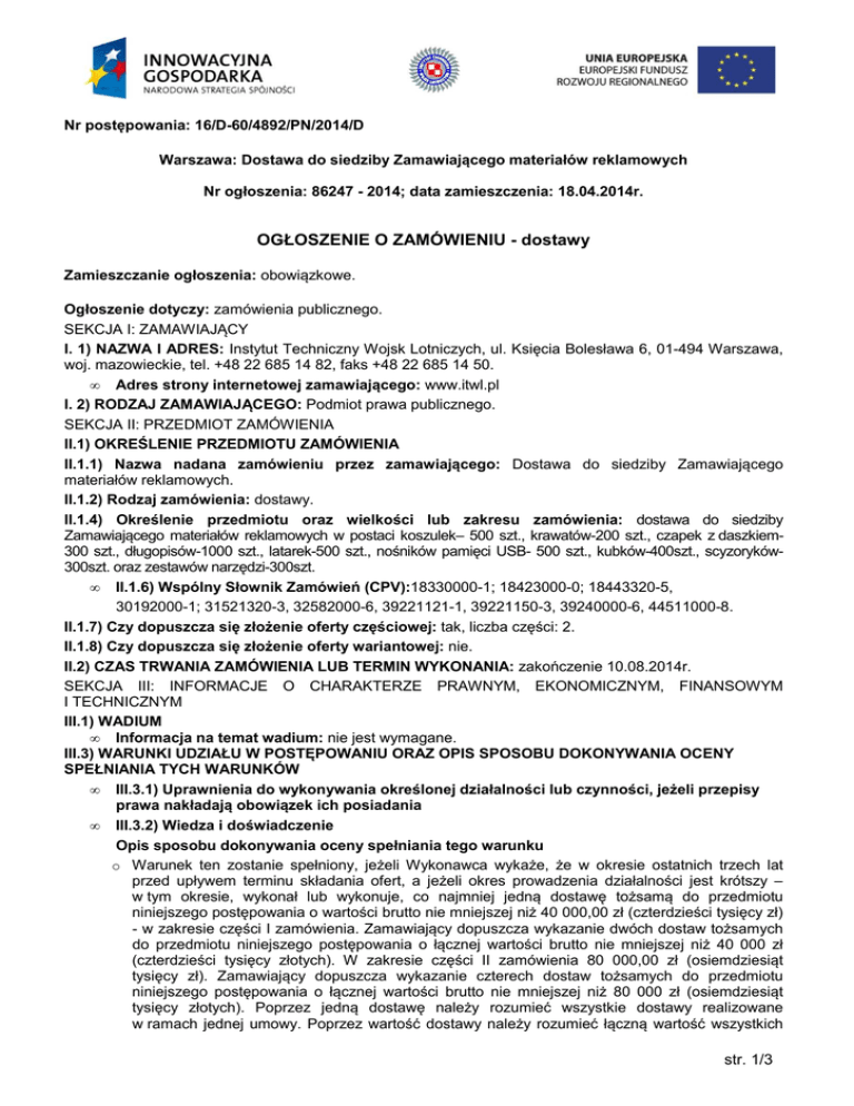 Nr postępowania: 16/D-60/4892/PN/2014/D Warszawa: Dostawa do siedziby Zamawiającego materiałów reklamowych Nr ogłoszenia: 86247 - 2014; data zamieszczenia: 18.04.2014r. OGŁOSZENIE O ZAMÓWIENIU - dostawy Zamieszczanie ogłoszenia: obowiązkowe. Ogłoszenie dotyczy: zamówienia publicznego. SEKCJA I: ZAMAWIAJĄCY I. 1) NAZWA I ADRES: Instytut Techniczny Wojsk Lotniczych, ul. Księcia Bolesława 6, 01-494 Warszawa, woj. mazowieckie, tel. +48 22 685 14 82, faks +48 22 685 14 50. • Adres strony internetowej zamawiającego: www.itwl.pl I. 2) RODZAJ ZAMAWIAJĄCEGO: Podmiot prawa publicznego. SEKCJA II: PRZEDMIOT ZAMÓWIENIA II.1) OKREŚLENIE PRZEDMIOTU ZAMÓWIENIA II.1.1) Nazwa nadana zamówieniu przez zamawiającego: Dostawa do siedziby Zamawiającego materiałów reklamowych. II.1.2) Rodzaj zamówienia: dostawy. II.1.4) Określenie przedmiotu oraz wielkości lub zakresu zamówienia: dostawa do siedziby Zamawiającego materiałów reklamowych w postaci koszulek– 500 szt., krawatów-200 szt., czapek z daszkiem300 szt., długopisów-1000 szt., latarek-500 szt., nośników pamięci USB- 500 szt., kubków-400szt., scyzoryków300szt. oraz zestawów narzędzi-300szt. • II.1.6) Wspólny Słownik Zamówień (CPV):18330000-1; 18423000-0; 18443320-5, 30192000-1; 31521320-3, 32582000-6, 39221121-1, 39221150-3, 39240000-6, 44511000-8. II.1.7) Czy dopuszcza się złożenie oferty częściowej: tak, liczba części: 2. II.1.8) Czy dopuszcza się złożenie oferty wariantowej: nie. II.2) CZAS TRWANIA ZAMÓWIENIA LUB TERMIN WYKONANIA: zakończenie 10.08.2014r. SEKCJA III: INFORMACJE O CHARAKTERZE PRAWNYM, EKONOMICZNYM, FINANSOWYM I TECHNICZNYM III.1) WADIUM • Informacja na temat wadium: nie jest wymagane. III.3) WARUNKI UDZIAŁU W POSTĘPOWANIU ORAZ OPIS SPOSOBU DOKONYWANIA OCENY SPEŁNIANIA TYCH WARUNKÓW • III.3.1) Uprawnienia do wykonywania określonej działalności lub czynności, jeżeli przepisy prawa nakładają obowiązek ich posiadania • III.3.2) Wiedza i doświadczenie Opis sposobu dokonywania oceny spełniania tego warunku o Warunek ten zostanie spełniony, jeżeli Wykonawca wykaże, że w okresie ostatnich trzech lat przed upływem terminu składania ofert, a jeżeli okres prowadzenia działalności jest krótszy – w tym okresie, wykonał lub wykonuje, co najmniej jedną dostawę tożsamą do przedmiotu niniejszego postępowania o wartości brutto nie mniejszej niż 40 000,00 zł (czterdzieści tysięcy zł) - w zakresie części I zamówienia. Zamawiający dopuszcza wykazanie dwóch dostaw tożsamych do przedmiotu niniejszego postępowania o łącznej wartości brutto nie mniejszej niż 40 000 zł (czterdzieści tysięcy złotych). W zakresie części II zamówienia 80 000,00 zł (osiemdziesiąt tysięcy zł). Zamawiający dopuszcza wykazanie czterech dostaw tożsamych do przedmiotu niniejszego postępowania o łącznej wartości brutto nie mniejszej niż 80 000 zł (osiemdziesiąt tysięcy złotych). Poprzez jedną dostawę należy rozumieć wszystkie dostawy realizowane w ramach jednej umowy. Poprzez wartość dostawy należy rozumieć łączną wartość wszystkich str. 1/3 dostaw realizowanych w ramach jednej umowy. III.3.3) Potencjał techniczny • III.3.4) Osoby zdolne do wykonania zamówienia • III.3.5) Sytuacja ekonomiczna i finansowa III.4) INFORMACJA O OŚWIADCZENIACH LUB DOKUMENTACH, JAKIE MAJĄ DOSTARCZYĆ WYKONAWCY W CELU POTWIERDZENIA SPEŁNIANIA WARUNKÓW UDZIAŁU W POSTĘPOWANIU ORAZ NIEPODLEGANIA WYKLUCZENIU NA PODSTAWIE ART. 24 UST. 1 USTAWY • III.4.1) W zakresie wykazania spełniania przez wykonawcę warunków, o których mowa w art. 22 ust. 1 ustawy, oprócz oświadczenia o spełnianiu warunków udziału w postępowaniu należy przedłożyć: • wykaz wykonanych, a w przypadku świadczeń okresowych lub ciągłych również wykonywanych, głównych dostaw lub usług, w okresie ostatnich trzech lat przed upływem terminu składania ofert albo wniosków o dopuszczenie do udziału w postępowaniu, a jeżeli okres prowadzenia działalności jest krótszy - w tym okresie, wraz z podaniem ich wartości, przedmiotu, dat wykonania i podmiotów, na rzecz których dostawy lub usługi zostały wykonane, oraz załączeniem dowodów, czy zostały wykonane lub są wykonywane należycie; • III.4.2) W zakresie potwierdzenia niepodlegania wykluczeniu na podstawie art. 24 ust. 1 ustawy, należy przedłożyć: • oświadczenie o braku podstaw do wykluczenia; • aktualny odpis z właściwego rejestru lub z centralnej ewidencji i informacji o działalności gospodarczej, jeżeli odrębne przepisy wymagają wpisu do rejestru lub ewidencji, w celu wykazania braku podstaw do wykluczenia w oparciu o art. 24 ust. 1 pkt 2 ustawy, wystawiony nie wcześniej niż 6 miesięcy przed upływem terminu składania wniosków o dopuszczenie do udziału w postępowaniu o udzielenie zamówienia albo składania ofert; • III.4.3) Dokumenty podmiotów zagranicznych Jeżeli wykonawca ma siedzibę lub miejsce zamieszkania poza terytorium Rzeczypospolitej Polskiej, przedkłada: III.4.3.1) dokument wystawiony w kraju, w którym ma siedzibę lub miejsce zamieszkania potwierdzający, że: • nie otwarto jego likwidacji ani nie ogłoszono upadłości - wystawiony nie wcześniej niż 6 miesięcy przed upływem terminu składania wniosków o dopuszczenie do udziału w postępowaniu o udzielenie zamówienia albo składania ofert; • III.4.4) Dokumenty dotyczące przynależności do tej samej grupy kapitałowej • lista podmiotów należących do tej samej grupy kapitałowej w rozumieniu ustawy z dnia 16 lutego 2007 r. o ochronie konkurencji i konsumentów albo informacji o tym, że nie należy do grupy kapitałowej; III.5) INFORMACJA O DOKUMENTACH POTWIERDZAJĄCYCH, ŻE OFEROWANE DOSTAWY, USŁUGI LUB ROBOTY BUDOWLANE ODPOWIADAJĄ OKREŚLONYM WYMAGANIOM W zakresie potwierdzenia, że oferowane roboty budowlane, dostawy lub usługi odpowiadają określonym wymaganiom należy przedłożyć: • p
