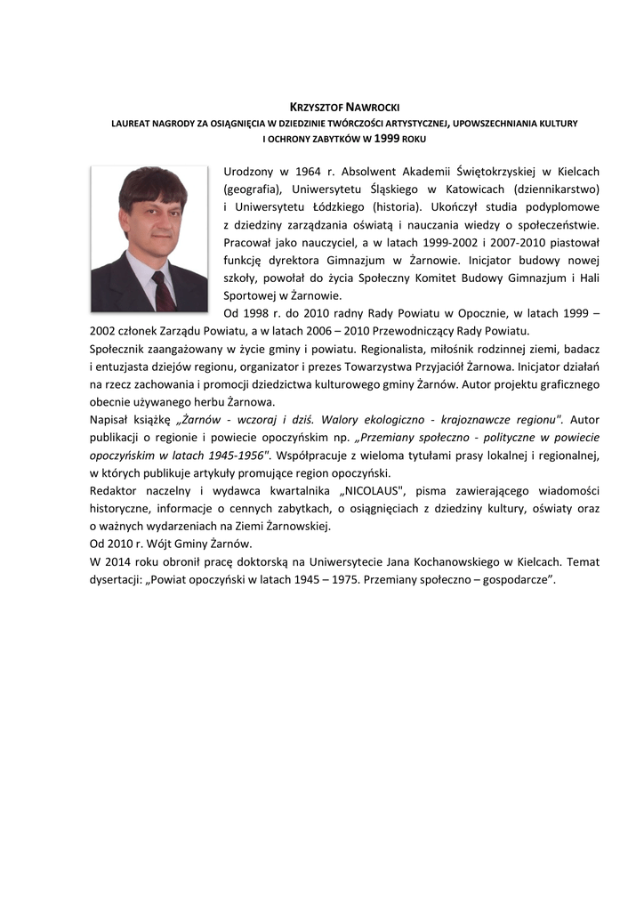 KRZYSZTOF NAWROCKI LAUREAT NAGRODY ZA OSIĄGNIĘCIA SIĄGNIĘCIA W DZIEDZINIE DZIEDZI TWÓRCZOŚCI ARTYSTYCZNEJ, UPOWSZECHNIANIA KULTURY KULT I OCHRONY ZABYTKÓW W 1999 ROKU Urodzony w 1964 r. Absolwent Akademii Świętokrzyskiej w Kielcach (geografia), Uniwersytetu Śląskiego w Katowicach Katowic (dziennikarstwo) i Uniwersytetu Łódzkiego (historia). Ukończył studia podyplomowe z dziedziny zarządzania oświatą i nauczania wiedzy o społeczeństwie. Pracował jako nauczyciel, a w latach 1999-2002 1999 2002 i 2007-2010 2007 piastował funkcję dyrektora Gimnazjum w Żarnowie. Inicjator budowy nowej szkoły, powołał do życia Społeczny Komitet Budowy Gimnazjum i Hali Sportowej w Żarnowie. Od 1998 r. do 2010 radny Rady Powiatu w Opocznie, w latach 1999 – 2002 członek Zarządu Powiatu, a w latach 2006 – 2010 Przewodniczący Rady Powiatu. Społecznik zaangażowany w życie gminy i powiatu. Regionalista, miłośnik rodzinnej ziemi, badacz i entuzjasta dziejów regionu, organizator i prezes Towarzystwa Przyjaciół Żarnowa. Inicjator działań na rzecz zachowania i promocji dziedzictwa kulturowego gminy Żarnów. Autor projektu graficznego obecnie używanego herbu Żarnowa. Napisał książkę „Żarnów Żarnów - wczoraj i dziś. Walory ekologiczno - krajoznawcze regionu". Autor publikacji o regionie i powiecie opoczyńskim np. „Przemiany Przemiany społeczno - polityczne w powiecie opoczyńskim w latach 1945 1945-1956".. Współpracuje z wieloma tytułami prasy lokalnej i regionalnej, w których publikuje artykuły promujące region opoczyński. Redaktor naczelny i wydawca kwartalnika „NICOLAUS", NICOLAUS", pisma zawierającego wiadomości historyczne, istoryczne, informacje o cennych zabytkach, o osiągnięciach z dziedziny kultury, oświaty oraz o ważnych wydarzeniach na Ziemi Żarnowskiej. Od 2010 r. Wójt Gminy Żarnów. W 2014 roku obronił pracę doktorską na Uniwersytecie Jana Kochanowskiego w Kielcach. Temat dysertacji: „Powiat opoczyński w latach 1945 – 1975. Przemiany społeczno – gospodarcze”.