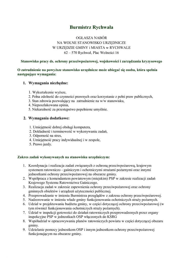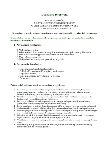Burmistrz Rychwała OGŁASZA NABÓR NA WOLNE STANOWISKO URZĘDNICZE W URZĘDZIE GMINY i MIASTA w RYCHWALE 62 – 570 Rychwał, Plac Wolności 16 Stanowisko pracy ds. ochrony przeciwpożarowej, wojskowości i zarządzania kryzysowego O zatrudnienie na powyższe stanowisko urzędnicze może ubiegać się osoba, która spełnia następujące wymagania: 1. Wymagania niezbędne: 1. Wykształcenie wyższe, 2. Pełna zdolność do czynności prawnych oraz korzystanie z pełni praw publicznych, 3. Stan zdrowia pozwalający na zatrudnienie na w/w stanowisku, 4. Nieposzlakowana opinia, 5. Niekaralność za przestępstwo popełnione umyślnie. 2. Wymagania dodatkowe: 1. Umiejętność dobrej obsługi komputera, 2. Dokładność i terminowość w wykonywaniu zadań, 3. Odporność na stres, 4. Umiejętność pracy indywidualnej i w zespole, 5. Prawo jazdy. Zakres zadań wykonywanych na stanowisku urzędniczym: 1. Koordynacja i realizacja zadań związanych z ochroną przeciwpożarową, krajowym systemem ratowniczo - gaśniczym i ochotniczymi strażami pożarnymi oraz innymi jednostkami ochrony przeciwpożarowej na obszarze gminy. 2. Współpraca z komendantem powiatowym (miejskim) PSP w zakresie realizacji zadań Krajowego Systemu Ratownictwa Gaśniczego. 3. Realizacja zadań w zakresie zapewnienia ochrony przeciwpożarowej oraz ochrony gminnych obiektów i urządzeń użyteczności publicznej. 4. Przeprowadzanie w imieniu Burmistrza przeglądów z zakresu ochrony przeciwpożarowej. 5. Nadzorowanie w imieniu władz gminy funkcjonowania ochotniczych straży pożarnych. 6. Udział w projektowaniu budżetu gminy, w części dotyczącej ochrony przeciwpożarowej (w tym również funkcjonowania ochotniczych straży pożarnych). 7. Udział w inspekcji gotowości do działań ratowniczych przeprowadzonych przez organy inspekcyjne PSP w jednostkach OSP włączonych do KSRG 8. Współudział w opracowywaniu planów ratowniczych powiatu w części dotyczącej obszaru gminy. 9. Udzielanie pomocy jednostkom OSP i innym jednostkom ochrony przeciwpożarowej funkcjonującym na obszarze gminy. 10. Przygotowanie organów kierowania i sił obrony cywilnej: a) dotyczące realizacji przedsięwzięć OC w mieście i gminie, b) dotyczące finansowania realizacji zadań OC, c) dotyczące tworzenia i przygotowywania do działań jednostek organizacyjnych obrony cywilnej, d) dotyczące logistycznego zabezpieczenia organów i sił obrony cywilnej. 11. W zakresie ochrony ludności: a) przygotowanie działania powszechnego systemu ostrzegania ludności o zagrożeniu, b) organizacja zbiorowych elementów ochrony ludności, c) szkolenia ludności w ramach powszechnej samoobrony. 12. Organizacja rejestracji oraz kwalifikacji wojskowej. 13. Działania na rzecz mobilizacji sił zbrojnych. W celu potwierdzenia powyższych wymagań osoba ubiegająca się o zatrudnienie na wolnym stanowisku urzędniczym zobowiązana jest złożyć następujące dokumenty: a) list motywacyjny, b) życiorys (CV), c) dokument potwierdzający wykształcenie (odpis dyplomu ukończenia wyższych studiów ), d) kwestionariusz osobowy, e) pisemne oświadczenie o niekaralności kandydata, f) pisemne oświadczenie o posiadaniu stanu zdrowia pozwalającego na zatrudnienie na określonym stanowisku urzędniczym, g) dodatkowo inne dokumenty potwierdzające posiadane kwalifikacje i umiejętności (np. dyplomy/zaświadczenia o ukończonych kursach, szkoleniach, studiach podyplomowych itp.). Data rozpoczęcia pracy : 01 lipca 2009 r. Wymagane dokumenty aplikacyjne należy składać osobiście w siedzibie Urzędu Gminy i Miasta w Rychwale lub drogą pocztową na adres: Urząd Gminy i Miasta w Rychwale, Plac Wolności 16, 62 – 570 Rychwał z dopiskiem: „Dotyczy naboru na wolne stanowisko pracy ds. ochrony przeciwpożarowej, wojskowości i zarządzania kryzysowego” w terminie do dnia 26 czerwca 2009 r. godz.14.00 ( liczy się data wpływu dokumentów do Urzędu ). Aplikacje, które wpłyną do Urzędu Gminy i Miasta w Rychwale po wyżej określonym terminie nie będą rozpatrywane. Kandydaci spełniający wymagania formalne określone w niniejszym ogłoszeniu zostaną zakwalifikowani do dalszego etapu naboru - rozmowy kwalifikacyjnej, która odbędzie się w dniu 29 czerwca 2009 r. o godz. 10.00 w Urzędzie Gminy i Miasta w Rychwale. Kandydaci zakwalifikowani do dalszego postępowania zostaną powiadomieni telefonicznie o tym fakcie w dniu 26.06.2009 r. Wymagane dokumenty aplikacyjne: list motywacyjny oraz życiorys, powinny być opatrzone klauzulą: „Wyrażam zgodę na przetwarzanie moich danych osobowych dla potrzeb niezbędnych do realizacji procesu naboru zgodnie z ustawą z dnia 29 sierpnia 1997 roku o ochronie danych osobowych (Dz. U. z 2002 r. Nr 101, poz. 926 z późn. zm.) oraz ustawą z dnia 21 listopada 2008 r. o pracownikach samorządowych (Dz. U. z 2008 r. Nr 223, poz. 1458)” i podpisane własnoręcznym podpisem. Kandydat wyłoniony w drodze naboru przed zawarciem umowy o pracę zobowiązany jest przedłożyć aktualne zaświadczenie z Krajowego Rejestru Karnego o niekaralności oraz aktualne zaświadczenie z przeprowadzonego badania lekarskiego potwierdzającego zdolność do wykonywania pracy na stanowisku urzędniczym. Rychwał, dnia 15.06.2009 r. Burmistrz Rychwała /-/ Jan Bartczak
