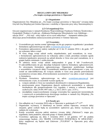 REGULAMIN GRY MIEJSKIEJ „Na tropie czystego powietrza w Opocznie” § 1 Organizator Organizatorem Gry Miejskiej pn. „Na tropie czystego powietrza w Opocznie” (zwanej dalej Grą lub Grą Miejską) jest Gmina Opoczno z siedzibą w Opocznie przy ulicy Staromiejskiej 6. § 2 Cel organizacji Gry Gra jest organizowana w ramach Konkursu Wojewódzkiego Funduszu Ochrony Środowiska i Gospodarki Wodnej w Łodzi pn. „Edukacja Ekologiczna Mieszkańców woj. łódzkiego – edycja 2016” – „Nie truj! - miej wpływ na to czym oddychasz” – kampania edukacyjna dotycząca przeciwdziałania zanieczyszczeniu powietrza w Gminie Opoczno. § 3 Uczestnicy 1. Uczestnikiem gry można zostać zgłaszając się do gry poprzez wypełnienie i przesłanie formularza zgłoszeniowego na adres [email protected] 2. Formularze zgłoszeniowe należy nadsyłać od 12 do 31 sierpnia 2016 r. do godz. 1400 na wskazany adres e-mail. 3. W Grze mogą wziąć udział osoby niepełnoletnie, pod warunkiem, że wraz z formularzem zgłoszeniowym na wskazany adres e-mail, przesłana zostanie zgoda rodziców/opiekunów prawnych na udział dziecka w Grze oraz pod warunkiem, że w grupie będzie minimum 1 osoba dorosła. 4. W zabawie może wziąć udział maksymalnie 6 grup 4 lub 5-osobowych. O zakwalifikowaniu do gry decyduje kolejność wpływu formularzy zgłoszeniowych. Po otrzymaniu formularza zgłoszeniowego, Organizator poinformuje każdego z uczestników (zwanych dalej Uczestnikiem) mailowo lub telefonicznie o tym, czy został on zakwalifikowany do wzięcia udziału w Grze oraz prześle potwierdzenie uczestnictwa (zwane dalej „Potwierdzeniem uczestnictwa”) na adres e-mail wskazany w formularzu. 5. Wysłanie formularza zgłoszeniowego na adres [email protected] jest równoznaczne z tym, że uczestnik wyraża zgodę na: a. wzięcie udziału w Grze na warunkach określonych w niniejszym Regulaminie, b. przetwarzanie przez Organizatora danych osobowych uczestników w zakresie niezbędnym dla przeprowadzenia Gry (zgodnie z ustawą o ochronie danych osobowych z dnia 29.09.1997 roku, t. j. Dz.U.2015 r. poz. 2135 ), c. nieodpłatne rozpowszechnianie swojego wizerunku bez ograniczeń terytorialnych i czasowych za pośrednictwem dowolnego medium w ramach Gry Miejskiej „Na tropie czystego powietrza w Opocznie”. § 4 Zasady gry 1. Gra odbędzie się 3 września 2016 roku w Opocznie w godzinach 1100-1500 . 2. Organizator wyznaczy 8 lokalizacji na terenie miasta Opoczno, zwanych dalej stacjami, gdzie czekali będą na uczestników sędziowie gry, którzy wyznaczą im zadania do wykonania. 3. Każdy uczestnik otrzyma pakiet startowy (zwany dalej „Pakietem”): mapa gry, regulamin, karta punktów, znacznik grupy w formie plakietki. 4. Uczestnicy zgłaszają się dnia 3 września 2016 r. od godziny 1030 do punktu oznaczonego hasłem „NA TROPIE CZYSTEGO POWIETRZA W OPOCZNIE”, który znajdować się będzie nad Zalewem „TULIPAN” w Opocznie przy ulicy Wałowej. 5. Uczestnicy mają obowiązek przed rozpoczęciem Gry wpisać się na listę przy punkcie „NA TROPIE CZYSTEGO POWIETRZA W OPOCZNIE”, jednocześnie potwierdzając swoją tożsamość legitymacją szkolną/dowodem osobistym. 6. Gra rozpocznie się o godzinie 1100 przy punkcie wydawania pakietów, poprzez losowanie kolejności rozpoczęcia przez grupy Gry. Kolejne grupy będą rozpoczynały Grę w 10 minutowym odstępie czasowym. 7. Zadaniem Uczestników Gry jest poruszanie się pomiędzy poszczególnymi stacjami oraz wykonywanie następujących po sobie zadań. Każde poprawnie wykonane zadanie nagradzane jest punktami, które wpisywane będą w Kartę punktów. 8. Przy wybranych stacjach będą znajdowały się stanowiska sędziów, którzy będą udzielać zawodnikom wskazówek oraz sprawdzać poprawność wykonywanych przez nich zadań. Udział w Grze jest bezpłatny. 9. Po trasie Gry Uczestnicy poruszają się pieszo na podstawie mapy gry, która znajduje się w Pakiecie. Nie można korzystać z rowerów, samochodów, skuterów i innych pojazdów silnikowych. 10. W czasie Gry obowiązuje bezwzględny nakaz przestrzegania przepisów ruchu drogowego. Uczestnik, który nie dostosuje się do tego wymogu zostanie wykluczony z dalszej rozgrywki. 11. Gra toczy się w normalnym ruchu miejskim, z uwagi na to Uczestnicy obowiązani są do zachowania szczególnej ostrożności. Organizator nie zapewnia opieki medycznej dla osób uczestniczących w Grze. 12. Uczestnicy poruszają się po mieście na własną odpowiedzialność. Uczestnicy biorą na siebie pełną odpowiedzialność cywilnoprawną na cały czas trwania Gry. W przypadku osób niepełnoletnich odpowiedzialność za taką osobę ponoszą rodzice/opiekunowie prawni. 13. W przypadku naruszenia przez Uczestnika niniejszego regulaminu, złamania zasad fair play bądź utrudniania Gry innym Uczestnikom, Organizator ma prawo do wykluczenia go z Gry. Wykluczenie może nastąpić w dowolnym momencie Gry. Decyzja Organizatora w tej kwestii jest ostateczna. 14. Uczestnik, który znajduje się pod wpływem alkoholu lub innych środków odurzających nie może wziąć udziału w Grze. 15. Organizator nie ponosi odpowiedzialności za zachowania Uczestników Gry mogące naruszyć porządek publiczny lub dobra osobiste osób trzecich. § 5 Zwycięzcy 1. Zwycięzcą Gry jest osoba/drużyna, która osiągnie najlepszy wynik na karcie gry. 2. Po przekroczeniu mety każdy Uczestnik powinien niezwłocznie udać się do punktu wyników oznaczonego hasłem „NA TROPIE CZYSTEGO POWIETRZA W OPOCZNIE”, w którym należy okazać kartę gry. 3. Na podstawie przedstawionych przez Uczestników kart gry Organizator Gry wyłoni zwycięzcę z największą liczbą punktów. § 6 Nagrody 1. Nagrody przyznane zostaną według poniższej klasyfikacji: I miejsce – 5 x 10 godzinny karnet na basen, słuchawki II-VI miejsce – gadżety „Nie truj! – miej wpływ na to czym oddychasz” § 7 Postanowienia końcowe 1. Organizatorzy z