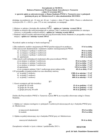 Zarządzenie nr 56/2013r. Rektora Państwowej Wyższej Szkoły Zawodowej w Tarnowie z dnia 13 września 2013 r. w sprawie opłat za zakwaterowanie w Domu Studenta PWSZ w Tarnowie oraz w pokojach gościnnych przy ul. Mickiewicza 8 w roku akademickim 2013/2014 działając na podstawie art. 14 oraz art. 66 ust. 1 ustawy z dnia 27 lipca 2005r. Prawo o szkolnictwie wyższym (Dz. U. z 2012 r., poz. 572 ze zm.) zarządzam, co następuje: §1 1. Miejsce w pokoju z łazienką dla studenta PWSZ – opłata za 1 miesiąc wynosi 250 zł. 2. Opłata za miejsce dla osób pozostających w pokoju 2 lub 3 osobowym samodzielnie (w miesiącu czerwcu, w przypadku wolnych miejsc) - opłata za 1 miesiąc wynosi 400 zł. 3. Studenci innych uczelni zakwaterowani decyzją Kierownika Domu Studenta (w przypadku wolnych miejsc) - opłata za 1 miesiąc wynosi 330 zł. §2 Wysokość opłat za noclegi w bazie noclegowej: 1.Dla studentów studiów stacjonarnych PWSZ przebywających na praktyce 15 zł za dobę 2.Dla nauczycieli akademickich i studentów studiów niestacjonarnych PWSZ: a) za miejsce w pokoju 3 osobowym 30 zł za dobę b) za miejsce w pokoju 2 osobowym 40 zł za dobę c) za miejsce w pokoju 1 osobowym 60 zł za dobę d) apartament 120 zł za dobę 3.Dla innych osób niebędących studentami albo pracownikami PWSZ: a) za miejsce w pokoju 3 osobowym 30 zł za dobę + VAT b) za miejsce w pokoju 2 osobowym 40 zł za dobę + VAT c) za miejsce w pokoju 1 osobowym 60 zł za dobę + VAT d) apartament 120 zł za dobę + VAT e) za wynajęcie pokoju 2 lub 3 osobowego przez jedną osobę 60 zł za dobę +VAT 4.W przypadku wynajęcia pokoi na czas określony umową: a) za pokój 3 osobowy 1300 zł za miesiąc + VAT b) za pokój 2 osobowy 900 zł za miesiąc + VAT c) za pokój 1 osobowy 600 zł za miesiąc + VAT §3 1. Koszt wynajęcia sali lub świetlicy: a) grupa do 10 osób b) grupa do 30 osób c) grupa powyżej 30 osób 15 zł za godzinę + VAT 30 zł za godzinę + VAT 40 zł za godzinę + VAT §4 Zniżka dla Pracowników PWSZ w Tarnowie wynosi 50 % na wszystkie oferowane usługi w Domu Studenta. §5 1. Opłata za 1 miejsce noclegowe w pokojach 2 osobowych mieszczących się w budynku PWSZ przy ul. Mickiewicza: a) nauczyciel akademicki b) student 20 zł za dobę 30 zł za dobę 2. Opłata za pokój mieszczący się w budynku PWSZ przy ul. Mickiewicza: nauczyciel akademicki §6 Zarządzenie wchodzi w życie z dniem 1 października 2013 r. 30 zł za dobę REKTOR prof. dr hab. Stanisław Komornicki