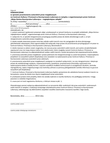 Załącznik OŚWIADCZENIE w sprawie przeniesienia autorskich praw majątkowych na Centrum Kultury i Promocji w Kocmyrzowie-Luborzycy w związku z organizowanym przez Centrum „Moja Gmina Kocmyrzów-Luborzyca – najpiękniejsze zakątki” Ja /imię i nazwisko/…………………………………………………………..zamieszkała/y w………………………../kod pocztowy/ ……………ulica ……………………………… /PESEL/ ……………. , legitymująca/y się......................................................................................................... seria i numer DO lub paszportu oświadczam, że: 1. jestem autorem/ opiekunem prawnym zdjęć, przekazanych w ramach konkursu na projekt widokówki „Moja Gmina– najpiękniejsze zakątki”, organizowanego przez centrum Kultury i Promocji w Kocmyrzowie-Luborzycy; 2. wyłącznie mi, w sposób nieograniczony przysługują wszelkie prawa do dzieła określonego w pkt.1, w tym nieograniczone autorskie prawa majątkowe; 3. dzieło zostało stworzone przeze mnie bez udziału osób trzecich oraz nie zaciągnąłem do dnia dzisiejszego jakichkolwiek zobowiązań, które ograniczałyby lub wyłączały moje prawo do przeniesienia przysługujących mi praw na Centrum Kultury i Promocji w Kocmyrzowie-Luborzycy, Baranówka 6: 4. dzieło stanowi w całości utwór oryginalny, nie narusza praw autorskich osób trzecich, jest wolne od jakichkolwiek zapożyczeń oraz nie mają miejsca żadne inne okoliczności, które mogłyby narazić Centrum Kultury i Promocji w Kocmyrzowie-Luborzycy na odpowiedzialność wobec osób trzecich z tytułu korzystania lub rozpowszechniania dzieła; 5. przenoszę autorskie prawa majątkowe i prawa pokrewne do nieograniczonego w czasie korzystania i rozporządzania projektem na wszystkich polach eksploatacji oraz zezwalam na wykonywanie przez Centrum Kultury i Promocji w Kocmyrzowie-Luborzycy autorskich praw zależnych; 6. przeniesienie autorskich praw majątkowych następuje na zasadach wyłączności, na czas nieograniczony i obejmuje prawo do wielokrotnego wydania, rozpowszechniania, powielana, przetwarzania (chociażby częściowo) oraz wykorzystania dzieła w każdej formie z użyciem wszelkich środków technicznych w szczególności drukiem, technika reprograficzną, zapisu magnetycznego oraz techniką cyfrowa za pomocą jakiegokolwiek nośnika informacji na gruncie wszystkich pól eksploatacji 7. Centrum Kultury i Promocji w Kocmyrzowie-Luborzycy będzie uprawnione do udzielenia licencji osobom trzecim na korzystanie z praw do dzieła oraz zbycia majątkowych praw autorskich; 8. przekazane przeze mnie projekty, które nie zostały wybrane w wyniku konkursu nie podlegają zwróceniu i mogą pozostać w siedzibie Organizatora; 9. znana jest mi treść regulaminu Konkursu, o którym mowa w pkt. 1; Oświadczający ponosi wyłączną odpowiedzialność za naruszenie dóbr osobistych lub praw autorskich i pokrewnych osób trzecich w związku z realizacją niniejszego oświadczenia przez Centrum Kultury i Promocji w KocmyrzowieLuborzycy, zobowiązując się dobrowolnie zaspokoić wszelkie ewentualne roszczenia wynikłe z tego tytułu. Baranówka, dnia …………......... 2013 roku ................................................................................................ czytelny podpis autora ..................................................................................... czytelny podpis składającego oświadczenie