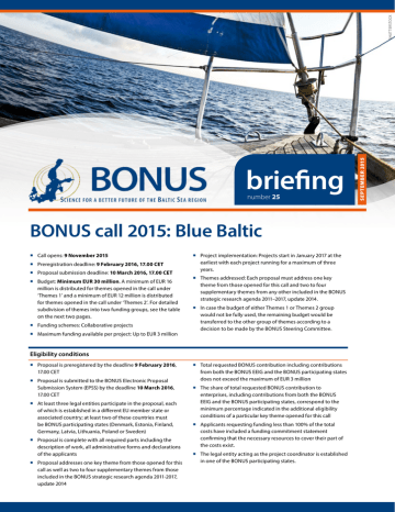 SHUTTERSTOCK number 25 BONUS call 2015: Blue Baltic Call opens: 9 November 2015 Preregistration deadline: 9 February 2016, 17.00 CET Proposal submission deadline: 10 March 2016, 17.00 CET Budget: Minimum EUR 30 million. A minimum of EUR 16 million is distributed for themes opened in the call under ‘Themes 1’ and a minimum of EUR 12 million is distributed for themes opened in the call under ‘Themes 2’. For detailed subdivision of themes into two funding groups, see the table on the next two pages. Funding schemes: Collaborative projects Maximum funding available per project: Up to EUR 3 million Project implementation: Projects start in January 2017 at the earliest with each project running for a maximum of three years. Themes addressed: Each proposal must address one key theme from those opened for this call and two to four supplementary themes from any other included in the BONUS strategic research agenda 2011–2017, update 2014. In case the budget of either Themes 1 or Themes 2 group would not be fully used, the remaining budget would be transferred to the other group of themes according to a decision to be made by the BONUS Steering Committee. Eligibility conditions Proposal is preregistered by the deadline 9 February 2016, 17.00 CET Proposal is submitted to the BONUS Electronic Proposal Submission System (EPSS) by the deadline 10 March 2016, 17.00 CET At least three legal entities participate in the proposal, each of which is established in a different EU member state or associated country; at least two of these countries must be BONUS participating states (Denmark, Estonia, Finland, Germany, Latvia, Lithuania, Poland or Sweden) Proposal is complete with all required parts including the description of work, all administrative forms and declarations of the applicants Proposal addresses one key theme from those opened for this call as well as two to four supplementary themes from those included in the BONUS strategic research agenda 2011-2017, update 2014 Total requested BONUS contribution including contributions from both the BONUS EEIG and the BONUS participating states does not exceed the maximum of EUR 3 million The share of total requested BONUS contribution to enterprises, including contributions from both the BONUS EEIG and the BONUS participating states, correspond to the minimum percentage indicated in the additional eligibility conditions of a particular key theme opened for this call Applicants requesting funding less than 100% of the total costs have included a funding commitment statement confirming that the necessary resources to cover their part of the costs exist. The legal entity acting as the project coordinator is established in one of the BONUS participating states. SEPTEMBER 2015 briefing Themes called for BONUS call 2015: Blue Baltic Additional eligibility conditions BONUS strategic objective Themes called* 1: Understanding the Baltic Sea ecosystem structure and functioning Theme 1.3: Food web structure and dynamics None Theme 1.4: Multilevel impacts of hazardous substances None Themes 1 2: Meeting the multifaceted challenges in linking the Baltic Sea with its coast and catchment Theme 2.4: Eco-technological approaches to achieve good ecological status None in the Baltic Sea Foci on (i) economic models supporting elaboration of regulations and incentives facilitating eco-technological development and on (ii) an evidence-based review of the feasibility of new technological solutions and/or biomanipulation methods. 3: Enhancing sustainable use of coastal and marine goods and services of the Baltic Sea Theme 3.5: Sustainable aquaculture in the Baltic Sea Focus on scientifically justified criteria enabling environmentally balanced and socially accepted aquaculture production across the Baltic Sea region. None 4: Improving the capabilities of the society to respond to the current and future challenges directed to the Baltic Sea region Theme 4.2: Linking ecosystem goods and services to human lifestyles and well-being Focus on quantification of the socioeconomic value of the ecosystem services and developing models for comparative and consequential analyses of cumulative benefits and trade-offs among different marine ecosystem services. None Theme 4.3: Maritime spatial planning from local to Baltic Sea region scale Foci on (i) applying the ecosystem approach in maritime spatial planning (MSP), particularly, developing an ecologically and socio-economically sound network of protected marine areas covering the whole Baltic Sea and (ii) exploring the needs and establishing a region-wide data exchange network in support of MSP in the Baltic Sea. None Theme 5.1: Developing and improving scientific basis for integrated monitoring programmes for continuous assessment of ecological status and human pressures None ISTOCK 5: Developing improved and innovative observation and data management systems, tools and methodologies for marine information needs in the Baltic Sea region BONUS strategic objective Additional eligibility conditions Themes called* Themes 2 2: Meeting the multifaceted challenges in linking the Baltic Sea with its coast and catchment Theme 2.4: Eco-technological approaches to achieve good ecological status in the Baltic Sea Foci on (i) improvement of retention and recirculation of nutrients and other chemical substances, (ii) new methods for improved wastewater treatment efficiency for xenobiotics and persistent micro- and nanoparticles, (iii) new methods for recovery of substances from waste and sediments, (iv) new methods for retention and reduction of air pollution from energy production and transportation, (v) new testing methods for sewage, leachate from landfills, wastewater and storm water and (vi) new methods for restoration of marine and coastal habitats. Projects will be selected for funding only on a condition that at least 25% of the requested BONUS funding goes to enterprises 3: Enhancing sustainable use of coastal and marine goods and service
