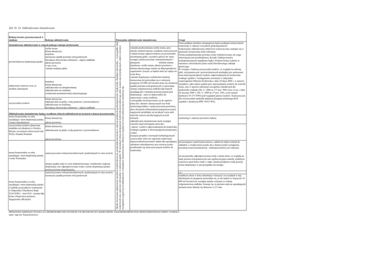 Zał. Nr 2A Oddziaływanie skumulowane Skumulowane oddziaływania w ramach jednego rodzaju użytkowania rzeźba terenu klimat akustyczny krajobraz nieznaczny spadek poziomu wód gruntowych likwidacja zbiorowiska roślinności - zdjęcie nadkładu powierzchniowa eksploatacja piasku jakość powietrza w tym, m.in.: -zmiana struktury gleby elektrownie wiatrowe wraz ze strefami ochronnymi krajobraz klimat akustyczny oddziaływanie na chiropterofaunę oddziaływanie na ornifauny zwiększenie promieniowania niejonizującego oczyszczalnia ścieków klimat akustyczny oddziaływanie na gleby, wody gruntowe i powierzchniowe oddziaływanie na ornifaunę likwidacja zbiorowiska roślinności - zdjęcie nadkładu Oddziaływania skumulowane będące wynikiem różnych oddziaływań na terenach o innym przeznaczeniu tereny bezpośrednio ze sobą klimat akustyczny; sąsiadujące: teren eksploatacji piasku i tereny mieszkaniowe jakość powietrza; oczyszczalnia ścieków planowana klimat akustyczny; niedaleko od zabudowy w Orzelcu Dużym, na terenach zalewowych rzek oddziaływanie na gleby, wody gruntowe i powierzchniowe Wisły i Kanału Strumień jakość powietrza; tereny bezpośrednio ze sobą zanieczyszczenie wód powierzchniowych i podziemnych (w razie awarii); sąsiadujące: teren eksploatacji piasku i rzeka Wschodnia zmiana spadku rzeki (w razie niekontrolowanej, wielokrotnie większej eksploatacji oraz odpompowywania wody z terenu eksploatacji piasku poniżej poziomu ekspoloatacji); zanieczyszczenie wód powierzchniowych i podziemnych (w razie awarii); nieznaczny spadek poziomu wód gruntowych tereny bezpośrednio ze sobą sąsiadujące: teren eksploatacji piasku i siedlisko przyrodnicze wymienione w Załączniku I Dyrektywy Rady 92/43/EWG – kod 6510 - nizinne łąki kośne (Alopecurus pratensis, Sanguisorba officinalis) Potencjalne oddziaływanie skumulowane Skutki stworzenia odmiennych warunków środowiskowych, przekształcenia terenu w zakresie podanych geokomponentów, będą miały charakter odwracalny - w przypadku farm wiatrowych oraz częściowo odwracalny w zakresie kopalni; W warunkach silnej antropopresji środowiska przyrodniczego, jako systemu naczyń połącznych, należy rozważyć wystąpienie negatywnych oddziaływań o charakterze skumulowanym; Można tu rozpatrywać wiele niekorzystnych scenariuszy np.: Rodzaj terenów przeznaczonych w studium Rodzaje oddziaływania wskutek przekształcenia rzeźby terenu, przy udziale ciężkich maszyn, osiadania zanieczyszczeń i lokalizowania zaplecza budowy na powierzchni nieosłoniętej gleby, wycieków paliwa itd. może wystąpić zanieczyszczenie wód podziemnych i płynących; wskutek zmiany krajobrazu, rzeźby terenu, jakości powietrza i klimatu akustycznego zmieni się skład gatunkowy organizmów żywych, co będzie mieć też wpływ na świat flory; wskutek eksploatacji wielokrotnie bardziej intensywnej niż przewiduje się w niniejszej prognozie (10 000 m3/rocznie) może się zaznaczyć spadek poziomu wód gruntowych co spowoduje zmianę wilgotnosciową siedliska łąk kośnych sąsiadujących z terenami przeznaczonymi pod eksploatację - może to doprowadzić do stepowienia i utraty siedliska; w przypadku niezastasowania się do zapisów planu dot. ekranów akustycznych oraz brak monitoringu hałasu i zanieczyszczenia powietrza, duże obciążenie infrastrukturą transportową może negatywnie przekładać się na jakość życia osób stale lub czasowo przebywających na tych terenach; oddziaływanie skumulowane może wystąpić wskutek nieprzestrzegania norm dot.: - jakości ścieków odprowadzanych do środowiska wodnego (zgodnie w obowiązującymi przepisami), a także przyjęcia projektu i rozwiązań technologicznych oczyszczalni, które nie zapewnią zachowania dopuszczalnych poziomów hałasu dla sąsiadującej zabudowy mieszkaniowej oraz stworzą ryzyko przedostania się nieoczyszczonych ścieków do środowiska. Uwagi Teren poddany działaniu antropopresji będzie podlegał ścisłej kontroli środowiska w zakresie wszystkich geokomponentów; Niekorzystne oddziaływanie elektrowni wiatrowej musi zamykać się w granicach wyznaczonej strefy ochronnej; Tereny poeksploatacyjne powinny zostać zrekultywowane, do czego zobowiązany jest przedsiębiorca; Kształt i funkcja terenów poeksploatacyjnych uzgadniane będą z Wójtem Gminy Łubnice w momencie zatwierdzenie planu ruchu likwidowanego zakładu górniczego; W związku z budową oczyszczalni ścieków, ze względu na ochronę gleb, wód gruntowych i powierzchniowych niezbędne jest zachowanie norm dotyczących jakości ścieków odprowadzanych do środowiska wodnego zgodnie z wymaganiami zawartymi w załączniku rozporządzenia Ministra Środowiska z dnia 24 lipca 2006 r. w sprawie warunków, jakie należy spełnić przy wprowadzaniu ścieków do wód lub ziemi, oraz w sprawie substancji szczególnie szkodliwych dla środowiska wodnego (Dz. U. 2006 nr 137 poz. 984) wraz ze zm. z dnia 28 stycznia 2009 r. (Dz. U. 2009 nr 27 poz. 169), a tym samym dyrektywy 91/271/EWG pod względem jakości ścieków. Konieczne jest aby oczyszczalnia spełniała najlepszą dostępną technologię BAT (zgodnie z dyrektywą IPPC 96/61/WE). monitoring w zakresie poziomów hałasu; przestrzeganie zasad bezpieczeństwa, zakład nie będzie należał do zakładów o zwiększonym ryzyku ani o dużym ryzyku wystąpienia poważnej awarii przemysłowej - niebezpieczeństwo jest znikome; nie ma potrzeby odpompowywania wody z terenu złoża, ze względu na niski poziom wód gruntowych oraz ogólne przyjęcie metody wydobycia częściowo spod lustra wody i z lądu; zmiana przepływu wody poniżej terenu eksploatacji w tym przypadku nie nastąpi; j.w. wydobycie złoża w ilości określonej w koncesji i na zasadach w niej określonych (w prognozie przewiduje się, że nie będzie to więcej niż 10 000 m3/rocznie) nie wystąpią zmiany wziązane ze zmianą wilgotnościową siedliska. Szacuje się, że