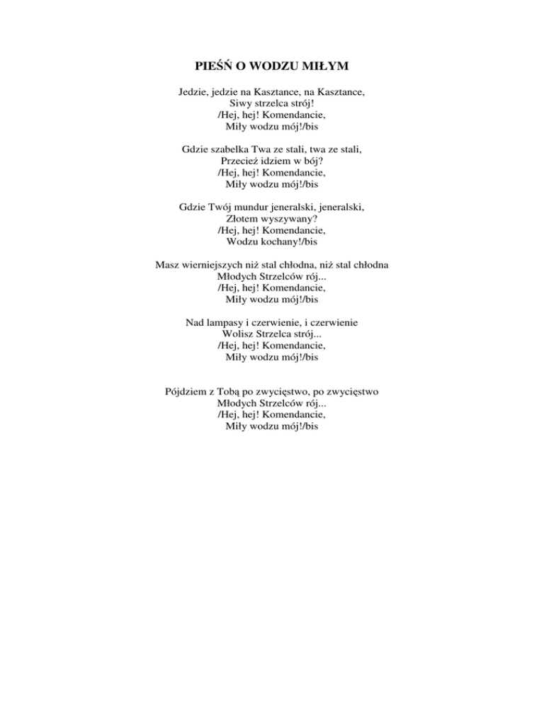 PIEŚŃ O WODZU MIŁYM Jedzie, jedzie na Kasztance, na Kasztance, Siwy strzelca strój! /Hej, hej! Komendancie, Miły wodzu mój!/bis Gdzie szabelka Twa ze stali, twa ze stali, Przecież idziem w bój? /Hej, hej! Komendancie, Miły wodzu mój!/bis Gdzie Twój mundur jeneralski, jeneralski, Złotem wyszywany? /Hej, hej! Komendancie, Wodzu kochany!/bis Masz wierniejszych niż stal chłodna, niż stal chłodna Młodych Strzelców rój... /Hej, hej! Komendancie, Miły wodzu mój!/bis Nad lampasy i czerwienie, i czerwienie Wolisz Strzelca strój... /Hej, hej! Komendancie, Miły wodzu mój!/bis Pójdziem z Tobą po zwycięstwo, po zwycięstwo Młodych Strzelców rój... /Hej, hej! Komendancie, Miły wodzu mój!/bis