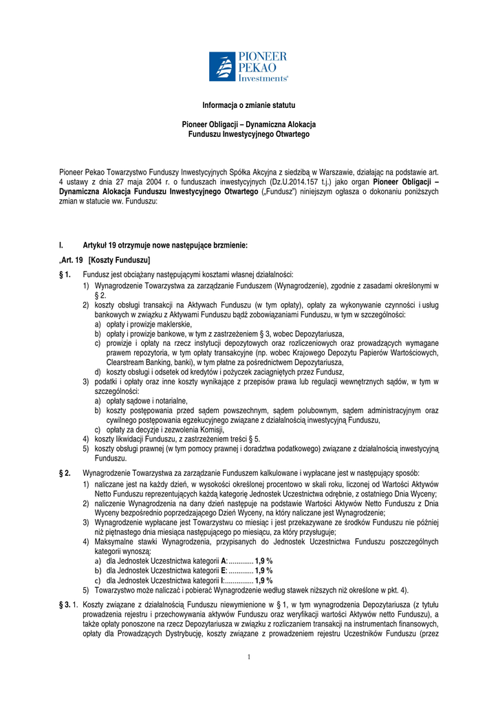 Informacja o zmianie statutu Pioneer Obligacji – Dynamiczna Alokacja Funduszu Inwestycyjnego Otwartego Pioneer Pekao Towarzystwo Funduszy Inwestycyjnych Spółka Akcyjna z siedzibą w Warszawie, działając na podstawie art. 4 ustawy z dnia 27 maja 2004 r. o funduszach inwestycyjnych (Dz.U.2014.157 t.j.) jako organ Pioneer Obligacji – Dynamiczna Alokacja Funduszu Inwestycyjnego Otwartego („Fundusz”) niniejszym ogłasza o dokonaniu poniŜszych zmian w statucie ww. Funduszu: I. Artykuł 19 otrzymuje nowe następujące brzmienie: „Art. 19 [Koszty Funduszu] § 1. Fundusz jest obciąŜany następującymi kosztami własnej działalności: 1) Wynagrodzenie Towarzystwa za zarządzanie Funduszem (Wynagrodzenie), zgodnie z zasadami określonymi w § 2. 2) koszty obsługi transakcji na Aktywach Funduszu (w tym opłaty), opłaty za wykonywanie czynności i usług bankowych w związku z Aktywami Funduszu bądź zobowiązaniami Funduszu, w tym w szczególności: a) opłaty i prowizje maklerskie, b) opłaty i prowizje bankowe, w tym z zastrzeŜeniem § 3, wobec Depozytariusza, c) prowizje i opłaty na rzecz instytucji depozytowych oraz rozliczeniowych oraz prowadzących wymagane prawem repozytoria, w tym opłaty transakcyjne (np. wobec Krajowego Depozytu Papierów Wartościowych, Clearstream Banking, banki), w tym płatne za pośrednictwem Depozytariusza, d) koszty obsługi i odsetek od kredytów i poŜyczek zaciągniętych przez Fundusz, 3) podatki i opłaty oraz inne koszty wynikające z przepisów prawa lub regulacji wewnętrznych sądów, w tym w szczególności: a) opłaty sądowe i notarialne, b) koszty postępowania przed sądem powszechnym, sądem polubownym, sądem administracyjnym oraz cywilnego postępowania egzekucyjnego związane z działalnością inwestycyjną Funduszu, c) opłaty za decyzje i zezwolenia Komisji, 4) koszty likwidacji Funduszu, z zastrzeŜeniem treści § 5. 5) koszty obsługi prawnej (w tym pomocy prawnej i doradztwa podatkowego) związane z działalnością inwestycyjną Funduszu. § 2. Wynagrodzenie Towarzystwa za zarządzanie Funduszem kalkulowane i wypłacane jest w następujący sposób: 1) naliczane jest na kaŜdy dzień, w wysokości określonej procentowo w skali roku, liczonej od Wartości Aktywów Netto Funduszu reprezentujących kaŜdą kategorię Jednostek Uczestnictwa odrębnie, z ostatniego Dnia Wyceny; 2) naliczenie Wynagrodzenia na dany dzień następuje na podstawie Wartości Aktywów Netto Funduszu z Dnia Wyceny bezpośrednio poprzedzającego Dzień Wyceny, na który naliczane jest Wynagrodzenie; 3) Wynagrodzenie wypłacane jest Towarzystwu co miesiąc i jest przekazywane ze środków Funduszu nie później niŜ piętnastego dnia miesiąca następującego po miesiącu, za który przysługuje; 4) Maksymalne stawki Wynagrodzenia, przypisanych do Jednostek Uczestnictwa Funduszu poszczególnych kategorii wynoszą: a) dla Jednostek Uczestnictwa kategorii A: ............. 1,9 % b) dla Jednostek Uczestnictwa kategorii E: ............. 1,9 % c) dla Jednostek Uczestnictwa kategorii I:............... 1,9 % 5) Towarzystwo moŜe naliczać i pobierać Wynagrodzenie według stawek niŜszych niŜ określone w pkt. 4). § 3. 1. Koszty związane z działalnością Funduszu niewymienione w § 1, w tym wynagrodzenia Depozytariusza (z tytułu prowadzenia rejestru i przechowywania aktywów Funduszu oraz weryfikacji wartości Aktywów netto Funduszu), a takŜe opłaty ponoszone na rzecz Depozytariusza w związku z rozliczaniem transakcji na instrumentach finansowych, opłaty dla Prowadzących Dystrybucję, koszty związane z prowadzeniem rejestru Uczestników Funduszu (przez 1 Agenta Transferowego) oraz koszty badania oraz przeglądów sprawozdań finansowych Funduszu przez Biegłego Rewidenta, a takŜe uzyskiwania stosownych oświadczeń Biegłego Rewidenta, określone w umowach zawartych przez Fundusz lub Towarzystwo oraz opłaty karne, pokrywane są przez Towarzystwo. 2. Koszty określone w § 1 pkt 3) lit. b) oraz §1 pkt 5) stanowią koszty limitowane Funduszu i będą bezpośrednio pokrywane przez Fundusz z Aktywów Funduszu do kwoty stanowiącej 0,1% średniej Wartości Aktywów Netto Funduszu w danym roku bilansowym (wyznaczonej jako średnia arytmetyczna z Dni Wyceny). NadwyŜkę faktycznie poniesionych kosztów ponad powyŜej określony limit Towarzystwo zwróci Funduszowi niezwłocznie po zakończeniu roku bilansowego, w którym nadwyŜka wystąpiła. § 4. W księgach Funduszu codziennie tworzona jest rezerwa na wybrane koszty Funduszu wskazane w § 1, z wyłączeniem § 1 pkt 4). Rezerwa tworzona jest w wysokości uzasadnionej i ma na celu zapewnienie współmierności kosztów do okresu, którego faktycznie dotyczą. Rozliczenie następuje z dołu w okresach miesięcznych lub kwartalnych. § 5. Koszty likwidacji Funduszu określone są w następujący sposób: wynagrodzenie likwidatora określone zostanie jako część Wartości Aktywów Netto Funduszu na dzień rozpoczęcia likwidacji, nie więcej jednak niŜ 5%. Jeśli tak obliczone wynagrodzenie będzie niŜsze niŜ 50-krotność przeciętnego wynagrodzenia miesięcznego w państwowej sferze budŜetowej na rok, w którym przypadnie rozpoczęcie likwidacji Funduszu, wynagrodzenie likwidatora stanowić będzie 50-krotność przeciętnego wynagrodzenia w państwowej sferze budŜetowej na wskazany powyŜej rok. Zasady naliczania i wypłaty dodatkowego świadczenia, o którym mowa w Rozdziale VI art. 28 pkt 9) określa się w Prospekcie Informacyjnym. Fundusz nie jest obciąŜany wskazanym powyŜej świadczeniem dodatkowym.” § 6. PowyŜsze zmiany wchodzą w Ŝycie w terminie 3 miesięcy od dnia dokonania niniejszego ogłoszenia. Warszawa, 7 września 2015 r. 2
