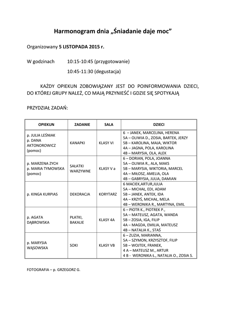 Harmonogram dnia „Śniadanie daje moc” Organizowany 5 LISTOPADA 2015 r. W godzinach 10:15-10:45 (przygotowanie) 10:45-11:30 (degustacja) KAŻDY OPIEKUN ZOBOWIĄZANY JEST DO POINFORMOWANIA DZIECI, DO KTÓREJ GRUPY NALEŻ, CO MAJĄ PRZYNIEŚĆ I GDZIE SIĘ SPOTYKAJĄ PRZYDZIAŁ ZADAŃ: OPIEKUN ZADANIE SALA p. JULIA LEŚNIAK p. DANA AKTONOROWICZ (pomoc) KANAPKI KLASY VI p. MARZENA ZYCH p. MARIA TYMOWSKA (pomoc) SAŁATKI WARZYWNE KLASY V a p. KINGA KURPIAS DEKORACJA KORYTARZ p. AGATA DĄBROWSKA PŁATKI, BAKALIE KLASY 4A p. MARYSIA WĄSOWSKA SOKI KLASY VB FOTOGRAFIA – p. GRZEGORZ G. DZIECI 6 – JANEK, MARCELINA, HERENA 5A – OLIWIA D., ZOSIA, BARTEK, JERZY 5B – KAROLINA, MAJA, WIKTOR 4A – JAGNA, POLA, KAROLINA 4B – MARYSIA, OLA, ALEK 6 – DORIAN, POLA, JOANNA 5A – OLIWIA R., ALA, MAKS 5B – MARYSIA, WIKTORIA, MARCEL 4A – MIŁOSZ, AMELIA, OLA 4B – GABRYSIA, JULIA, DAMIAN 6 MACIEK,ARTUR,JULIA 5A – MICHAŁ, EDI, ADAM 5B – JANEK, ANTEK, IDA 4A – KRZYŚ, MICHAŁ, MELA 4B – WERONIKA R., MARTYNA, EMIL 6 – PIOTR K., PIOTREK P., 5A – MATEUSZ, AGATA, WANDA 5B – ZOSIA, IGA, FILIP 4A – MAGDA, EMILIA, MATEUSZ 4B – NATALIA K., STAŚ 6 – ZUZIA, MARIANNA, 5A – SZYMON, KRZYSZTOF, FILIP 5B – WOJTEK, FRANEK, 4 A – MATEUSZ M., ARTUR 4 B - WERONIKA Ł., NATALIA O., ZOSIA S.