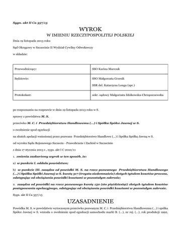 Sygn. akt II Ca 357/13 WYROK W IMIENIU RZECZYPOSPOLITEJ POLSKIEJ Dnia 19 listopada 2013 roku Sąd Okręgowy w Szczecinie II Wydział Cywilny Odwoławczy w składzie: Przewodniczący: SSO Karina Marczak Sędziowie: SSO Małgorzata Grzesik SSR del. Katarzyna Longa (spr.) Protokolant: sekr. sądowy Małgorzata Idzikowska-Chrząszczewska po rozpoznaniu na rozprawie w dniu 19 listopada 2013 roku w S. sprawy z powództwa M. S. przeciwko M. C. i Przedsiębiorstwu Handlowemu (...) i Spółka Spółce Jawnej w S. o zwolnienie spod egzekucji na skutek apelacji wniesionej przez pozwane Przedsiębiorstwo Handlowe (...) i Spółka Spółkę Jawną w S. od wyroku Sądu Rejonowego Szczecin - Prawobrzeże i Zachód w Szczecinie z dnia 17 stycznia 2013 r., sygn. akt I C 2010/11 1. zmienia zaskarżony wyrok w ten sposób, że: a) w punkcie I. oddala powództwo; b) w punkcie III. zasądza od powódki M. S. na rzecz pozwanego Przedsiębiorstwa Handlowego (...) i Spółka Spółki Jawnej w S. kwotę 317 (trzysta siedemnaście) złotych tytułem kosztów procesu, odstępując od obciążania powódki kosztami w pozostałym zakresie; 2. zasądza od powódki na rzecz pozwanego kwotę 150 (sto pięćdziesiąt) złotych tytułem kosztów postępowania apelacyjnego, odstępując od obciążania powódki kosztami w pozostałym zakresie. Sygn. akt II Ca 357/13 UZASADNIENIE Powódka M. S. w powództwie wytoczonym przeciwko pozwanym M. C. i Przedsiębiorstwu Handlowemu (...) i spółka Spółce Jawnej w S. wniosła o zwolnienie spod egzekucji samochodu marki B. (...), nr rej. (...), rok produkcji 1992, zajętego od M. C. przez Komornika Sądowego przy Sądzie Rejonowym Szczecin – Prawobrzeże i Zachód w Szczecinie w sprawie J. W. w sprawie Km 2783/10, Wyrokiem z dnia 17 stycznia 2013 r. Sąd Rejonowy Szczecin – Prawobrzeże i Zachód w Szczecinie w sprawie I C 2010/11 uwzględnił powództwo i zwolnił od egzekucji samochód marki B. (...), numer rejestracyjny (...), rok produkcji 1992, zajęty u dłużnika M. C. w dniu 24 stycznia 2011 r. przez Komornika Sądowego przy Sądzie Rejonowym Szczecin – Prawobrzeże i Zachód w Szczecinie w sprawie egzekucyjnej z wniosku pozwanego Przedsiębiorstwa Handlowego (...) i Spółka spółki jawnej z siedzibą w S. toczącego się pod sygn. akt II Km 10/02, nadto oddalił powództwo w odniesieniu do pozwanego M. C. i zasądził od pozwanego Przedsiębiorstwa Handlowego (...) i Spółka spółki jawnej w S. na rzecz powódki M. S. kwotę 125 zł tytułem zwrotu kosztów postępowania. Wobec tego, że pozwany M. C. nie ustosunkował się do żądania pozwu, wydany przeciwko niemu wyrok miał charakter zaoczny. Sąd Rejonowy rozstrzygnięcie oparł na następujących ustaleniach faktycznych: w sprawie egzekucyjnej toczącej się z wniosku Przedsiębiorstwa Handlowego (...) i s – ka Spółki Jawnej w S. przeciwko dłużnikowi M. C. prowadzonej pod Komornika Sądowego przy Sądzie Rejonowym Szczecin – Prawobrzeże i Zachód w Szczecinie J. W. w sprawie o sygn. akt Km 2783/10 w dniu 24 stycznia 2011 r. dokonano zajęcia samochodu marki B. (...), nr rej. (...), rok produkcji 1992. Pojazd oddano pod dozór dłużnika, pouczając o obowiązkach dozorcy. Wniosek o ujawnienie w ewidencji pojazdów zastrzeżenia komorniczego wpłynął do Urzędu Miejskiego w S. w dniu 31 stycznia 2011 roku i tego dnia został wprowadzony do systemu Centralnej Ewidencji Pojazdów. W dniu 01 września 2011 roku powódka M. S. zawarła z pozwanym M. C. umowę sprzedaży samochodu marki B. (...), nr rej. (...), rok produkcji 1992, ustalając cenę nabycia pojazdu na kwotę 2.500 zł. Sąd przyjął, że M. S. nabywając pojazd objęty powództwem nie wiedziała, ani na podstawie okoliczności towarzyszących transakcji nie mogła mieć podstaw by podejrzewać, iż M. C. nie jest osobą uprawnioną do zbycia pojazdu z uwagi na dokonane zajęcie komornicze. Nadto Sąd ustalił, że M. C. znał się z konkubentem powódki, R. R., ze środowiska motocyklistów (...) od 2009 roku. Spotykali się towarzysko bądź kontaktowali się za pośrednictwem Internetu, jednak nie była im znana sytuacja majątkowa M. C., a ponieważ pozwany jeździł terenowym samochodem i prowadził warsztat samochodowy, to R. R. oceniał, że nie miał problemów finansowych. Powódka rozmawiała z M. C. wyłącznie na tematy osobiste i słyszała, że pozwany zamierza otworzyć warsztat samochodowy w N.. Ponadto w 2009 roku M. C. naprawiał samochód powódki. Dodatkowo Sąd wskazał, że powódka nie przekazała M. C. pieniędzy z tytułu umowy sprzedaży samochodu marki B. (...), bowiem w zamian za uzyskanie własności pojazdu B. (...) M. S. sprzedała należący do niej pojazd matce M. C.. Był to pojazd o większej wartości, tj. wynoszącej około 7000 zł, jednak popsuty i niejeżdżący. M. C. deklarował, iż we własnym zakresie naprawi pojazd zbyty przez powódkę. Wedle wiedzy powódki i jej konkubenta naprawa zbywanego przez powódkę samochodu miała stanowić równowartość różnicy pomiędzy ceną nabycia przez powódkę pojazdu objętego powództwem a wartością pojazdu nabytego przez matkę M. C.. Sąd podniósł również, że nie doszło do przerejestrowania pojazdu, z uwagi na konieczność udania się do Ł., a był to czas kiedy powódka rozpoczynała nową pracę jako nauczycielka w gimnazjum i nie chciała korzystać z urlopu, ponadto postąpiła tak ze względów finansowych. W oparciu o te ustalenia, Sąd Rejonowy powództwo mające podstawę w przepisach art. 841 § 1 i 2 k.p.c. uznał za zasadne w odniesieniu do Przedsiębiorstwa Handlowego (...) i ska Spółki Jawnej w S., zaś niezasadne wobec pozwanego M. C.. Sąd wskazał, że podstawa do wytoczenia powództwa o zwolnienie zajętego przedmiotu spod egzekucji zachodzi wówczas, gdy w toku zajęcia zostały naruszone prawa osoby trzeciej, przy czym chodzi o naruszenie tego rodzaju, że doszło do zajęcia takiego składnika majątkowego, z któr