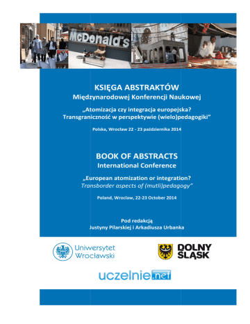 KSIĘGA ABSTRAKTÓW Międzynarodowej Konferencji Naukowej „Atomizacja tomizacja czy integracja europejska? Transgraniczność w perspektywie (wielo)pedagogiki” Polska, Wrocław 22 - 23 października 2014 BOOK OF ABSTRACTS International Conference „European atomization or integration? Transborder aspects of (mutli)pedagogy” Poland, Wroclaw, 22-23 October 2014 Pod redakcją Justyny Pilarskiej i Arkadiusza Urbanka KOMITET HONOROWY prof. zw. dr hab. Marek Bojarski Rektor Uniwersytetu Wrocławskiego prof. zw. dr hab. Stefan Lelental Uniwersytet Łódzki KOMITET NAUKOWY Przewodniczący: dr hab. Alicja Szerląg prof. UWr prof. dr hab. Piotr Stępniak CZŁONKOWIE: prof. dr Dieter Bingen Deutsches Polen-Institut in Darmstadt, Niemcy prof. dr hab. Bruno Drwęski Institut National des Langues et Civilisations Orientales prof. dr Vilija Grincevičienė Lietuvos Edukologijos Universitetas, Litwa prof. dr hab. Libertas Klimka Lietuvos Edukologijos Universitetas, Litwa prof. dr Dzemal Sokolvić University of Bergen, Bośnia i Hercegowina prof. dr hab. Vilija Targamadze Vilniaus Universitetas, Litwa prof. dr hab. Selim Chazbijewicz Uniwersytet Warmińsko-Mazurski, Polska prof. zw. dr hab. Stefan Lelental Uniwersytet Łódzki, Polska prof. zw. dr hab. Jerzy Nikitorowicz Zespół Pedagogiki Kultury i Edukacji Międzykulturowej KNP PAN, Polska prof. dr hab. Bartłomiej Nowotarski Uniwersytet Ekonomiczny, Polska prof. zw. dr hab. dr h.c. Andrzej J. Szwarc Polsko - Niemiecki Instytut Badawczy, Collegium Polonicum w Słubicach, Polska William Barylo École des Hautes Études en Sciences Sociales, Francja dr Ali Abi Issa Muzułmańskie Centrum Kulturalno – Oświatowe we Wrocławiu, Polska dr Eva Sidorenko University of Greenwich, Anglia prof. Slobodan Šoja były ambasador Bośni i Hercegowiny we Francji i w Egipcie dr hab. Tomasz Stefaniuk UMCS Lublin, ISNI, Polska dr Mariusz Turowski Uniwersytet Wrocławski, Uludağ Üniversitesi, ISNI, Polska/Turcja Przewodniczący: Członkowie: KOMITET ORGANIZACYJNY: dr Arkadiusz Urbanek dr Justyna Pilarska dr Małgorzata Prokosz mgr Anita Mencel mgr Agnieszka Kucofaj REDAKCJA Redakcja: dr Justyna Pilarska dr Arkadiusz Urbanek Redakcja techniczna: Henryk Batko, Magda Wieteska, Marcin Wilczek Recenzja i kwalifikacja wystąpień: dr hab. Alicja Szerląg prof. UWr, prof. dr hab. Piotr Stępniak Adres Redakcji: Zakład Pedagogiki Społecznej Instytutu Pedagogiki Uniwersytetu Wrocławskiego ul. Dawida 1, 52-527 Wrocław, tel. 71 367 20 01 ISBN 978-83-62618-07-1 2 Konferencja Atomizacja czy integracja europejska? Transgraniczność w perspektywie (wielo)pedagogiki została dofinansowana z budżetu Województwa Dolnośląskiego. The Conference “European atomization or integration? Transborder aspects of (mutli)pedagogy” has been co-funded by the Lower Silesian Voivodship. HONORARY PATRONAGE prof. zw. dr hab. Marek Bojarski Rector of the University of Wroclaw prof. zw. dr hab. Stefan Lelental Uniwersytet Łódzki SCIENTIFIC BOARD Przewodniczący: dr hab. Alicja Szerląg prof. UWr prof. dr hab. Piotr Stępniak MEMBERS: prof. dr Dieter Bingen Deutsches Polen-Institut in Darmstadt, Germany prof. dr hab. Bruno Drwęski Institut National des Langues et Civilisations Orientales prof. dr Vilija Grincevičienė Lietuvos Edukologijos Universitetas, Lithuania prof. dr hab. Libertas Klimka Lietuvos Edukologijos Universitetas, Lithuania prof. dr Dzemal Sokolvić University of Bergen, Norway/Bosnia and Herzegovina prof. dr hab. Vilija Targamadze Vilniaus Universitetas, Lithuania prof. dr hab. Selim Chazbijewicz Uniwersytet Warmińsko-Mazurski, Poland prof. zw. dr hab. Stefan Lelental Uniwersytet Łódzki, Polska prof. zw. dr hab. Jerzy Nikitorowicz Polish Academy of Sciences, Committee of Polish Sciences, Pedagogy of Culture and Intercultural Education prof. dr hab. Bartłomiej Nowotarski Uniwersytet Ekonomiczny, Poland prof. dr hab. dr h.c. Andrzej J. Szwarc Polish-German Research Institute Collegium Polonicum w Słubicach, Poland William Barylo École des Hautes Études en Sciences Sociales, France dr Ali Abi Issa Muslim Educational and Cultural Centre in Wroclaw, Poland dr Eva Sidorenko University of Greenwich, England prof. Slobodan Šoja former ambassador of Bosnia and Herzegovina to France and Egypt dr hab. Tomasz Stefaniuk UMCS Lublin, ISNI, Poland dr Mariusz Turowski Uniwersytet Wrocławski, Uludağ Üniversitesi, ISNI Head of the Organisation Board: Members: ORGANISATION BOARD: dr Arkadiusz Urbanek dr Justyna Pilarska dr Małgorzata Prokosz mgr Anita Mencel mgr Agnieszka Kucofaj EDITORS: dr Justyna Pilarska dr Arkadiusz Urbanek Proofreding: Henryk Batko, Magda Wieteska, Marcin Wilczek Review and acceptance of the papers: dr hab. Alicja Szerląg prof. UWr, prof. dr hab. Piotr Stępniak Adress of the editors: Zakład Pedagogiki Społecznej Instytutu Pedagogiki Uniwersytetu Wrocławskiego, ul. Dawida 1, 52-527 Wrocław, tel. 71 367 20 01 Editors: ISBN 978-83-62618-07-1 Konferencja Atomizacja czy integracja europejska? Transgraniczność w perspektywie (wielo)pedagogiki została dofinansowana z budżetu Województwa Dolnośląskiego. The Conference “European atomization or integration? Transborder aspects of (mutli)pedagogy” has been co-funded by the Lower Silesian Voivodship. 3 Cele naukowe międzynarodowej konferencji Różnice kulturowe stały się atrybutem codzienności człowieka współczesnego, postrzeganej zarówno z perspektywy indywidualnej, społecznej, państwowej, jak i ponadnarodowej, ponadpaństwowej czy europejskiej. Przeniknęły tym samym w znaczące dlań sfery życia, jeszcze bardziej niż dotąd, orientując na procesy radzenia sobie z nimi. Warto więc przedmiotem zainteresowania uczynić jakość uobecniania się różnic kulturowych w transgranicznej przestrzeni konceptualizowanej w szczególności przez atomizację i integrację, także w wymiarze Wspólnoty Europejskiej. Orientacja bowiem na społeczności funkcjonujące na obszarach transgrani