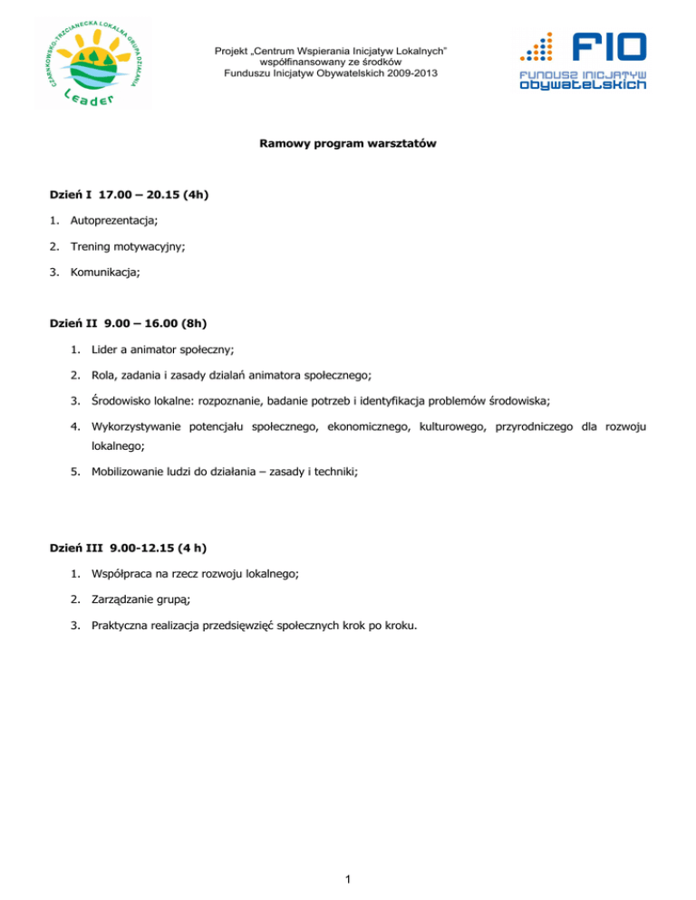 Projekt „Centrum Wspierania Inicjatyw Lokalnych” współfinansowany ze środków Funduszu Inicjatyw Obywatelskich 2009-2013 Ramowy program warsztatów Dzień I 17.00 – 20.15 (4h) 1. Autoprezentacja; 2. Trening motywacyjny; 3. Komunikacja; Dzień II 9.00 – 16.00 (8h) 1. Lider a animator społeczny; 2. Rola, zadania i zasady dzialań animatora społecznego; 3. Środowisko lokalne: rozpoznanie, badanie potrzeb i identyfikacja problemów środowiska; 4. Wykorzystywanie potencjału społecznego, ekonomicznego, kulturowego, przyrodniczego dla rozwoju lokalnego; 5. Mobilizowanie ludzi do działania – zasady i techniki; Dzień III 9.00-12.15 (4 h) 1. Współpraca na rzecz rozwoju lokalnego; 2. Zarządzanie grupą; 3. Praktyczna realizacja przedsięwzięć społecznych krok po kroku. 1