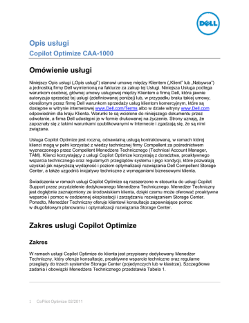 Opis usługi Copilot Optimize CAA-1000 Omówienie usługi Niniejszy Opis usługi („Opis usługi”) stanowi umowę między Klientem („Klient” lub „Nabywca”) a jednostką firmy Dell wymienioną na fakturze za zakup tej Usługi. Niniejsza Usługa podlega warunkom osobnej, głównej umowy usługowej między Klientem a firmą Dell, która jawnie autoryzuje sprzedaż tej usługi (zdefiniowanej poniżej) lub, w przypadku braku takiej umowy, określonym przez firmę Dell warunkom sprzedaży usług klientom komercyjnym, które są dostępne w witrynie internetowej www.Dell.com/Terms albo w dziale witryny www.Dell.com odpowiednim dla kraju Klienta. Warunki te są wcielone do niniejszego dokumentu przez odwołanie, a firma Dell udostępni je w formie drukowanej na życzenie. Strony uznają, że zapoznały się z takimi warunkami opublikowanymi w Internecie i zgadzają się, że są nimi związane. Usługa Copilot Optimize jest roczną, odnawialną usługą kontraktowaną, w ramach której klienci mogą w pełni korzystać z wiedzy technicznej firmy Compellent za pośrednictwem wyznaczonego przez Compellent Menedżera Technicznego (Technical Account Manager, TAM). Klienci korzystający z usługi Copilot Optimize korzystają z doradztwa, proaktywnego wsparcia technicznego oraz regularnych przeglądów systemu i jego kondycji, które pozwalają uzyskać jak najwyższą wydajność i poziom optymalizacji rozwiązania Dell Compellent Storage Center, a także uzgodnić inicjatywy techniczne z wymaganiami biznesowymi klienta. Świadczenia w ramach usługi Copilot Optimize są rozszerzone w stosunku do usługi Copilot Support przez przydzielenie dedykowanego Menedżera Technicznego. Menedżer Techniczny jest dogłębnie zaznajomiony ze środowiskiem klienta, dzięki czemu może oferować proaktywne wsparcie i pomoc w codziennej eksploatacji i zarządzaniu rozwiązaniem Storage Center. Ponadto, Menedżer Techniczny oferuje klientowi konsultacje zapewniające pomoc w długofalowym planowaniu i optymalizacji rozwiązania Storage Center. Zakres usługi Copilot Optimize Zakres W ramach usługi Copilot Optimize do klienta jest przypisany dedykowany Menedżer Techniczny, który oferuje konsultacje, proaktywne wsparcie techniczne oraz regularne przeglądy do trzech systemów Storage Center (pojedynczych lub w klastrze). Szczegółowe zadania i obowiązki Menedżera Technicznego przedstawia Tabela 1. 1 CoPilot Optimize 02/2011 Usługa Optimize jest świadczona przez okres nie dłuższy niż jeden rok, rozpoczynający się w chwili pierwszego kontaktu między Menedżerem Technicznym a Klientem. Usługę można odnawiać na kolejne lata. W ciągu roku można korzystać z usługi przez nie więcej niż 72 godziny. Usługę można rozszerzyć o dodatkowe godziny lub wsparcie dla dodatkowych systemów przez wykupienie pozycji nr CAA-1000 lub uzgodnienie z firmą Compellent rozszerzenia zakresu usługi. Zmiana zakresu będzie mieć wpływ na roczną opłatę za usługę Copilot Optimize. Świadczenia nieobjęte usługą Usługa Copilot Optimize nie zastępuje usługi serwisowej Copilot Support, która zapewnia wsparcie techniczne w przypadku awarii i problemów z systemem Storage Center i powiązanymi produktami Dell Compellent. Copilot Optimize jest kompleksową usługą spełniającą zapotrzebowanie klienta w zakresie krytycznego wsparcia technicznego, jednak nie obejmuje wszystkich cennych świadczeń oferowanych w ramach usług Copilot Consult, takich jak usługi relokacji, aktualizacji oprogramowania, planowania przywracania po awarii oraz replikowania instalacji. Elementy składowe usługi Copilot Optimize Klienci usługi Copilot Optimize mają stały kontakt w Menedżerem Technicznym, który jest doskonale zaznajomiony ze środowiskami pamięci masowej poszczególnych klientów. Dzięki ciągłemu monitorowaniu środowiska i przekazywaniu jego wyników klientom, Menedżer Techniczny dostarcza aktualne raporty, oceny i wskazówki, które pozwalają zredukować nakład pracy związany z administrowaniem i zapewnić wysoką dostępność i wydajność używanego rozwiązania SAN. Do Menedżera technicznego klient może również kierować wszelkie pytania dotyczące rozwiązania Storage Center. Poniżej przedstawiono podsumowanie usług oferowanych w ramach usługi Copilot Optimize: Tabela 1. Elementy składowe usługi Copilot Optimize Doradztwo 2 • Doradztwo w zakresie planowania architektury, konstruowania i eksploatacji wydajnych systemów Storage Center, które pomaga w projektowaniu środowiska Storage Center i zapewnieniu jego optymalnej wydajności • Pomoc w planowaniu i przygotowaniu modernizacji sprzętu i aktualizacji oprogramowania dla zagwarantowania bezproblemowej konserwacji • Dostarczanie wskazówek w zakresie wydajności eksploatacyjnej w celu maksymalizacji zwrotu z inwestycji (ROI) CoPilot Optimize 02/2011 Proaktywne wsparcie techniczne Przegląd kondycji (usługa Health Check) Przegląd efektywności i wydajności Przegląd przypadków 3 • Proaktywne, dedykowane i spersonalizowane wsparcie techniczne, które pozwala zminimalizować czynności diagnostyczne podczas konsultacji telefonicznych • Koordynacja z zespołem wsparcia technicznego Copilot dla zapewnienia szybkiego rozwiązywania problemów • Punkt eskalacji zgłoszeń wsparcia technicznego o poziomie ważności 1 i 2, zapewniający szybkie rozwiązywanie krytycznych problemów • Dostarczanie analizy historii zgłoszeń wsparcia technicznego, pozwalającej zidentyfikować trendy i regularności • Przygotowanie diagramu i oceny architektury systemu w celu zoptymalizowania architektury i konfiguracji systemu • Przeprowadzenie spotkań, których celem jest ocena i uzgodnienie środowiska rozwiązania Storage Center z wymaganiami i inicjatywami biznesowymi klienta • Analiza dzienników „Phone Home” bazy danych dla zapewnienia optymalnej wydajności i zarządzania rozwiązaniem Storage Center • Konsultacje w z