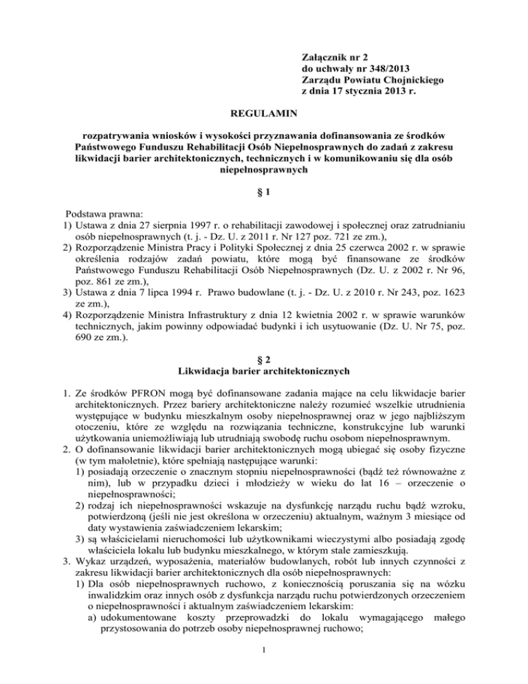 Załącznik nr 2 do uchwały nr 348/2013 Zarządu Powiatu Chojnickiego z dnia 17 stycznia 2013 r. REGULAMIN rozpatrywania wniosków i wysokości przyznawania dofinansowania ze środków Państwowego Funduszu Rehabilitacji Osób Niepełnosprawnych do zadań z zakresu likwidacji barier architektonicznych, technicznych i w komunikowaniu się dla osób niepełnosprawnych §1 Podstawa prawna: 1) Ustawa z dnia 27 sierpnia 1997 r. o rehabilitacji zawodowej i społecznej oraz zatrudnianiu osób niepełnosprawnych (t. j. - Dz. U. z 2011 r. Nr 127 poz. 721 ze zm.), 2) Rozporządzenie Ministra Pracy i Polityki Społecznej z dnia 25 czerwca 2002 r. w sprawie określenia rodzajów zadań powiatu, które mogą być finansowane ze środków Państwowego Funduszu Rehabilitacji Osób Niepełnosprawnych (Dz. U. z 2002 r. Nr 96, poz. 861 ze zm.), 3) Ustawa z dnia 7 lipca 1994 r. Prawo budowlane (t. j. - Dz. U. z 2010 r. Nr 243, poz. 1623 ze zm.), 4) Rozporządzenie Ministra Infrastruktury z dnia 12 kwietnia 2002 r. w sprawie warunków technicznych, jakim powinny odpowiadać budynki i ich usytuowanie (Dz. U. Nr 75, poz. 690 ze zm.). §2 Likwidacja barier architektonicznych 1. Ze środków PFRON mogą być dofinansowane zadania mające na celu likwidacje barier architektonicznych. Przez bariery architektoniczne należy rozumieć wszelkie utrudnienia występujące w budynku mieszkalnym osoby niepełnosprawnej oraz w jego najbliższym otoczeniu, które ze względu na rozwiązania techniczne, konstrukcyjne lub warunki użytkowania uniemożliwiają lub utrudniają swobodę ruchu osobom niepełnosprawnym. 2. O dofinansowanie likwidacji barier architektonicznych mogą ubiegać się osoby fizyczne (w tym małoletnie), które spełniają następujące warunki: 1) posiadają orzeczenie o znacznym stopniu niepełnosprawności (bądź też równoważne z nim), lub w przypadku dzieci i młodzieży w wieku do lat 16 – orzeczenie o niepełnosprawności; 2) rodzaj ich niepełnosprawności wskazuje na dysfunkcję narządu ruchu bądź wzroku, potwierdzoną (jeśli nie jest określona w orzeczeniu) aktualnym, ważnym 3 miesiące od daty wystawienia zaświadczeniem lekarskim; 3) są właścicielami nieruchomości lub użytkownikami wieczystymi albo posiadają zgodę właściciela lokalu lub budynku mieszkalnego, w którym stale zamieszkują. 3. Wykaz urządzeń, wyposażenia, materiałów budowlanych, robót lub innych czynności z zakresu likwidacji barier architektonicznych dla osób niepełnosprawnych: 1) Dla osób niepełnosprawnych ruchowo, z koniecznością poruszania się na wózku inwalidzkim oraz innych osób z dysfunkcja narządu ruchu potwierdzonych orzeczeniem o niepełnosprawności i aktualnym zaświadczeniem lekarskim: a) udokumentowane koszty przeprowadzki do lokalu wymagającego małego przystosowania do potrzeb osoby niepełnosprawnej ruchowo; 1 b) budowa pochylni i dojścia do budynku mieszkalnego, zapewniającego osobom niepełnosprawnym samodzielny dostęp do lokalu; c) zakup i montaż: podnośnika, platformy schodowej, transportera schodowego, windy przyściennej, innych urządzeń do transportu pionowego; d) opłaty poniesione z tytułu sporządzenia dokumentów stanowiących podstawę do wydania zgody na dopuszczenie do eksploatacji urządzenia, jeżeli konieczność uzyskania takiej zgody wynika z odrębnych przepisów; e) zakup i montaż poręczy i uchwytów w ciągach komunikacyjnych oraz uchwytów ułatwiających korzystanie z urządzeń higieniczno – sanitarnych; f) roboty polegające na: - likwidacji progów w miarę konieczności wymiana stolarki drzwiowej; - likwidacji zróżnicowania poziomu podłogi; g) przystosowanie drzwi: - zakup i montaż drzwi wejściowych o szerokości w świetle ościeżnicy co najmniej 90 cm, pozostałych co najmniej 80 cm; - zakup i montaż drzwi przesuwnych; - zakup i montaż systemu otwierania drzwi, w tym balkonowych, przyciskiem (dla wnioskodawców o niesprawnych rękach); - zakup i montaż zabezpieczenia drzwi (do wysokości 40 cm od podłogi) przed uszkodzeniami mechanicznymi i zainstalowanie ościeżnicy stalowej - wyłącznie wnioskodawcom poruszającym się na wózku inwalidzkim); - zakup i montaż okuć do drzwi balkonowych i okien umożliwiające ich samodzielną obsługę przez osobę poruszającą się na wózku inwalidzkim, zamieszkałą samotnie lub z osobą o takiej samej lub innej dysfunkcji narządu ruchu – gdy montaż okuć ze względu na stan techniczny okien i drzwi balkonowych jest możliwy - w kuchni i jednym pokoju, wybranym przez wnioskodawcę; - zakup i wymiana okien i drzwi balkonowych w przypadkach, o których mowa wyżej, gdy montaż okuć nie jest możliwy; h) wymiana wykładziny podłogowej (w miarę konieczności z podłożem, jeżeli stwarza trudności w poruszaniu); i) adaptacja pomieszczeń na pomieszczenia higieniczno – sanitarne poprzez dostosowanie do indywidualnych potrzeb wnioskodawcy; j) przystosowanie pomieszczeń higieniczno – sanitarnych do indywidualnych potrzeb wnioskodawcy; k) przystosowanie wyposażenia kuchni do samodzielnej obsługi przez osobę niepełnosprawną, w tym: - obniżenie i obudowanie zlewozmywaka oraz zakup i montaż niskich blatów, umożliwiające dojazd wózkiem inwalidzkim; - zakup i montaż ruchomych półek oraz pojemników na specjalnych prowadnicach; - zakup i montaż zawiasów umożliwiających otwieranie drzwiczek pod kątem większym niż 90° (do 170°); - zakup i montaż zatrzasków magnetycznych; l) zamianę lokalu mieszkalnego na lokal mieszkalny bez barier architektonicznych w przypadku, gdy likwidacja barier w dotychczasowym lokalu jest niemożliwa ze względów technicznych lub koszty likwidacji barier byłyby wyższe niż koszty zamiany lokalu. 2) Dla osób z dysfunkcją narządu wzroku: a) zakup i montaż poręczy i uchwytów w ciągach komunikacyjnych oraz uchwytów ułatwiających korzystanie z urządzeń higieniczno – sanitarnych; b) roboty polegające na: - likwidacji pr