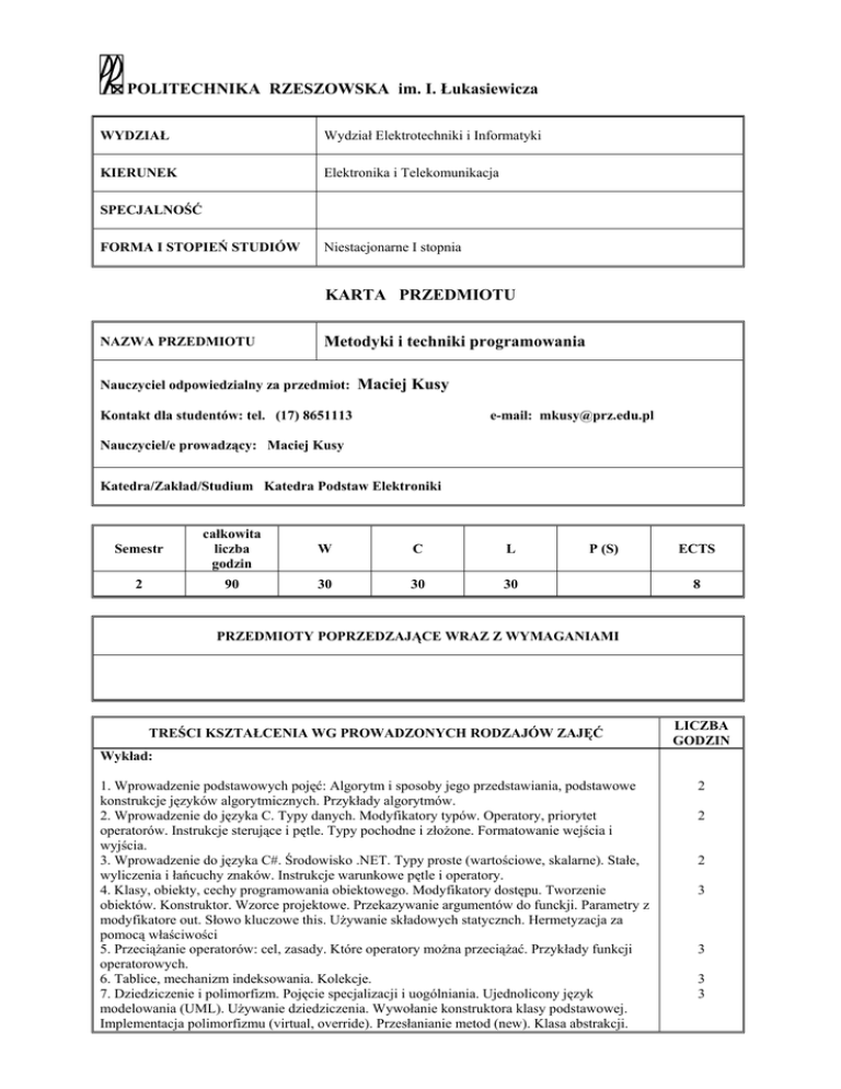 POLITECHNIKA RZESZOWSKA im. I. Łukasiewicza WYDZIAŁ Wydział Elektrotechniki i Informatyki KIERUNEK Elektronika i Telekomunikacja SPECJALNOŚĆ FORMA I STOPIEŃ STUDIÓW Niestacjonarne I stopnia KARTA PRZEDMIOTU NAZWA PRZEDMIOTU Metodyki i techniki programowania Nauczyciel odpowiedzialny za przedmiot: Maciej Kusy Kontakt dla studentów: tel. (17) 8651113 e-mail: [email protected] Nauczyciel/e prowadzący: Maciej Kusy Katedra/Zakład/Studium Katedra Podstaw Elektroniki Semestr całkowita liczba godzin W C L 2 90 30 30 30 P (S) ECTS 8 PRZEDMIOTY POPRZEDZAJĄCE WRAZ Z WYMAGANIAMI TREŚCI KSZTAŁCENIA WG PROWADZONYCH RODZAJÓW ZAJĘĆ LICZBA GODZIN Wykład: 1. Wprowadzenie podstawowych pojęć: Algorytm i sposoby jego przedstawiania, podstawowe konstrukcje języków algorytmicznych. Przykłady algorytmów. 2. Wprowadzenie do języka C. Typy danych. Modyfikatory typów. Operatory, priorytet operatorów. Instrukcje sterujące i pętle. Typy pochodne i złożone. Formatowanie wejścia i wyjścia. 3. Wprowadzenie do języka C#. Środowisko .NET. Typy proste (wartościowe, skalarne). Stałe, wyliczenia i łańcuchy znaków. Instrukcje warunkowe pętle i operatory. 4. Klasy, obiekty, cechy programowania obiektowego. Modyfikatory dostępu. Tworzenie obiektów. Konstruktor. Wzorce projektowe. Przekazywanie argumentów do funckji. Parametry z modyfikatore out. Słowo kluczowe this. Używanie składowych statycznch. Hermetyzacja za pomocą właściwości 5. Przeciążanie operatorów: cel, zasady. Które operatory można przeciążać. Przykłady funkcji operatorowych. 6. Tablice, mechanizm indeksowania. Kolekcje. 7. Dziedziczenie i polimorfizm. Pojęcie specjalizacji i uogólniania. Ujednolicony język modelowania (UML). Używanie dziedziczenia. Wywołanie konstruktora klasy podstawowej. Implementacja polimorfizmu (virtual, override). Przesłanianie metod (new). Klasa abstrakcji. 2 2 2 3 3 3 3 Klasa Object. Klasy uniwersalne. 8. Pojęcie interfejsu. Definiowanie i implementowanie interfejsu. Obsługa kilku interfejsów. Łączenie i rozszerzanie interfejsów Dostęp do metod interfejsu. Rzutowanie na interfejs. Operator is i operator as. Interfejs kontra klasy abstrakcyjne. Przesłanianie implementacji interfejsu. Jawna implementacja interfejsu. 9. Obsługa wyjątków. Pojęcie wyjątku i sytuacji wyjątkowej. Strukturalna obsługa wyjątków. Zgłaszanie wyjątków. Przechwytywanie wyjątków. Własne niestandardowe wyjątki. 10. Strumienie. Serializacja. Praca z formatem XML w technologii .NET. 11. Delegacje i zdarzenia 3 3 3 3 Ćwiczenia: 1. Algorytmy, podstawowe konstrukcje, schematy blokowe. 2. Metody reprezentowania informacji (reprezentacje liczb). 3. Rekurencja. 4. Implementacja dynamicznych struktur danych: stos, kolejka, lista jedno i dwu-kierunkowa. Laboratorium: 1. Zajęcia wprowadzające. Zapoznanie się ze programistycznym środowiskiem pracy. 2. Tworzenie projektu. Zastosowanie instrukcji sterujących i pętli. Implementacja algorytmów, struktór danych przedstawionych na ćwiczeniach w języku C. 3. Język C#. Definiowanie klas, metod, właściwości. Interfejs. 4. Dziedziczenie i polimorfizm. 5. Stworzenie aplikacji okienkowej - interakcja z użytkownikiem. 10 6 4 10 3 3 6 3 15 Dyżury dydaktyczne (konsultacje): w terminach podanych w harmonogramie pracy jednostki EFEKTY KSZTAŁCENIA - UMIEJĘTNOŚCI KSZTAŁCENIA Student powinien posiąść podstawową wiedzę z zakresu języka C, algorytmiki, metod reprezentowania informacji, implementacji dynamicznych struktur danych. Dodatkowo, student powinien sprawnie poruszać się w środowisku programistycznym Visual Studio 2008, programować w języku C# oraz tworzyć aplikacje z graficznym interfejsem użytkownika FORMA I WARUNKI ZALICZENIA PRZEDMIOTU (RODZAJU ZAJĘĆ) Laboratorium: średnia ocen za opracowane programy i odpowiedzi ustne na poszczególnych zajęciach. Ćwiczenia: na podstawie sprawdzianu wiadomości. Wykład: egzamin w formie testu i zadań. WYKAZ LITERATURY PODSTAWOWEJ Chłosta P.: „Aplikacje Windows Forms .Net w C#”, Wydawnictwo naukowe PWN, 2006. Cormen T. H., Leiserson Ch. E., Rivest R. L., Stein C.: „Wprowadzenie do algorytmów”, WNT, Warszawa, 2004. Grębosz J.: „Symfonia C++ standard. Programowanie w języku C++ orientowane obiektowo”, EDITION 2000, Kraków, 2005. Grębosz J.: „Pasja C++”, tom1, tom2, Oficyna Kalimach, Kraków, 1997. Gurbiel E., Hardt-Olejniczak G., Kołczyk E., Krupicka H., Sysło M. M.: „Informatyka. Podręcznik dla liceum ogólnokształcącego, cz. 1, cz.2”, WSIP, Warszawa, 2002. Kernighan Brian W., Ritchie Dennis M.: „Język ANSI C”, WNT, Warszawa, 1994. Liberty J.: „C#. Programowanie”, O’REILLY®, Helion, 2006. Lis M.: „C#. Praktyczny kurs”, Helion 2007. Matulewski J.: „C#3.0 i .NET 3.5. Technologia LINQ”, Helion, 2008. Microsoft Visual C# 2005 Express Edition: „Projektuj sam”, Edycja polska Microsoft Press, Warszawa 2006. Powers L., Snell M.: „Microsoft Visual Studio 2008 – KSIĘGA EKSPERTA”, Helion, 2009. Perry S.C.: „C# i .NET”, Prentice Hall, Helion, 2006. Troelsen A.: „Język C# 2008 i platforma .NET 3.5”, Wydawnictwo naukowe PWN SA, 2009. WYKAZ LITERATURY UZUPEŁNIAJĄCEJ Gamma E., Heml R., Johnson R., Vlissides J.: „Design Patterns. Elements of Reusable Object-Oriented Software”, Addison Wesley, 2000. Włodarczyk M.: „Programowanie obiektowe”, ITA-105 Programowanie obiektowe, 2009. Podpis nauczyciela odpowiedzialnego za przedmiot Podpis kierownika (zakładu/studium) katedry Data i podpis dziekana właściwego wydziału