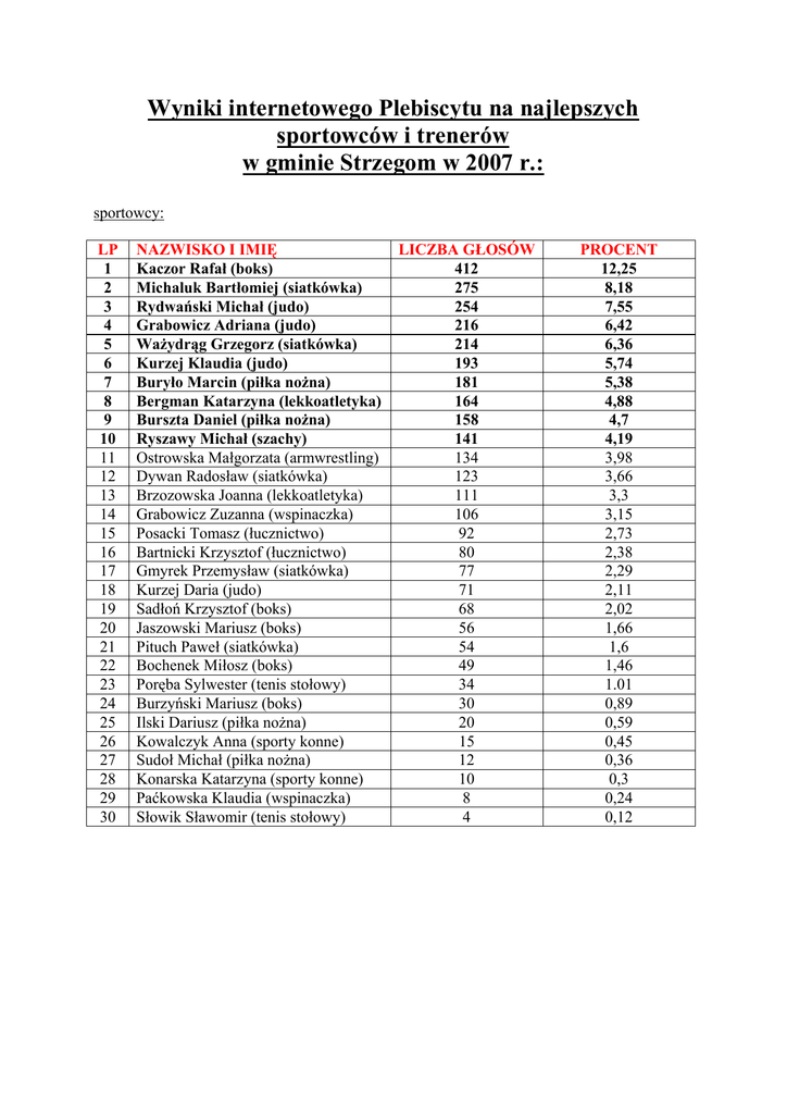 Wyniki internetowego Plebiscytu na najlepszych sportowców i trenerów w gminie Strzegom w 2007 r.: sportowcy: LP 1 2 3 4 5 6 7 8 9 10 11 12 13 14 15 16 17 18 19 20 21 22 23 24 25 26 27 28 29 30 NAZWISKO I IMIĘ Kaczor Rafał (boks) Michaluk Bartłomiej (siatkówka) Rydwański Michał (judo) Grabowicz Adriana (judo) Ważydrąg Grzegorz (siatkówka) Kurzej Klaudia (judo) Buryło Marcin (piłka nożna) Bergman Katarzyna (lekkoatletyka) Burszta Daniel (piłka nożna) Ryszawy Michał (szachy) Ostrowska Małgorzata (armwrestling) Dywan Radosław (siatkówka) Brzozowska Joanna (lekkoatletyka) Grabowicz Zuzanna (wspinaczka) Posacki Tomasz (łucznictwo) Bartnicki Krzysztof (łucznictwo) Gmyrek Przemysław (siatkówka) Kurzej Daria (judo) Sadłoń Krzysztof (boks) Jaszowski Mariusz (boks) Pituch Paweł (siatkówka) Bochenek Miłosz (boks) Poręba Sylwester (tenis stołowy) Burzyński Mariusz (boks) Ilski Dariusz (piłka nożna) Kowalczyk Anna (sporty konne) Sudoł Michał (piłka nożna) Konarska Katarzyna (sporty konne) Paćkowska Klaudia (wspinaczka) Słowik Sławomir (tenis stołowy) LICZBA GŁOSÓW 412 275 254 216 214 193 181 164 158 141 134 123 111 106 92 80 77 71 68 56 54 49 34 30 20 15 12 10 8 4 PROCENT 12,25 8,18 7,55 6,42 6,36 5,74 5,38 4,88 4,7 4,19 3,98 3,66 3,3 3,15 2,73 2,38 2,29 2,11 2,02 1,66 1,6 1,46 1.01 0,89 0,59 0,45 0,36 0,3 0,24 0,12 trenerzy: LP 1 2 3 5 6 7 8 9 10 11 12 NAZWISKO I IMIĘ LICZBA GŁOSÓW Dziemiańczuk Zbigniew (siatkówka) 485 Chabierski Czesław (tenis stołowy) 341 Gołębiowski Zdzisław (piłka nożna) 251 Grabowicz Robert (wspinaczka) 251 Kaczor Zenon (boks) 247 Kotowicz Robert (siatkówka) 222 Konarski Marcin (sporty konne) 189 Ostrowski Robert (armwrestling) 165 Skórkowski Tomasz (judo) 149 Hajduk Kazimierz (lekkoatletyka) 143 Zięcina Janina (łucznictwo) 43 Kosiński Ignacy (szachy) 39 PROCENT 19,2 13,5 9,94 9,94 9,78 8,79 7,48 6,53 5,9 5,66 1,7 1,54