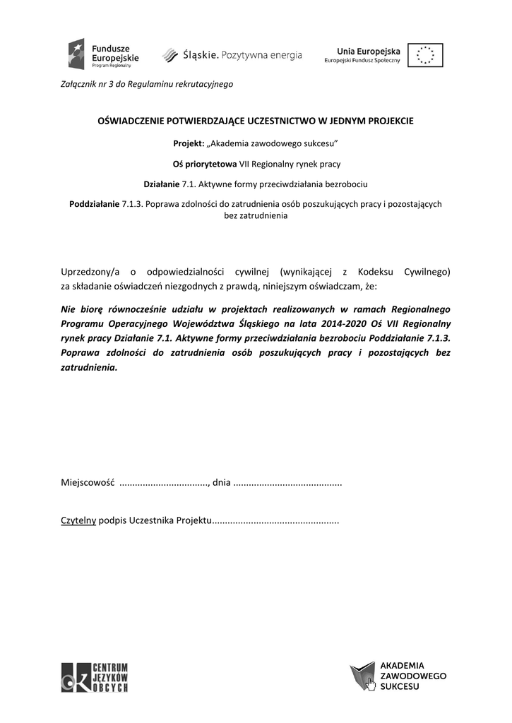 Załącznik nr 3 do Regulaminu rekrutacyjnego OŚWIADCZENIE POTWIERDZAJĄCE UCZESTNICTWO W JEDNYM PROJEKCIE Projekt: „Akademia zawodowego sukcesu” Oś priorytetowa VII Regionalny rynek pracy Działanie 7.1. Aktywne formy przeciwdziałania bezrobociu Poddziałanie 7.1.3. Poprawa zdolności do zatrudnienia osób poszukujących pracy i pozostających bez zatrudnienia Uprzedzony/a o odpowiedzialności cywilnej (wynikającej z Kodeksu za składanie oświadczeń niezgodnych z prawdą, niniejszym oświadczam, że: Cywilnego) Nie biorę równocześnie udziału w projektach realizowanych w ramach Regionalnego Programu Operacyjnego Województwa Śląskiego na lata 2014-2020 Oś VII Regionalny rynek pracy Działanie 7.1. Aktywne formy przeciwdziałania bezrobociu Poddziałanie 7.1.3. Poprawa zdolności do zatrudnienia osób poszukujących pracy i pozostających bez zatrudnienia. Miejscowość .................................., dnia .......................................... Czytelny podpis Uczestnika Projektu.................................................