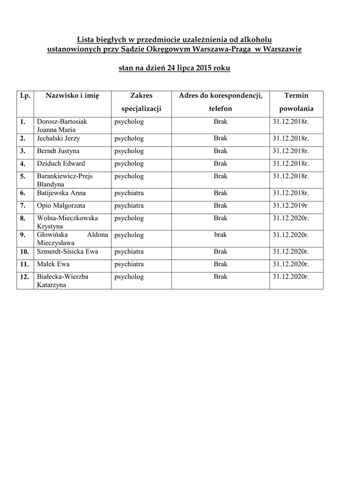 Lista biegłych w przedmiocie uzależnienia od alkoholu ustanowionych przy Sądzie Okręgowym Warszawa-Praga w Warszawie stan na dzień 24 lipca 2015 roku Lp. Nazwisko i imię Zakres Adres do korespondencji, Termin specjalizacji telefon powołania psycholog Brak 31.12.2018r. 2. Dorosz-Bartosiak Joanna Maria Jechalski Jerzy psycholog Brak 31.12.2018r. 3. Berndt Justyna psycholog Brak 31.12.2018r. 4. Dziduch Edward psycholog Brak 31.12.2018r. 5. psycholog Brak 31.12.2018r. 6. Barankiewicz-Prejs Blandyna Batijewska Anna psychiatra Brak 31.12.2018r. 7. Opio Małgorzata psychiatra Brak 31.12.2019r 8. Brak 31.12.2020r. brak 31.12.2020r. 10. Wolna-Mieczkowska psycholog Krystyna Głowińska Aldona psycholog Mieczysława Szmerdt-Sisicka Ewa psychiatra Brak 31.12.2020r. 11. Małek Ewa psychiatra Brak 31.12.2020r. 12. Białecka-Wierzba Katarzyna psycholog Brak 31.12.2020r. 1. 9.