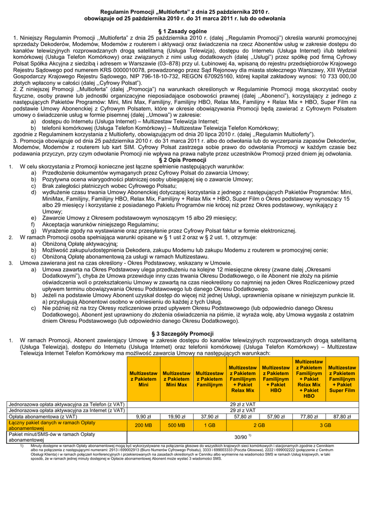 Regulamin Promocji „Multioferta” z dnia 25 października 2010 r. obowiązuje od 25 października 2010 r. do 31 marca 2011 r. lub do odwołania § 1 Zasady ogólne 1. Niniejszy Regulamin Promocji ,,Multioferta” z dnia 25 października 2010 r. (dalej ,,Regulamin Promocji”) określa warunki promocyjnej sprzedaży Dekoderów, Modemów, Modemów z routerem i aktywacji oraz świadczenia na rzecz Abonentów usług w zakresie dostępu do kanałów telewizyjnych rozprowadzanych drogą satelitarną (Usługa Telewizja), dostępu do Internetu (Usługa Internet) i/lub telefonii komórkowej (Usługa Telefon Komórkowy) oraz związanych z nimi usług dodatkowych (dalej ,,Usługi”) przez spółkę pod firmą Cyfrowy Polsat Spółka Akcyjna z siedzibą i adresem w Warszawie (03–878) przy ul. Łubinowej 4a, wpisaną do rejestru przedsiębiorców Krajowego Rejestru Sądowego pod numerem KRS 0000010078, prowadzonego przez Sąd Rejonowy dla miasta stołecznego Warszawy, XIII Wydział Gospodarczy Krajowego Rejestru Sądowego, NIP 796-18-10-732, REGON 670925160, której kapitał zakładowy wynosi: 10 733 000,00 złotych wpłacony w całości (dalej ,,Cyfrowy Polsat”). 2. Z niniejszej Promocji ,,Multioferta” (dalej „Promocja”) na warunkach określonych w Regulaminie Promocji mogą skorzystać osoby fizyczne, osoby prawne lub jednostki organizacyjne nieposiadające osobowości prawnej (dalej ,,Abonenci”), korzystający z jednego z następujących Pakietów Programów: Mini, Mini Max, Familijny, Familijny HBO, Relax Mix, Familijny + Relax Mix + HBO, Super Film na podstawie Umowy Abonenckiej z Cyfrowym Polsatem, które w okresie obowiązywania Promocji będą zawierać z Cyfrowym Polsatem umowy o świadczenie usług w formie pisemnej (dalej ,,Umowa”) w zakresie: a) dostępu do Internetu (Usługa Internet) – Multizestaw Telewizja Internet; b) telefonii komórkowej (Usługa Telefon Komórkowy) – Multizestaw Telewizja Telefon Komórkowy; zgodnie z Regulaminem korzystania z Multioferty, obowiązującym od dnia 20 lipca 2010 r. (dalej ,,Regulamin Multioferty”). 3. Promocja obowiązuje od dnia 25 października 2010 r. do 31 marca 2011 r. albo do odwołania lub do wyczerpania zapasów Dekoderów, Modemów, Modemów z routerem lub kart SIM. Cyfrowy Polsat zastrzega sobie prawo do odwołania Promocji w każdym czasie bez podawania przyczyn, przy czym odwołanie Promocji nie wpływa na prawa nabyte przez uczestników Promocji przed dniem jej odwołania. § 2 Opis Promocji 1. W celu skorzystania z Promocji konieczne jest łączne spełnienie następujących warunków: a) Przedłożenie dokumentów wymaganych przez Cyfrowy Polsat do zawarcia Umowy; b) Pozytywna ocena wiarygodności płatniczej osoby ubiegającej się o zawarcie Umowy; c) Brak zaległości płatniczych wobec Cyfrowego Polsatu; d) wydłużenie czasu trwania Umowy Abonenckiej dotyczącej korzystania z jednego z następujących Pakietów Programów: Mini, MiniMax, Familijny, Familijny HBO, Relax Mix, Familijny + Relax Mix + HBO, Super Film o Okres podstawowy wynoszący 15 albo 29 miesięcy i korzystanie z posiadanego Pakietu Programów nie krócej niż przez Okres podstawowy, wynikający z Umowy; e) Zawarcie Umowy z Okresem podstawowym wynoszącym 15 albo 29 miesięcy; f) Akceptacja warunków niniejszego Regulaminu; g) Wyrażenie zgody na wystawianie oraz przesyłanie przez Cyfrowy Polsat faktur w formie elektronicznej. 2. W ramach Promocji osoba spełniająca warunki opisane w § 1 ust 2 oraz w § 2 ust. 1, otrzymuje: a) Obniżoną Opłatę aktywacyjną; b) Możliwość zakupu/udostępnienia Dekodera, zakupu Modemu lub zakupu Modemu z routerem w promocyjnej cenie; c) Obniżoną Opłatę abonamentową za usługi w ramach Multizestawu. 3. Umowa zawierana jest na czas określony - Okres Podstawowy, wskazany w Umowie. a) Umowa zawarta na Okres Podstawowy ulega przedłużeniu na kolejne 12 miesięczne okresy (zwane dalej „Okresami Dodatkowymi”), chyba że Umowa przewiduje inny czas trwania Okresu Dodatkowego, o ile Abonent nie złoży na piśmie oświadczenia woli o przekształceniu Umowy w zawartą na czas nieokreślony co najmniej na jeden Okres Rozliczeniowy przed upływem terminu obowiązywania Okresu Podstawowego lub danego Okresu Dodatkowego. b) Jeżeli na podstawie Umowy Abonent uzyskał dostęp do więcej niż jednej Usługi, uprawnienia opisane w niniejszym punkcie lit. a) przysługują Abonentowi osobno w odniesieniu do każdej z tych Usług. c) Nie później niż na trzy Okresy rozliczeniowe przed upływem Okresu Podstawowego (lub odpowiednio danego Okresu Dodatkowego), Abonent jest uprawniony do złożenia oświadczenia na piśmie, iż wyraża wolę, aby Umowa wygasła z ostatnim dniem Okresu Podstawowego (lub odpowiednio danego Okresu Dodatkowego). 1. § 3 Szczegóły Promocji W ramach Promocji, Abonent zawierający Umowę w zakresie dostępu do kanałów telewizyjnych rozprowadzanych drogą satelitarną (Usługa Telewizja), dostępu do Internetu (Usługa Internet) oraz telefonii komórkowej (Usługa Telefon Komórkowy) – Multizestaw Telewizja Internet Telefon Komórkowy ma możliwość zawarcia Umowy na następujących warunkach: Multizestaw z Pakietem Mini Jednorazowa opłata aktywacyjna za Telefon (z VAT) Jednorazowa opłata aktywacyjna za Internet (z VAT) Opłata abonamentowa (z VAT) Łączny pakiet danych w ramach Opłaty abonamentowej Pakiet minut/SMS-ów w ramach Opłaty abonamentowej 1) Multizestaw z Pakietem Mini Max Multizestaw z Pakietem Familijnym 9,90 zł 19,90 zł 37,90 zł 200 MB 500 MB 1 GB Multizestaw z Pakietem Familijnym + Pakiet Relax Mix Multizestaw z Pakietem Familijnym + Pakiet HBO Multizestaw z Pakietem Familijnym + Pakiet Relax Mix + Pakiet HBO Multizestaw z Pakietem Familijnym + Pakiet Super Film 29 zł z VAT 29 zł z VAT 57,80 zł 57,90 zł 77,80 zł 87,80 zł 2 GB 30/90 3 GB 1) Minuty dostępne w ramach Opłaty abonamentowej mogą być wykorzystywane na połączenia głosowe do wszystkich kr