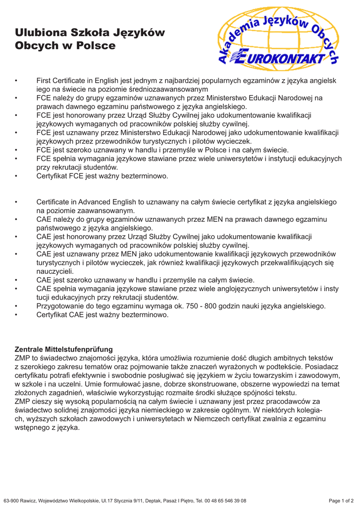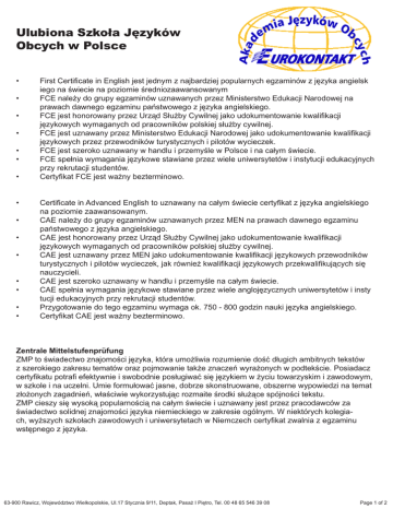 Ulubiona Szkoła Języków Obcych w Polsce • • • • • • • First Certificate in English jest jednym z najbardziej popularnych egzaminów z języka angielsk iego na świecie na poziomie średniozaawansowanym FCE należy do grupy egzaminów uznawanych przez Ministerstwo Edukacji Narodowej na prawach dawnego egzaminu państwowego z języka angielskiego. FCE jest honorowany przez Urząd Służby Cywilnej jako udokumentowanie kwalifikacji językowych wymaganych od pracowników polskiej służby cywilnej. FCE jest uznawany przez Ministerstwo Edukacji Narodowej jako udokumentowanie kwalifikacji językowych przez przewodników turystycznych i pilotów wycieczek. FCE jest szeroko uznawany w handlu i przemyśle w Polsce i na całym świecie. FCE spełnia wymagania językowe stawiane przez wiele uniwersytetów i instytucji edukacyjnych przy rekrutacji studentów. Certyfikat FCE jest ważny bezterminowo. • • • • • • • • Certificate in Advanced English to uznawany na całym świecie certyfikat z języka angielskiego na poziomie zaawansowanym. CAE należy do grupy egzaminów uznawanych przez MEN na prawach dawnego egzaminu państwowego z języka angielskiego. CAE jest honorowany przez Urząd Służby Cywilnej jako udokumentowanie kwalifikacji językowych wymaganych od pracowników polskiej służby cywilnej. CAE jest uznawany przez MEN jako udokumentowanie kwalifikacji językowych przewodników turystycznych i pilotów wycieczek, jak również kwalifikacji językowych przekwalifikujących się nauczycieli. CAE jest szeroko uznawany w handlu i przemyśle na całym świecie. CAE spełnia wymagania językowe stawiane przez wiele anglojęzycznych uniwersytetów i insty tucji edukacyjnych przy rekrutacji studentów. Przygotowanie do tego egzaminu wymaga ok. 750 - 800 godzin nauki języka angielskiego. Certyfikat CAE jest ważny bezterminowo. Zentrale Mittelstufenprüfung ZMP to świadectwo znajomości języka, która umożliwia rozumienie dość długich ambitnych tekstów z szerokiego zakresu tematów oraz pojmowanie także znaczeń wyrażonych w podtekście. Posiadacz certyfikatu potrafi efektywnie i swobodnie posługiwać się językiem w życiu towarzyskim i zawodowym, w szkole i na uczelni. Umie formułować jasne, dobrze skonstruowane, obszerne wypowiedzi na temat złożonych zagadnień, właściwie wykorzystując rozmaite środki służące spójności tekstu. ZMP cieszy się wysoką popularnością na całym świecie i uznawany jest przez pracodawców za świadectwo solidnej znajomości języka niemieckiego w zakresie ogólnym. W niektórych kolegiach, wyższych szkołach zawodowych i uniwersytetach w Niemczech certyfikat zwalnia z egzaminu wstępnego z języka. 63-900 Rawicz, Województwo Wielkopolskie, Ul.17 Stycznia 9/11, Deptak, Pasaż I Piętro, Tel. 00 48 65 546 39 08 Page 1 of 2 Ulubiona Szkoła Języków Obcych w Polsce Zertifikat Deutsch Pozytywny wynik egzaminu Zertifikat Deutsch (ZD) świadczy o solidnych podstawach znajomości języka potocznego, umożliwiających porozumiewanie się we wszystkich ważnych sytuacjach życia codziennego. Dyplom ZD znany jest na całym świecie i stanowi świadectwo, że legitymująca się nim osoba opanowała najważniejsze struktury gramatyczne i jest w stanie zrozumieć rozmowę na tematy z życia codziennego i w niej uczestniczyć. Potrafi ona również przedstawić proste fakty w formie ustnej i pisemnej oraz zrozumieć teksty poświęcone tematyce z życia codziennego. Kurs przygotowujący do matury Jest to kurs dla osób pragnących przygotować się do nowej matury na poziomie podstawowym i rozszerzonym. Kurs obejmuje przygotowanie do matury zarówno ustnej jak i pisemnej. Słuchacze skupiają się wyłącznie na zadaniach maturalnych, przerabiają zestawy wszystkich możliwych ćwiczeń i tematów. Pogłębiają swoją wiedzę z zakresu gramatyki, słownictwa, idiomów, itp. W razie potrzeby mają możliwość skorzystania z fachowych rad naszech lektorów. Celem kursu przygotowującego do matury pisemnej jest: • Ćwiczenie różnych form wypowiedzi pisemnej wymaganych na egzaminie maturalnym, • Powtórzenie i utrwalenie poznanych struktur gramatycznych, idiomów, • Doskonalenie umiejętności czytania i słuchania ze zrozumieniem Celem kursu przygotowującego do matury ustnej jest: • Poszerzenie zasobu słownictwa • Doskonalenie umiejętności wypowiadania się na różne tematy z użyciem znanych i nowo poznanych struktur gramatycznych, słownictwa, idiomów (relacjonowanie wydarzeń, uzyski wanie/udzielanie informacji, argumentowanie opinii własnych, itp.) Kurs prowadzony jest na następujących poziomach: • Podstawowy ustny i pisemny • Rozszerzony ustny i pisemny 63-900 Rawicz, Województwo Wielkopolskie, Ul.17 Stycznia 9/11, Deptak, Pasaż I Piętro, Tel. 00 48 65 546 39 08 Page 2 of 2