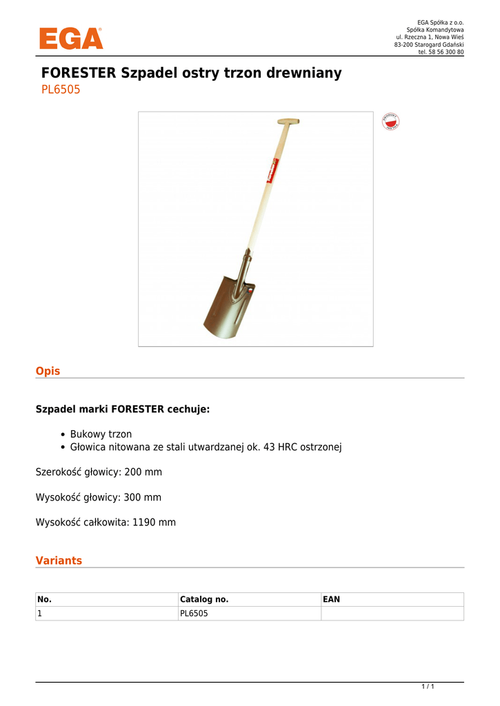EGA Spółka z o.o. Spółka Komandytowa ul. Rzeczna 1, Nowa Wieś 83-200 Starogard Gdański tel. 58 56 300 80 FORESTER Szpadel ostry trzon drewniany PL6505 Opis Szpadel marki FORESTER cechuje: Bukowy trzon Głowica nitowana ze stali utwardzanej ok. 43 HRC ostrzonej Szerokość głowicy: 200 mm Wysokość głowicy: 300 mm Wysokość całkowita: 1190 mm Variants No. Catalog no. 1 PL6505 EAN 1/1 Powered by TCPDF (www.tcpdf.org)