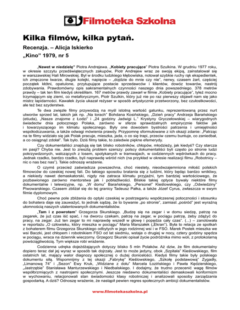 Kilka filmów, kilka pyta. Recenzja. – Alicja Iskierko „Kino” 1979, nr 5 „Nawet w niedziel” Piotra Andrejewa. „Kobiety pracujce” Piotra Szulkina. W grudniu 1977 roku, w okresie szczytu przedwitecznych zakupów, Piotr Andrejew wraz ze swoj ekip, zainstalowa si w warszawskiej Hali Mirowskiej. By w rodku ludzkiego kbowiska, notowa szybkie ruchy rk ekspedientek, ich zmczone twarze, dugie kolejki, napicie – „dojdzie do mnie czy nie”, nerwy, czasem art, czciej pocztek kótni, opatulone, przytupujce postacie sprzedawców i klientów, dowóz towarów, nastrój zdobywania. Prawdomówny opis sakramentalnych czynnoci naszego dnia powszedniego. 378 metrów prawdy – tak ten film kiedy okreliam. 167 metrów prawdy zawar w filmie „Kobiety pracujce”, tyle mocno trzymajcym si ziemi, co metaforycznym, Piotr Szulkin, który ju nie po raz pierwszy objawi nam si jako mistrz lapidarnoci. Kawaek ycia ukaza reyser w sposób artystycznie przetworzony, bez czuostkowoci, ale te bez szyderstwa. Te dwa zwize filmy przywodz na myl istotn warto gatunku, reprezentowan przez nurt utworów sprzed lat, takich jak np. „Na torach” Bohdana Kosiskiego, „Dzie pracy” Andrzeja Baraskiego (etiuda), „Nasze znajome z odzi” i „24 godziny Jadwigi L.” Krystyny Gryczeowskiej – wiarygodnych wiadectw dnia potocznego Polaka, zarówno w sferze sprawdzalnych empirycznie faktów jak i towarzyszcego im klimatu spoecznego. Byy one dowodem bystroci patrzenia i umiejtnoci wspóodczuwania, a take odwagi mówienia prawdy. Przypomn sformuowane z ich okazji zdanie: „Patrzc na te filmy widziao si jak Polak pracuje, mieszka, jada, o co si trapi, przeciw czemu buntuje, co zaniedba, a co osign zdoa”. Tak byo. Dzi filmy takie, to zaledwie pikne efemerydy. Czy dokumentalici znajduj si tak blisko robotników, chopów, modziey, jak kiedy? Czy starcza im pasji? Chyba nie. Jest to zreszt problem szerszy: polscy dokumentalici byli czsto po stronie ludzi pokrzywdzonych, walczcych z losem, spotykanych w tramwajach, w codziennych wdrówkach do pracy. Jednak rzadko, bardzo rzadko, byli naprawd wród nich (na przykad w okresie realizacji filmu „Robotnicy – nic o nas bez nas”). Takie odnosz wraenie. O czym przecie zawiadcza powszechna, cho niestety, nieodwzajemniona mio polskich filmowców do czeskiej nowej fali. Do takiego sposobu bratania si z ludmi, który bdc bardzo wnikliwy, a niekiedy nawet demaskatorski, nigdy nie zatraca klimatu przyjani, tym bardziej wartociowego, e pozbawionego zarówno mentorstwa jak i pobaliwoci. Bliskie takiej optyce byway niektóre filmy dokumentalne i telewizyjne, np. „W domu” Baraskiego, „Personel” Kielowskiego, czy „Odwiedziny” Piwowarskiego. Czasem zblia si do tej granicy Tadeusz Paka, a take Józef Cyrus, zwaszcza w swym filmie dyplomowym. Cho pewne pole zblienia do optyki czeskiej w postrzeganiu wspóczesnej potocznoci i stosunku do bohatera daje si zauway, to jednak sdz, e to bywanie „po stronie”, zamiast „poród” jest wyran uomnoci naszych utalentowanych dokumentalistów. „Tam i z powrotem” Grzegorza Skurskiego. „Budz si na zegar i w domu siedz, patrz na zegarek, e ju czas i spa, i na dworcu czekam, patrz na zegar, w pocigu patrz, eby zdy do pracy, na zegar. Ju ten zegar to mi naprawd wszed w gow i popdza cay czas”. (...) – zanotowaa w reportau „O czowieku, który mieszka w pocigu” Maria Marszaek („Ekran”). Bya to relacja ze spotka z bohaterem filmu Grzegorza Skurskiego odbytych w jego rodzinnej wsi i w FSO. Marek Postek mieszka we wsi Baczki, jest chopem i robotnikiem FSO od lat siedmiu, wstaje o drugiej w nocy, cztery godziny spdza w pocigu, wraca na dziennik wieczorny. Grzegorz Skurski opisa ycie podrónika mimo woli, z protokolarn powcigliwoci. Tym wiksze robi wraenie. Codzienna udrka dojedajcych dotyczy blisko 5 mln Polaków. A dziw, e film dokumentalny dopiero teraz da jej wyraz w sposób tak dojrzay. Jest to moe jedyny, obok „Szpitala” Kielowskiego, film ostatnich lat, majcy walor diagnozy spoecznej o duej doniosoci. Kiedy filmy takie byy polskiego dokumentu si. Wspomnijmy z tej okazji „Fabryk” Kielowskiego, „Szko podstawow” Zygady, „Limanow 74” i „Sezon” Ewy Kruk, „Widziane z dou” Marcela oziskiego i Pawa Kdzierskiego, „Jastrzbie” Stanisawa Manturzewskiego i Niedbalskiego. I dodajmy, e trudno przeceni wag filmów wspóbrzmicych z nastrojami spoecznymi. Jeszcze niedawno dokumentalici demaskowali konformizm w wychowaniu, relacjonowali stan wiadomoci klasy robotniczej i analizowali sposoby zarzdzania gospodark. A dzi? Odnosz wraenie, e nastpi pewien regres spoecznych ambicji dokumentalistów. www.filmotekaszkolna.pl Okazj do ujawnienia tego sta si „Zegarek” Bohdana Kosiskiego, film ambitny w pomyle, cho nieco chromy w realizacji, pozbawiony pointy. Lecz najbardziej interesujce byo traktowanie tego filmu przez samych twórców, krytyk i cz widzów. Ciskano na obelgi, na które nie zasuy, windowano na piedesta, do którego chyba równie nie dorós. Wszystko to, co si wokó „Zegarka” dziao, miao typowy charakter dziaa zastpczych. I jedna i druga strona wypowiadaa si w gruncie rzeczy nie tyle na temat samego filmu, co nurtu, którego by niedoskonaym wprawdzie, ale osamotnionym reprezentantem. Nurtu diagnoz dotyczcych funkcjonowania pewnych mechanizmów demokratycznych, które zbytnio zgrzytaj, nurtu porównujcego cele ze spenieniem. „Pikna, mrona, polska zima” Ireny Kamieskiej. Autorka susznie uznaa, e obrazom opuszczonych, yjcych w skrajnej ndzy starych ludzi ze wsi, niepotrzebny jest odautorski komentarz. Jeli bywaj zdjcia, które krzycze potrafi, to te wanie do nich nale (ich autorem jest Stanisaw Niedbalski). Za zamykajca film informacja: „Biaostocka suba zdrowia zapocztkowaa organizowanie wiejskich domów opieki. Inicjatywa ta nie znalaza oparcia i powoli umiera” dodaje do wiadectwa bezdusznoci dzieci wobec rodziców, dowód na unikanie spacania dugów starym ludziom, take przez pastwo. P