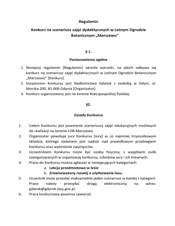 Regulamin Konkurs na scenariusz zajęć dydaktycznych w Leśnym Ogrodzie Botanicznym „Marszewo” § 1. Postanowienia ogólne 1. Niniejszy regulamin [Regulamin] określa warunki, na jakich odbywa się konkurs na scenariusz zajęć dydaktycznych w Leśnym Ogrodzie Botanicznym „Marszewo” [Konkurs]. 2. Inicjatorem Konkursu jest Nadleśnictwo Gdańsk z siedzibą w Gdyni, ul. Morska 200, 81-006 Gdynia [Organizator]. 3. Konkurs organizowany jest na terenie Rzeczpospolitej Polskiej. §2. Zasady Konkursu 1. 2. 3. 4. 5. 6. Celem Konkursu jest powstanie scenariuszy zajęć edukacyjnych możliwych do realizacji na terenie LOB Marszewo. Organizator powołuje jury Konkursu [Jury] w co najmniej trzyosobowym składzie, którego zadaniem jest nadzór nad prawidłowym przebiegiem Konkursu oraz wyłonienie zwycięzców. Uczestnikiem Konkursu może być osoba fizyczna, z wyjątkiem osób zaangażowanych w organizację konkursu, członków jury i ich krewnych. Prace do Konkursu można zgłaszać w następujących kategoriach: a. Lekcja przedmiotowa w lesie b. Zrównoważony rozwój a użytkowanie lasu. Uczestnik może przesłać maksymalnie jeden scenariusz w każdej z kategorii. Prace należy przesyłać drogą elektroniczną na adres: [email protected]. Praca konkursowa powinna zawierać: a. Scenariusz, opatrzony godłem (ciąg do 12 znaków polskiego alfabetu), oraz tytułem kategorii. b. W osobnym pliku: dane osobowe autora pracy: imię, nazwisko, adres korespondencyjny. 7. Konkurs trwa od chwili publikacji na stronie internetowej organizatora do do 27 listopada 2015 r. 8. Zgłoszenie Prac do Konkursu jest równoznaczne z oświadczeniem Uczestnika, że przysługują mu do nich autorskie prawa osobiste i nieograniczone prawa majątkowe, a także, że przyjmuje na siebie odpowiedzialność wobec Organizatora za wady prawne zgłoszonych Prac. Organizator zastrzega sobie prawo do odrzucenia Pracy, która nie spełnia postanowień Regulaminu lub narusza obowiązujące prawo. Zgłoszenie Prac w Konkursie jest równoznaczne z udzieleniem Organizatorowi Konkursu zgody na wykorzystanie zgłoszonych Prac w formie drukowanej i elektronicznej, wraz z przekazaniem praw autorskich na wszystkich polach eksploatacji na potrzeby wszystkich działań i publikacji związanych z działalnością edukacyjną i promocyjną nadleśnictwa. Ponadto jest równoznaczne ze zgodą uczestnika na posługiwanie się przez Organizatora jego imieniem i nazwiskiem w celach informacyjnych. § 3. 9. 23. Nagrody 1. 2. 3. 4. Jury przyzna następujące nagrody [Nagrody]: a. Nagrodę główną, w każdej kategorii: w wysokości 1000 zł. b. Wyróżnienia, w łącznej wysokości 500 zł. c. Nagrody rzeczowe m.in. „Plansze edukacyjne Drzewa leśne”. Jury ma prawo do nieprzyznania nagrody w każdej z kategorii. Ogłoszenie wyników odbędzie na stronach internetowych Organizatora. Od wartości nagrody zostanie potrącony podatek. § 4. Postanowienia końcowe 1. 2. Organizator zastrzega sobie prawo do ostatecznej interpretacji i zmian Regulaminu. W sprawach nieuregulowanych Regulaminem zastosowanie znajdą odpowiednie przepisy prawa. ZATWIERDZAM (zastępca nadleśniczego Adam Pleskot, podpis nieczytelny) Konkurs na scenariusz zajęć dydaktycznych w Leśnym Ogrodzie Botanicznym „Marszewo” Załącznik nr. 1: Ogólne założenia zajęć Zajęcia nie powinny trwać dłużej niż 2 godziny lekcyjne. Powinny być możliwe do przeprowadzenia na terenie Leśnego Ogrodu Botanicznego Marszewo. Opisy prowadzonych w chwili obecnej zajęć , ich scenariusze, dostępna infrastruktura edukacyjna, opisana jest na stronie www.marszewo.edu.pl Scenariusz powinien być możliwy do przeprowadzenia samodzielnie przez nauczyciela szkoły podstawowej i gimnazjum, odbiorcami zajęć mają być uczniowie tychże szkół. Dopuszcza się scenariusze przeznaczone dla innych grup wiekowych / szkół. Dopuszcza się wykorzystanie infrastruktury edukacyjnej, pomocy dydaktycznych Leśnego Ogrodu Botanicznego. Scenariusz (w języku polskim) nie powinien przekraczać objętości ok. 3600 znaków (ze spacjami). 1. Lekcja przedmiotowa w lesie. Zajęcia powinny realizować aktualne założenia programowe wybranego przedmiotu (przedmiotów), np.: a. Przyrody, geografii: zajęcia dotyczące mapy, orientacji w terenie itp. Organizator posiada mapy (standard imprez na orientację) ogrodzonej części ogrodu, busole. Istnieje możliwość bezpiecznego i samodzielnego poruszania się uczestników zajęć po terenie ogrodu. b. Matematyki : las ze znaczną ilością martwych gałęzi pozwala na np. konstruowanie modeli np. sześcianów obrazujących różne miary objętości (m3, dm3). Ogród posiada też kilkanaście zestawów drewnianych klocków umożliwiających konstruowanie brył pasujących do konkretnych rzutów na powierzchnię. (http://www.marszewo.edu.pl/2013/10/matematyka-w-lesie-dlaczego-nie.html) c. Matematyki: ważną częścią pracy leśniczego jest pomiar objętości ściętych drzew (pomiar objętości walca) służące m.in. wyliczeniu wartości pozyskanego drewna. Na potrzeby ewentualnych zajęć związanych z powyższą tematyką, ogród posiada stosowne kłody drewna oraz sprzęt pomiarowy. 2. Zrównoważony rozwój a użytkowanie lasu. Zajęcia przeznaczone przede wszystkim dla gimnazjalistów. Powinny dotyczyć problematyki użytkowania lasu (i szerzej konsumpcji), jako modelu zrównoważonego rozwoju. Optymalnie powinny pozwalać na refleksję dotyczącą powyższej tematyki na poziomie lokalnym, regionalnym i globalnym. Zajęcia powinny prowokować do myślenia, dyskusji a nawet zmiany postaw uczestników zajęć. Powinny też spełniać założenia edukacji dla zrównoważonego rozwoju, opisane m.in. w Strategii Edukacji Dla Zrównoważonego Rozwoju (opracowanie: Komisja Gospodarcza ONZ, do pobrania na stronie Ministerstwa Środowiska. (Dział dla nauczycieli: http://nauczyciele.mos.gov.pl/index.php?mnu=92)