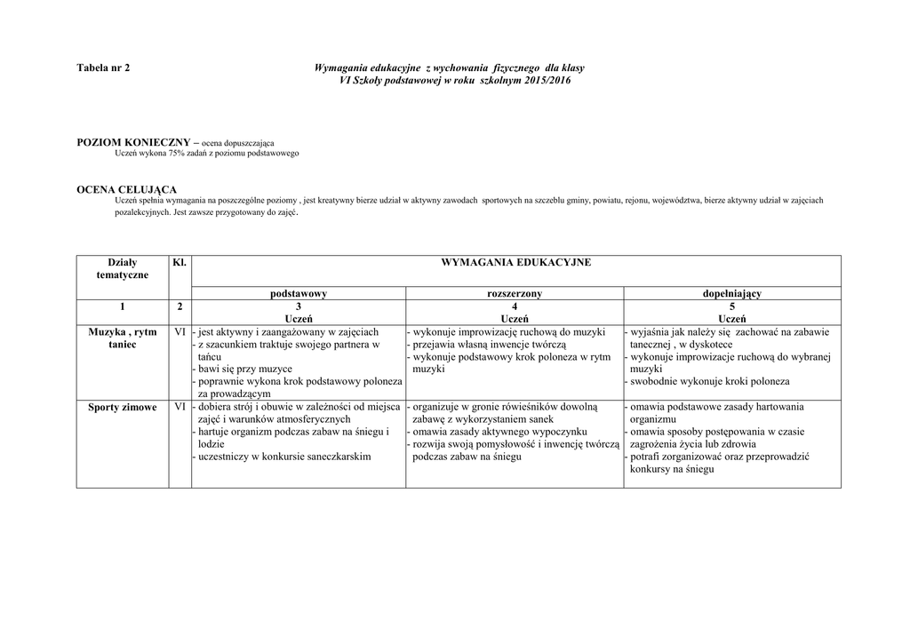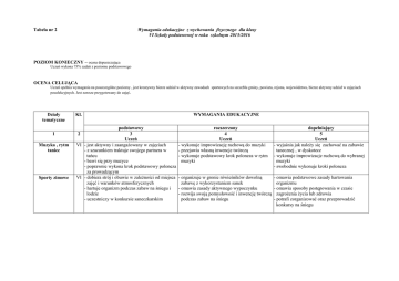 Tabela nr 2 Wymagania edukacyjne z wychowania fizycznego dla klasy VI Szkoły podstawowej w roku szkolnym 2015/2016 POZIOM KONIECZNY – ocena dopuszczająca Uczeń wykona 75% zadań z poziomu podstawowego OCENA CELUJĄCA Uczeń spełnia wymagania na poszczególne poziomy , jest kreatywny bierze udział w aktywny zawodach sportowych na szczeblu gminy, powiatu, rejonu, województwa, bierze aktywny udział w zajęciach pozalekcyjnych. Jest zawsze przygotowany do zajęć. Działy tematyczne 1 Muzyka , rytm taniec Sporty zimowe Kl. podstawowy 3 Uczeń VI - jest aktywny i zaangażowany w zajęciach - z szacunkiem traktuje swojego partnera w tańcu - bawi się przy muzyce - poprawnie wykona krok podstawowy poloneza za prowadzącym VI - dobiera strój i obuwie w zależności od miejsca zajęć i warunków atmosferycznych - hartuje organizm podczas zabaw na śniegu i lodzie - uczestniczy w konkursie saneczkarskim 2 WYMAGANIA EDUKACYJNE rozszerzony 4 Uczeń - wykonuje improwizację ruchową do muzyki - przejawia własną inwencje twórczą - wykonuje podstawowy krok poloneza w rytm muzyki dopełniający 5 Uczeń - wyjaśnia jak należy się zachować na zabawie tanecznej , w dyskotece - wykonuje improwizacje ruchową do wybranej muzyki - swobodnie wykonuje kroki poloneza - organizuje w gronie rówieśników dowolną zabawę z wykorzystaniem sanek - omawia zasady aktywnego wypoczynku - rozwija swoją pomysłowość i inwencję twórczą podczas zabaw na śniegu - omawia podstawowe zasady hartowania organizmu - omawia sposoby postępowania w czasie zagrożenia życia lub zdrowia - potrafi zorganizować oraz przeprowadzić konkursy na śniegu Uczeń Trening zdrowia Gimnastyka VI - wykazuje zaangażowanie w zajęcia - wykazuje troskę o własną postawę ciała - bezpiecznie korzysta ze sprzętu i urządzeń sportowych - stosuje zasady asekuracji - zna zasady prawidłowego podnoszenia ciężkich rzeczy - wykona przewrót w przód i w tył z przysiadu podpartego do przysiadu podpartego - wykonuje naskok na odskocznię, odbicie oraz prawidłowe ułożenie rąk do przeskoku przez skrzynię. Lekka atletyka 300 m Chł Dz. Ocena Celujący 9,60 Bardzo dobry 10,10 Dobry 10,60 Dostateczny 11,10 Dopuszczający 11,50 Minimum 11,90 9,80 Celujący 10,20 Bardzo dobry 10,90 Dobry 11,50 Dostateczny 11,80 Dopuszczający 12,10 Minimum Skok w dal z miejsca Celujący Bardzo dobry Dobry Dostateczny Dopuszczający Minimum Uczeń - jest bardzo aktywny i zaangażowany na zajęciach - pomaga kolegom prawidłowo wykonać ćwiczenie -starannie i dokładnie wykonuje zlecone ćwiczenia - asekuruje kolegę podczas ćwiczeń - zna podstawową terminologie gimnastyczną - wykona przewrót w tył z przysiady do rozkroku - wykonuje odbicie z nogi podporowej i zamach nogi zakrocznej. - wykonuje przewrót w tył z postawy stojącej o nogach prostych. - przewrót w przód nad przeszkodą. - wykonuje stanie na rękach z uniku podpartego z pomocą nauczyciela Ocena poziomu sprawności będzie stosowana według tabel. 60 m Ocena Uczeń 2,00 1,90 1,83 1,65 1,50 1,30 Chł Dz. Ocena 0,53 0,55 1,02 1,07 1,09 1,12 Skok w dal 1,95 Celujący 1,85 Bardzo dobry 1,70 Dobry 1,60 Dostateczny 1,45 Dopuszczający 1,20 Minimum 600 m 4,20 4,00 3,70 3,45 3,20 3,00 0,56 Celujący 0,59 Bardzo dobry 1,05 Dobry 1,12 Dostateczny 1,14 Dopuszczający 1,18 Minimum 800 m Chł Dz. Ocena 2,14 2,22 2,32 2,45 2,57 3,05 2,18 Celujący 2,24 Bardzo dobry 2,42 Dobry 2,54 Dostateczny 3,02 Dopuszczający 3,12 Minimum Rzut p. lekarską 3,80 Celujący 3,60 Bardzo dobry 3,40 Dobry 3,20 Dostateczny 3,00 Dopuszczający 2,80 Minimum 9,00 8,00 7,10 5,80 5,00 4,20 1000 m Chł Dz. Ocena 2,44 3,16 3,40 4,28 4,55 5,17 Chł Dz. 2,52 3,28 Celujący 3,24 Bardzo dobry 4,00 4,02 4,25 Dobry 4,43 Dostateczny 4,43 5,09 Dopuszczający 5,08 5,32 Minimum 5,38 3,52 4,28 5,08 5,38 5,54 6,14 Rzut p. palantową Test Coopera (12min) 7,60 Celujący 6,80 Bardzo dobry 5,40 Dobry 4,80 Dostateczny 3,90 Dopuszczający 3,20 Minimum 44 40 36 31 28 25 35 32 25 22 20 18 Celujący Bardzo dobry Dobry Dostateczny Dopuszczający Minimum 2800 2550 2300 1800 1400 1300 2500 2200 1900 1500 1100 1000 Sporty całego życia i wypoczynek Piłka siatkowa Piłka ręczna Piłka nożna Piłka koszykowa Uczeń Uczeń Uczeń VI - jest aktywny na zajęciach - zachowuje zasady bezpieczeństwa podczas gry - przyjmuje postawę siatkarską oraz poprawnie porusza się po boisku - podporządkowuje się decyzjom sędziego - potrafi wykonać zagrywkę tenisową - zna podstawowe przepisy gry - wykona 4 z 8 zagrywek tenisowych VI - jest odpowiedzialny w czasie gry - współpracuje w zespole - zachowuje bezpieczeństwo w czasie gry - podporządkowuje się decyzjom sędziego - kozłuje piłkę ze zmiana tempa kierunku i ręki kozłującej - wykonuje rzut do bramki dowolnym sposobem - wymienia podstawowe przepisy gry w piłkę ręczną - stara się podnieść swoje umiejętności - wykonuje przyjęcie i odbicie piłki sposobem - wykona odbicia sposobem górnym i dolnym górnym i dolnym w zespole trójkowym. - stosuje w grze odbicia piłki sposobem oburącz - wykona 5 z 8 zagrywek tenisowych, a jedną z dolnym nich trafi na materac - omawia podstawową technikę poszczególnych - wykonuje odbicie piłki sposobem górnym i elementów gry dolnym w wyznaczonym miejscu - wykona 5 z 8 zagrywek tenisowych VI - jest aktywny i zaangażowany na zajęciach - zachowuje bezpieczeństwo podczas gry - przyjmuje i uderza piłkę nogą w miejscu - prowadzi piłkę wewnętrzną i zewnętrzną częścią stopy - wymienia podstawowe przepisy gry - przyjmuje i podaje piłkę zewnętrzną i wewnętrzną częścią stopy - celnie uderza piłkę na bramkę dwoma sposobami - prowadzi piłkę prawą i lewą noga slalomem VI - przestrzega zasad bezpieczeństwa podczas meczu - angażuje się w dokładne wykonanie zadania - podaje piłkę oburącz sprzed klatki piersiowej półgórnie i kozłem w miejscu i w ruchu - kozłuje piłkę prawą i lewą ręką ze zmianą kieru
