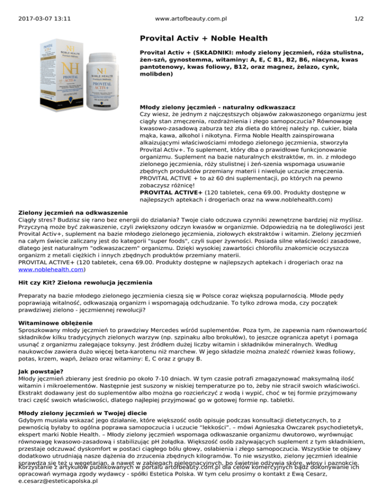 2017-03-07 13:11 www.artofbeauty.com.pl 1/2 Provital Activ + Noble Health Provital Activ + (SKŁADNIKI: młody zielony jęczmień, róża stulistna, żen-szń, gynostemma, witaminy: A, E, C B1, B2, B6, niacyna, kwas pantotenowy, kwas foliowy, B12, oraz magnez, żelazo, cynk, molibden) Młody zielony jęczmień - naturalny odkwaszacz Czy wiesz, że jednym z najczęstszych objawów zakwaszonego organizmu jest ciągły stan zmęczenia, rozdrażnienia i złego samopoczucia? Równowagę kwasowo-zasadową zaburza też zła dieta do której należy np. cukier, biała mąka, kawa, alkohol i nikotyna. Firma Noble Health zainspirowana alkaizującymi właściwościami młodego zielonego jęczmienia, stworzyła Provital Activ+. To suplement, który dba o prawidłowe funkcjonowanie organizmu. Suplement na bazie naturalnych ekstraktów, m. in. z młodego zielonego jęczmienia, róży stulistnej i żeń-szenia wspomaga usuwanie zbędnych produktów przemiany materii i niweluje uczucie zmęczenia. PROVITAL ACTIVE + to aż 60 dni suplementacji, po których na pewno zobaczysz różnicę! PROVITAL ACTIVE+ (120 tabletek, cena 69.00. Produkty dostępne w najlepszych aptekach i drogeriach oraz na www.noblehealth.com) Zielony jęczmień na odkwaszenie Ciągły stres? Budzisz się rano bez energii do działania? Twoje ciało odczuwa czynniki zewnętrzne bardziej niż myślisz. Przyczyną może być zakwaszenie, czyli zwiększony odczyn kwasów w organizmie. Odpowiedzią na te dolegliwości jest Provital Activ+, suplement na bazie młodego zielonego jęczmienia, ziołowych ekstraktów i witamin. Zielony jęczmień na całym świecie zaliczany jest do kategorii "super foods", czyli super żywności. Posiada silne właściwości zasadowe, dlatego jest naturalnym "odkwaszaczem" organizmu. Dzięki wysokiej zawartości chlorofilu znakomicie oczyszcza organizm z metali ciężkich i innych zbędnych produktów przemiany materii. PROVITAL ACTIVE+ (120 tabletek, cena 69.00. Produkty dostępne w najlepszych aptekach i drogeriach oraz na www.noblehealth.com) Hit czy Kit? Zielona rewolucja jęczmienia Preparaty na bazie młodego zielonego jęczmienia cieszą się w Polsce coraz większą popularnością. Młode pędy poprawiają witalność, odkwaszają organizm i wspomagają odchudzanie. To tylko zdrowa moda, czy początek prawdziwej zielono - jęczmiennej rewolucji? Witaminowe oblężenie Sproszkowany młody jęczmień to prawdziwy Mercedes wśród suplementów. Poza tym, że zapewnia nam równowartość składników kilku tradycyjnych zielonych warzyw (np. szpinaku albo brokułów), to jeszcze ogranicza apetyt i pomaga usunąć z organizmu zalegające toksyny. Jest źródłem dużej liczby witamin i składników mineralnych. Według naukowców zawiera dużo więcej beta-karotenu niż marchew. W jego składzie można znaleźć również kwas foliowy, potas, krzem, wapń, żelazo oraz witaminy: E, C oraz z grupy B. Jak powstaje? Młody jęczmień zbierany jest średnio po około 7-10 dniach. W tym czasie potrafi zmagazynować maksymalną ilość witamin i mikroelementów. Następnie jest suszony w niskiej temperaturze po to, żeby nie stracił swoich właściwości. Ekstrakt dodawany jest do suplementów albo można go rozcieńczyć z wodą i wypić, choć w tej formie przyjmowany traci część swoich właściwości, dlatego najlepiej przyjmować go w gotowej formie np. tabletki. Młody zielony jęczmień w Twojej diecie Gdybym musiała wskazać jego działanie, które większość osób opisuje podczas konsultacji dietetycznych, to z pewnością byłaby to ogólna poprawa samopoczucia i uczucie “lekkości”. – mówi Agnieszka Owczarek psychodietetyk, ekspert marki Noble Health. – Młody zielony jęczmień wspomaga odkwaszanie organizmu dwutorowo, wyrównując równowagę kwasowo-zasadową i stabilizując pH żołądka. Większość osób zażywających suplement z tym składnikiem, przestaje odczuwać dyskomfort w postaci ciągłego bólu głowy, osłabienia i złego samopoczucia. Wszystkie te objawy dodatkowo utrudniają nasze dążenia do zrzucenia zbędnych kilogramów. To nie wszystko, zielony jęczmień idealnie sprawdza się też u wegetarian, a nawet w zabiegach pielęgnacyjnych, bo świetnie odżywia skórę, włosy i paznokcie. Korzystanie z artykułów publikowanych w portalu artofbeauty.com.pl dla celów komercyjnych bądź dokonywanie ich opracowań wymaga zgody wydawcy - spółki Estetica Polska. W tym celu prosimy o kontakt z Ewą Cesarz, [email protected] 2017-03-07 13:11 www.artofbeauty.com.pl 2/2 To tak naprawdę „must have” każdego z nas. Polecam Provital Activ+ z wysoko wchłanialną dawką zielonego jęczmienia w formie tabletki. Suplement znakomicie dba o równowagę kwasowo-zasadową organizmu i dodaje energii. Produkty dostępne są w drogeriach i najlepszych aptekach w całej Polsce. PROVITAL ACTIVE+ (120 tabletek, aż 60-dniowa suplementacja, cena 69,00zł) www.noblehealth.com Korzystanie z artykułów publikowanych w portalu artofbeauty.com.pl dla celów komercyjnych bądź dokonywanie ich opracowań wymaga zgody wydawcy - spółki Estetica Polska. W tym celu prosimy o kontakt z Ewą Cesarz, [email protected]