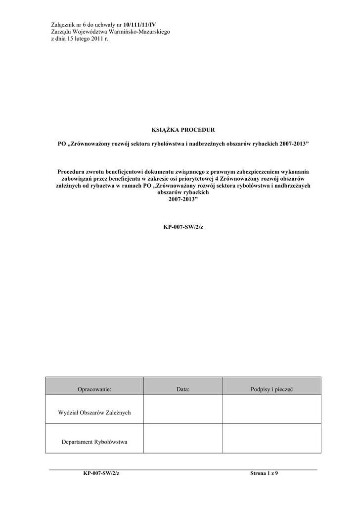 Załącznik nr 6 do uchwały nr 10/111/11/IV Zarządu Województwa Warmińsko-Mazurskiego z dnia 15 lutego 2011 r. KSIĄśKA PROCEDUR PO „ZrównowaŜony rozwój sektora rybołówstwa i nadbrzeŜnych obszarów rybackich 2007-2013” Procedura zwrotu beneficjentowi dokumentu związanego z prawnym zabezpieczeniem wykonania zobowiązań przez beneficjenta w zakresie osi priorytetowej 4 ZrównowaŜony rozwój obszarów zaleŜnych od rybactwa w ramach PO „ZrównowaŜony rozwój sektora rybołówstwa i nadbrzeŜnych obszarów rybackich 2007-2013” KP-007-SW/2/z Opracowanie: Data: Podpisy i pieczęć Wydział Obszarów ZaleŜnych Departament Rybołówstwa KP-007-SW/2/z Strona 1 z 9 Zatwierdzenie: Data: Podpisy i pieczęć MRiRW Spis treści: 1. Wykaz uŜywanych pojęć......................................................................................................................... 4 2. R EGUŁY ZWIĄZANE Z PRZEBIEGIEM PROCEDURY………………………………………………5 3. Zakres czynności i odpowiedzialności na stanowiskach związanych z wykonywaniem poszczególnych zadań ...................................................................................................................... 4 3. Opis procedury zwrotu beneficjentom dokumentów związanych z prawnym zabezpieczeniem wykonania zobowiązań przez beneficjentów określająca niezbędne czynności, komórki i stanowiska odpowiedzialne za ich wykonanie oraz terminy. .................................................................. 7 4. Dokumenty .............................................................................................................................................. 9 KP-007-SW/2/z Strona 2 z 9 Załącznik nr 6 do uchwały nr 10/111/11/IV Zarządu Województwa Warmińsko-Mazurskiego z dnia 15 lutego 2011 r. 1. Wykaz uŜywanych pojęć Weksel niezupełny (in blanco) – jest to rodzaj papieru wartościowego, w którym wystawca weksla zobowiązuje się dokona na rzecz odbiorcy weksla (remitenta) zapłaty określonej sumy pienięŜnej zgodnie z warunkami określonymi w deklaracji wekslowej (w przypadku operacji o wartości poniŜej 500 000 zł kwoty dofinansowania). Deklaracja wekslowa - jest to dokument, gdzie strony uzgadniają warunki i sposób wypełnienia weksla in blanco. Oświadczenie o dobrowolnym poddaniu się egzekucji – jednostronne oświadczenie woli wyraŜone w formie pisemnej (w przypadku operacji o wartości powyŜej 500 000 zł kwoty dofinansowania) przez beneficjenta o poddaniu się egzekucji bez konieczności wszczęcia postępowania egzekucyjnego. KP-007-SW/2/z Strona 3 z 9 2. Reguły związane z przebiegiem procedury Sposób i zasady przechowywania weksli in blanco wraz z deklaracjami wekslowymi oraz oświadczenia o dobrowolnym poddaniu się egzekucji. Weksle in blanco wraz z deklaracjami wekslowymi oraz oświadczenia o dobrowolnym poddaniu się egzekucji powinny być przechowywane w szafach pancernych zlokalizowanych w pomieszczeniach komórek dedykowanych do obsługi Programu Operacyjnego „ZrównowaŜony rozwój sektora rybołówstwa i nadbrzeŜnych obszarów rybackich 2007-2013” lub innych komórkach organizacyjnych Urzędu Marszałkowskiego/wojewódzkiej samorządowej jednostki organizacyjnej albo w skrytkach bankowych. Ponadto zaleca się przechowywanie i zabezpieczanie weksli in blanco oraz oświadczenia o dobrowolnym poddaniu się egzekucji w następujący sposób: Dokument uwaŜa się za zabezpieczony, jeŜeli – w sposób ciągły – są spełnione łącznie następujące warunki: • • • jest zapewniona jego dostępność wyłącznie dla osób uprawnionych, jest chroniony przed przypadkowym lub nieuprawnionym zniszczeniem, są zastosowane metody i środki ochrony dokumentu, których skuteczność w czasie ich zastosowania jest powszechnie uznawana. Zabezpieczenie dokumentów wymaga w szczególności: • • • • systematycznego dokonywania analizy zagroŜeń, opracowania i stosowania procedur zabezpieczania dokumentów i systemów ich przetwarzania, w tym procedur dostępu, stosowania środków bezpieczeństwa adekwatnych do zagroŜeń, bieŜącego kontrolowania funkcjonowania wszystkich organizacyjnych i technologiczno-informatycznych sposobów zabezpieczenia, a takŜe okresowego dokonywania oceny skuteczności tych sposobów. KP-007-SW/2/z Strona 4 z 9 Załącznik nr 6 do uchwały nr 10/111/11/IV Zarządu Województwa Warmińsko-Mazurskiego z dnia 15 lutego 2011 r. KP-007-SW/2/z Strona 5 z 9 3. ZAKRES CZYNNOŚCI I ODPOWIEDZIALNOŚCI NA STANOWISKACH ZWIĄZANYCH Z WYKONYWANIEM POSZCZEGÓLNYCH ZADAŃ Stanowisko Czynność Samodzielne stanowisko pracy do spraw kancelaryjnobiurowych w SW Pracownik merytoryczny komórki wdroŜeniowej SW Kierownik jednostki organizacyjnej lub osoba upowaŜniona KP-007-SW/2/z Zwrot dokumentów związanych z prawnym zabezpieczeniem wykonania zobowiązań przez beneficjentów Zakres czynności - wysyłanie korespondencji związanej ze zwrotem dokumentów beneficjentowi; - uaktualnienie wykazu dokumentów; - monitorowanie terminu wydania dokumentów beneficjentowi; - sporządzanie karty udostępnienia/wydania dokumentów; - odbiór dokumentów; - sporządzanie pisma do beneficjenta zapraszającego do odbioru dokumentów; - wydawanie dokumentów beneficjentowi na podstawie potwierdzenia odbioru; - sporządzanie pisma zwracającego dokumenty beneficjentowi; - sporządzenie protokołu kasacji dokumentów związanych z prawnym zabezpieczeniem wykonania zobowiązań przez beneficjentów; - podpisanie karty udostępnienia/wydania dokumentów; - podpisywanie pisma do Beneficjenta zapraszającego do odbioru dokumentów; - podpisywanie pisma zwracającego dokumenty; - podpisywanie protokołu kasacji dokumentów związanych z prawnym zabezpieczeniem wykonania zobowiązań przez beneficjentów; - udzielanie zezwolenia na udostępnienie/wydanie dokumentów; Strona 6 z 9 Załącznik nr 6 do uchwały nr 10/111/11/IV Zarządu Województw