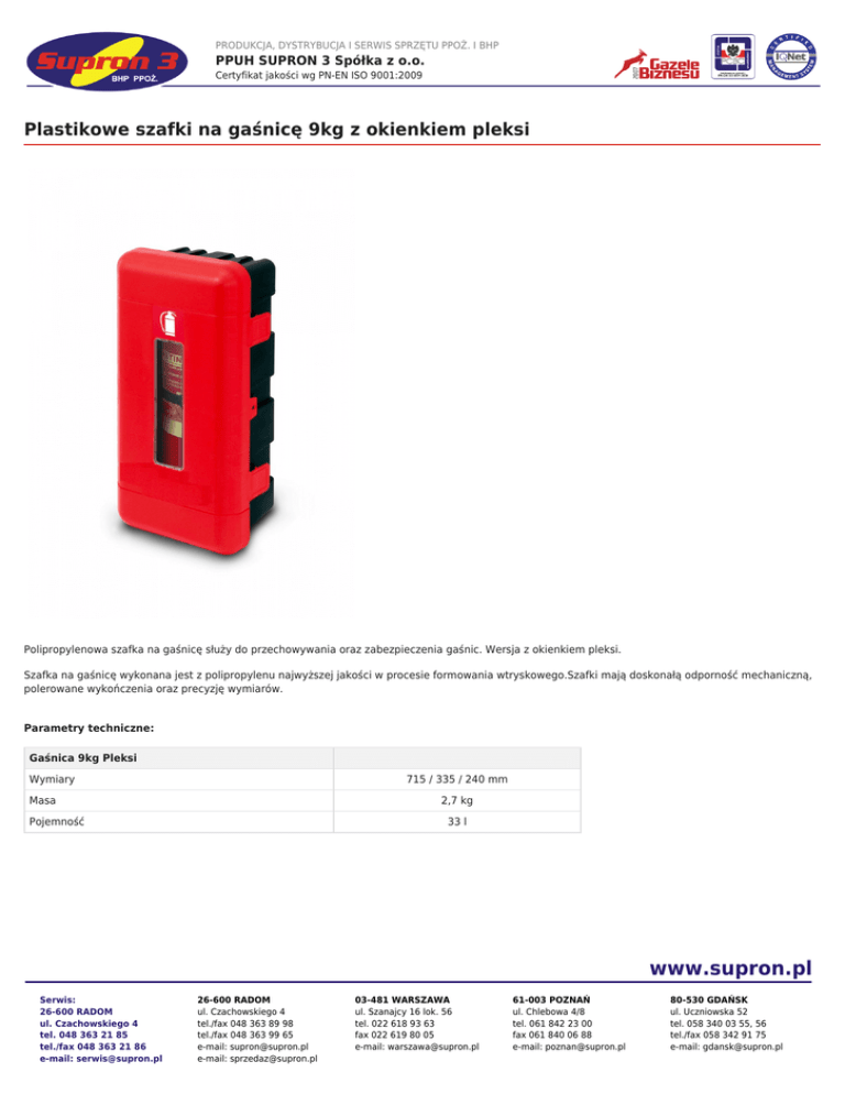 PRODUKCJA, DYSTRYBUCJA I SERWIS SPRZĘTU PPOŻ. I BHP PPUH SUPRON 3 Spółka z o.o. Certyfikat jakości wg PN-EN ISO 9001:2009 Plastikowe szafki na gaśnicę 9kg z okienkiem pleksi Polipropylenowa szafka na gaśnicę służy do przechowywania oraz zabezpieczenia gaśnic. Wersja z okienkiem pleksi. Szafka na gaśnicę wykonana jest z polipropylenu najwyższej jakości w procesie formowania wtryskowego.Szafki mają doskonałą odporność mechaniczną, polerowane wykończenia oraz precyzję wymiarów. Parametry techniczne: Gaśnica 9kg Pleksi Wymiary 715 / 335 / 240 mm Masa 2,7 kg Pojemność 33 l www.supron.pl Serwis: 26-600 RADOM ul. Czachowskiego 4 tel. 048 363 21 85 tel./fax 048 363 21 86 e-mail: [email protected] 26-600 RADOM ul. Czachowskiego 4 tel./fax 048 363 89 98 tel./fax 048 363 99 65 e-mail: [email protected] e-mail: [email protected] 03-481 WARSZAWA ul. Szanajcy 16 lok. 56 tel. 022 618 93 63 fax 022 619 80 05 e-mail: [email protected] 61-003 POZNAŃ ul. Chlebowa 4/8 tel. 061 842 23 00 fax 061 840 06 88 e-mail: [email protected] 80-530 GDAŃSK ul. Uczniowska 52 tel. 058 340 03 55, 56 tel./fax 058 342 91 75 e-mail: [email protected]