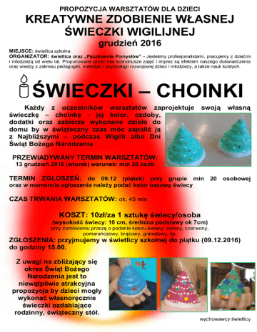 PROPOZYCJA WARSZTATÓW DLA DZIECI KREATYWNE ZDOBIENIE WŁASNEJ ŚWIECZKI WIGILIJNEJ grudzień 2016 MIEJSCE: świetlica szkolna ORGANIZATOR: świetlica oraz „Pączkownia Pomysłów” - Jesteśmy profesjonalistami, pracujemy z dziećmi i młodzieżą od wielu lat. Proponowane przez nas scenariusze zajęć i imprez są efektem naszego doświadczenia oraz wiedzy z zakresu pedagogiki, metodyki i psychologii rozwojowej dzieci i młodzieży, a także nauk ścisłych. ŚWIECZKI – CHOINKI Każdy z uczestników warsztatów zaprojektuje świeczkę – choinkę - jej kolor, ozdoby, dodatki oraz zabierze wykonane dzieło do domu by w świąteczny czas móc zapalić ją z Najbliższymi – podczas Wigilii albo Dni Świąt Bożego Narodzenia swoją własną PRZEWIADYWANY TERMIN WARSZTATÓW: 13 grudzień 2016 (wtorek) warunek: min 20 osób TERMIN ZGŁOSZEŃ: do 09.12 (piątek) przy grupie min 20 osobowej oraz w momencie zgłoszenia należy podać kolor bazowy świecy CZAS TRWANIA WARSZTATÓW: ok. 45 min KOSZT: 10zł/za 1 sztukę świecy/osoba (wysokość świecy: 10 cm, średnica podstawy ok 7cm) przy zamówieniu proszę o podanie koloru świecy: zielony, czerwony, pomarańczowy, brązowy, granatowy, itp. ZGŁOSZENIA: przyjmujemy w świetlicy szkolnej do piątku (09.12.2016) do godziny 15.00. Z uwagi na zbliżający się okres Świąt Bożego Narodzenia jest to niewątpliwie atrakcyjna propozycja by dzieci mogły wykonać własnoręcznie świeczki ozdabiające rodzinny, świąteczny stół. wychowawcy świetlicy