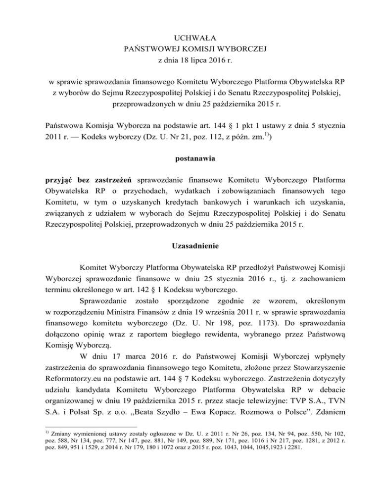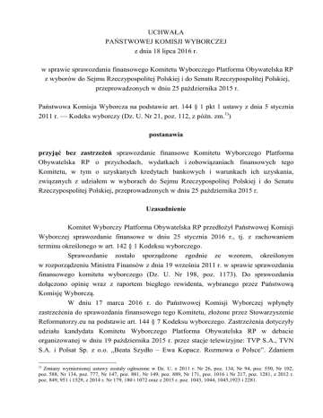 UCHWAŁA PAŃSTWOWEJ KOMISJI WYBORCZEJ z dnia 18 lipca 2016 r. w sprawie sprawozdania finansowego Komitetu Wyborczego Platforma Obywatelska RP z wyborów do Sejmu Rzeczypospolitej Polskiej i do Senatu Rzeczypospolitej Polskiej, przeprowadzonych w dniu 25 października 2015 r. Państwowa Komisja Wyborcza na podstawie art. 144 § 1 pkt 1 ustawy z dnia 5 stycznia 2011 r. — Kodeks wyborczy (Dz. U. Nr 21, poz. 112, z późn. zm.1)) postanawia przyjąć bez zastrzeżeń sprawozdanie finansowe Komitetu Wyborczego Platforma Obywatelska RP o przychodach, wydatkach i zobowiązaniach finansowych tego Komitetu, w tym o uzyskanych kredytach bankowych i warunkach ich uzyskania, związanych z udziałem w wyborach do Sejmu Rzeczypospolitej Polskiej i do Senatu Rzeczypospolitej Polskiej, przeprowadzonych w dniu 25 października 2015 r. Uzasadnienie Komitet Wyborczy Platforma Obywatelska RP przedłożył Państwowej Komisji Wyborczej sprawozdanie finansowe w dniu 25 stycznia 2016 r., tj. z zachowaniem terminu określonego w art. 142 § 1 Kodeksu wyborczego. Sprawozdanie zostało sporządzone zgodnie ze wzorem, określonym w rozporządzeniu Ministra Finansów z dnia 19 września 2011 r. w sprawie sprawozdania finansowego komitetu wyborczego (Dz. U. Nr 198, poz. 1173). Do sprawozdania dołączono opinię wraz z raportem biegłego rewidenta, wybranego przez Państwową Komisję Wyborczą. W dniu 17 marca 2016 r. do Państwowej Komisji Wyborczej wpłynęły zastrzeżenia do sprawozdania finansowego tego Komitetu, złożone przez Stowarzyszenie Reformatorzy.eu na podstawie art. 144 § 7 Kodeksu wyborczego. Zastrzeżenia dotyczyły udziału kandydata Komitetu Wyborczego Platforma Obywatelska RP w debacie organizowanej w dniu 19 października 2015 r. przez stacje telewizyjne: TVP S.A., TVN S.A. i Polsat Sp. z o.o. „Beata Szydło – Ewa Kopacz. Rozmowa o Polsce”. Zdaniem 1) Zmiany wymienionej ustawy zostały ogłoszone w Dz. U. z 2011 r. Nr 26, poz. 134, Nr 94, poz. 550, Nr 102, poz. 588, Nr 134, poz. 777, Nr 147, poz. 881, Nr 149, poz. 889, Nr 171, poz. 1016 i Nr 217, poz. 1281, z 2012 r. poz. 849, 951 i 1529, z 2014 r. Nr 179, 180 i 1072 oraz z 2015 r. poz. 1043, 1044, 1045,1923 i 2281. 2 Stowarzyszenia składającego te zastrzeżenia, udział kandydata Komitetu w tym programie naruszył przepisy Kodeksu wyborczego, jak również podstawowe zasady ustrojowe Państwa wymienione w Konstytucji RP. Pismem z dnia 24 maja 2016 r. Państwowa Komisja Wyborcza zwróciła się do Komitetu Wyborczego Platforma Obywatelska RP o ustosunkowanie się do wniesionych zastrzeżeń. W odpowiedzi udzielonej 6 czerwca 2016 r. pełnomocnik finansowy Komitetu wyjaśnił, że program ten był organizowany, produkowany i emitowany przez niezależnych od Komitetu nadawców telewizyjnych, a jego kandydat uczestniczył w programie na zaproszenie organizatorów. Komitet w żaden sposób nie współtworzył omawianego programu telewizyjnego, co oznacza, że program nie stanowił materiału wyborczego ani audycji wyborczej Komitetu w rozumieniu art. 116a § 1 Kodeksu wyborczego, Komitet więc nie był zobowiązany do ponoszenia jakichkolwiek kosztów związanych z jego produkcją ani emisją. Ponadto debata z udziałem kandydata nie może być uważana za audycję wyborczą ani tym bardziej za świadczenie pieniężne przyjęte przez Komitet. Pełnomocnik finansowy Komitetu stwierdził, że złożone przez Stowarzyszenie Reformatorzy.eu zastrzeżenia dotyczą zagadnień, które w żaden sposób nie rzutują na kwestie związane z jego sprawozdaniem finansowym. Odnosząc się do tego wyjaśnienia oraz opierając się na dokumentach załączonych do sprawozdania finansowego Komitetu Wyborczego Platforma Obywatelska RP, Państwowa Komisja Wyborcza stwierdziła, że udział kandydata Komitetu Wyborczego Platforma Obywatelska RP w audycji „Beata Szydło – Ewa Kopacz. Rozmowa o Polsce” nie stanowił kampanii wyborczej tego Komitetu w rozumieniu przepisów Kodeksu wyborczego. Nie były to działania podejmowane przez Komitet w celu publicznego nakłaniania lub zachęcania do głosowania w określony sposób lub do głosowania na kandydata określonego komitetu wyborczego. Skoro – co potwierdził pełnomocnik finansowy Komitetu – nie były to działania podejmowane czy finansowane przez Komitet, związane z prowadzeniem jego kampanii wyborczej, nieuprawniona byłaby ich analiza w odniesieniu do przepisów Kodeksu wyborczego dotyczących finansowania przez Komitet kampanii wyborczej. Państwowa Komisja Wyborcza uprawniona jest bowiem, w tym zakresie, wyłącznie do badania sprawozdania finansowego komitetu wyborczego odnośnie zgodności z prawem gospodarki finansowej prowadzonej przez komitet w związku z jego kampanią wyborczą. W wyniku badania sprawozdania finansowego, dołączonych do niego dokumentów oraz po zapoznaniu się z opinią i raportem biegłego rewidenta badającego sprawozdanie, Państwowa Komisja Wyborcza stwierdziła, co następuje. 3 Komitet Wyborczy Platforma Obywatelska RP wykazał w sprawozdaniu, że w okresie sprawozdawczym pozyskał przychody w wysokości 29 531 848,60 zł, które w całości pochodziły z wpłat dokonanych przelewem z rachunku bankowego Funduszu Wyborczego partii Platforma Obywatelska Rzeczypospolitej Polskiej, o nr 15 1020 1013 0000 0602 0005 9378. Przychody komitetu pozyskane były w terminach określonych w art. 129 § 2 Kodeksu wyborczego. Komitet dla gromadzenia środków pieniężnych otworzył w PKO Bank Polski S.A. podstawowy rachunek bankowy o nr 30 1020 1026 0000 1702 0259 3440 oraz 20 pomocniczych rachunków terenowych. Do umowy rachunku bankowego wprowadzono zastrzeżenia wskazane w art. 134 § 6 Kodeksu wyborczego. Komitet wyborczy nie pozyskiwał środków finansowych z innych źródeł, na jego rzecz nie były także przekazywane korzyści majątkowe o charakterze niepieniężnym. Wydatki komitetu wyniosły 29 415 998,51 zł i zostały przeznaczone na finansowanie: kosztów 