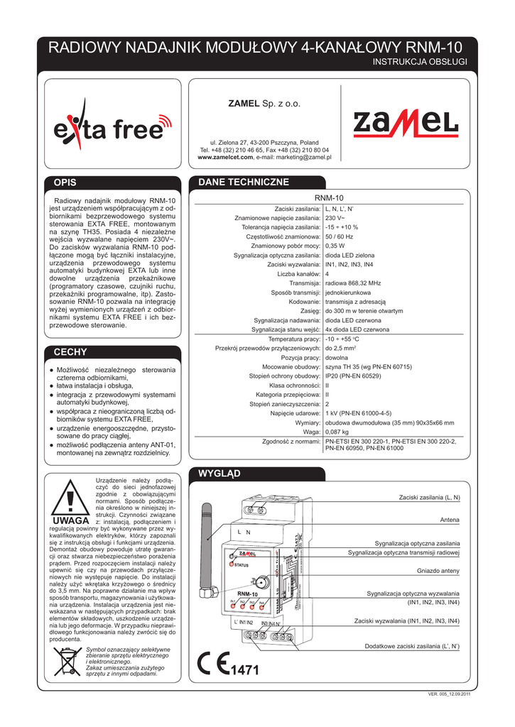 RADIOWY NADAJNIK MODUŁOWY 4-KANAŁOWY RNM-10 INSTRUKCJA OBSŁUGI ZAMEL Sp. z o.o. ul. Zielona 27, 43-200 Pszczyna, Poland Tel. +48 (32) 210 46 65, Fax +48 (32) 210 80 04 www.zamelcet.com, e-mail: [email protected] DANE TECHNICZNE OPIS Radiowy nadajnik modułowy RNM-10 jest urządzeniem współpracującym z odbiornikami bezprzewodowego systemu sterowania EXTA FREE, montowanym na szynę TH35. Posiada 4 niezależne wejścia wyzwalane napięciem 230V~. Do zacisków wyzwalania RNM-10 podłączone mogą być łączniki instalacyjne, urządzenia przewodowego systemu automatyki budynkowej EXTA lub inne dowolne urządzenia przekaźnikowe (programatory czasowe, czujniki ruchu, przekaźniki programowalne, itp). Zastosowanie RNM-10 pozwala na integrację wyżej wymienionych urządzeń z odbiornikami systemu EXTA FREE i ich bezprzewodowe sterowanie. RNM-10 Zaciski zasilania: L, N, L’, N’ Znamionowe napięcie zasilania: 230 V~ Tolerancja napięcia zasilania: -15 ÷ +10 % Częstotliwość znamionowa: 50 / 60 Hz Znamionowy pobór mocy: 0,35 W Sygnalizacja optyczna zasilania: dioda LED zielona Zaciski wyzwalania: IN1, IN2, IN3, IN4 Liczba kanałów: 4 Transmisja: radiowa 868,32 MHz Sposób transmisji: jednokierunkowa Kodowanie: transmisja z adresacją Zasięg: do 300 m w terenie otwartym Sygnalizacja nadawania: dioda LED czerwona Sygnalizacja stanu wejść: 4x dioda LED czerwona Temperatura pracy: -10 ÷ +55 oC CECHY Przekrój przewodów przyłączeniowych: do 2,5 mm2 Pozycja pracy: dowolna Mocowanie obudowy: szyna TH 35 (wg PN-EN 60715) ● Możliwość niezależnego sterowania czterema odbiornikami, ● łatwa instalacja i obsługa, ● integracja z przewodowymi systemami automatyki budynkowej, ● współpraca z nieograniczoną liczbą odbiorników systemu EXTA FREE, ● urządzenie energooszczędne, przystosowane do pracy ciągłej, ● możliwość podłączenia anteny ANT-01, montowanej na zewnątrz rozdzielnicy. Urządzenie należy podłączyć do sieci jednofazowej zgodnie z obowiązującymi normami. Sposób podłączenia określono w niniejszej instrukcji. Czynności związane UWAGA z: instalacją, podłączeniem i regulacją powinny być wykonywane przez wykwalifikowanych elektryków, którzy zapoznali się z instrukcją obsługi i funkcjami urządzenia. Demontaż obudowy powoduje utratę gwarancji oraz stwarza niebezpieczeństwo porażenia prądem. Przed rozpoczęciem instalacji należy upewnić się czy na przewodach przyłączeniowych nie występuje napięcie. Do instalacji należy użyć wkrętaka krzyżowego o średnicy do 3,5 mm. Na poprawne działanie ma wpływ sposób transportu, magazynowania i użytkowania urządzenia. Instalacja urządzenia jest niewskazana w następujących przypadkach: brak elementów składowych, uszkodzenie urządzenia lub jego deformacje. W przypadku nieprawidłowego funkcjonowania należy zwrócić się do producenta. Symbol oznaczający selektywne zbieranie sprzętu elektrycznego i elektronicznego. Zakaz umieszczania zużytego sprzętu z innymi odpadami. Stopień ochrony obudowy: IP20 (PN-EN 60529) Klasa ochronności: II Kategoria przepięciowa: II Stopień zanieczyszczenia: 2 Napięcie udarowe: 1 kV (PN-EN 61000-4-5) Wymiary: obudowa dwumodułowa (35 mm) 90x35x66 mm Waga: 0,087 kg Zgodność z normami: PN-ETSI EN 300 220-1, PN-ETSI EN 300 220-2, PN-EN 60950, PN-EN 61000 WYGLĄD Zaciski zasilania (L, N) Antena Sygnalizacja optyczna zasilania Sygnalizacja optyczna transmisji radiowej Gniazdo anteny Sygnalizacja optyczna wyzwalania (IN1, IN2, IN3, IN4) Zaciski wyzwalania (IN1, IN2, IN3, IN4) Dodatkowe zaciski zasilania (L’, N’) VER. 005_12.09.2011 PODŁĄCZENIE MONTAŻ, DZIAŁANIE UWAGA: Konieczne jest doprowadzenie zasilania do zacisków L’ i N’ ZASTOSOWANIE ZASIĘG DZIAŁANIA Urządzenie RNM-10 może sterować dowolnym odbiornikiem systemu EXTA FREE. W tej aplikacji RNM-10 wyzwalany sygnałem z wyłącznika zmierzchowego WZS-01, nadaje sygnał sterujący do odbiornika ROP-01, który włącza oświetlenie zewnętrzne. ProducentGWARANCYJNA udziela 24 miesięcznej gwarancji KARTA Pieczęć i podpis sprzedawcy, data sprzedaży 1. Rozłączyć obwód zasilania bezpiecznikiem, wyłącznikiem nadmiarowoprądowym lub rozłącznikiem izolacyjnym przyłączonymi do odpowiedniego obwodu. 2. Sprawdzić odpowiednim przyrządem stan beznapięciowy na przewodach zasilających. 3. Zamontować urządzenie RNM‑10 w rozdzielnicy na szynie TH 35. 4. Podłączyć przewody pod zaciski zgodnie ze schematem podłączenia. 5. Załączyć obwód zasilania. Urządzenie po poprawnym zamontowaniu i podłączeniu jest gotowe do pracy. Wyzwolenie układu przyciskiem jednobiegunowym podłączonym do jednego z czterech zacisków wyzwalania (IN1 - IN4) powoduje wysłanie przez RNM-10 radiowego sygnału sterującego przypisanego do tego wejścia (kanału). Czerwone diody LED IN1 - IN4 sygnalizują, który kanał został wyzwolony, a dioda STATUS sygnalizuje, że odbywa się nadawanie. Procedura programowania urządzenia (wpisywania nadajnika do pamięci odbiornika) opisana jest w instrukcjach obsługi poszczególnych odbiorników systemu EXTA FREE. Urządzenia firmy ZAMEL cechowane tym znakiem mogą współpracować ze sobą. Odbiornik RNM-10 ROP-01 230 m ROP-02 250 m ROB-01 250 m SRP-02 250 m SRP-03 250 m RWG-01 300 m RWL-01 200 m ROM-01 300 m ROM-10 300 m RDP-01 230 m RTN-01 300 m UWAGA! Podany zasięg działania dotyczy przestrzeni otwartej, czyli warunków idealnych, bez przeszkód. Jeżeli pomiędzy nadajnikiem a odbiornikiem znajdują się przeszkody, należy przewidzieć zmniejszenie zasięgu działania odpowiednio dla: cegła od 10 do 40%, drewna i gipsu od 5 do 20%, betonu zbrojonego od 40 do 80%, metalu od 90 do 100%, szkła od 10 do 20%. Negatywny wpływ na zasięg działania mają też napowietrzne i podziemne linie energetyczne dużej mocy oraz nadajniki telefonii komórkowej umieszczone w bliskiej odległości urządzeń. 1. ZAMEL Sp. z o.o. udziela 24- miesięcznej