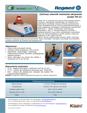 Cyfrowy miernik momentu skręcania model TD-21 Tester TD-21 przeznaczony jest do precyzyjnego pomiaru momentu obrotowego potrzebnego do otwarcia lub zamknięcia wszelkiego rodzaju zamknięć gwintowanych. Tester charakteryzuje się wysoką niezawodnością łącząc w sobie dokładność wynikającą z zastosowania nowoczesnej elektroniki z solidną konstrukcją mechaniczną. Wyposażony jest w mikroprocesorowy kontroler z oprogramowaniem typu menu, podświetlany wyświetlacz LCD oraz foliową klawiaturę. Wyniki pomiaru mogą być podawane w Nm, kgfcm lub lbin. Oprócz wyniku pojedynczego pomiaru tester wykonuje obliczenia statystycznego dla serii pomiarów. Porty równoległy i szeregowy pozwalają na przesyłanie wyników pomiarów do drukarki lub komputera PC. Właściwości • Praca w obu kierunkach obrotu, • Podwójna skala analogowa w Nm oraz lb, • Ogranicznik zapewniający rejestrację maksymalnej wartości momentu występującego podczas pomiaru, • Samo centrujący się uchwyt dla próbek o średnicach od 15 do 70 mm, Adapter M Uchwyt TO Wyposażenie opcjonalne • TT-M - Adapter dla próbek o średnicach od 5 do 15 mm, • IT-TO - Uchwyt dla metalowych pokrywek typu “Twist-Off”, • KAA - Uchwyt dla plastikowych nakrętek dla butelek PET z ogranicznikiem kątowym. UWAGA: Na zdjęciach elementy wyposażenia pokazane są z testerem analogowym. Uchwyt KAA Podstawowe dane techniczne Zakres pomiaru 0-15 Nm/ 150 kgf.cm/ 130 lbf.pol Rozdzielczość 0.01Nm/ 0.01 kgf.cm/ 0.01 lbf.pol Zasilanie, pobór mocy 230 V / 50 Hz, 100 W Wymiary (Sz x D x W) 510 x 400 x 230 mm Waga 9 kg Firma Klimatest • ul. Pilczycka 198F • 54-144 Wrocław • [email protected] Tel. 0 71 354 06 80 (81, 82) • Faks: 0 71 354 06 92 • www.klimatest.eu Firma Klimatest - Biuro w Warszawie • ul.Wólczyńska 133 • 01-919 Warszawa • [email protected] Tel. 0 22 864 04 35 • Faks: 0 22 864 04 35 Firma Klimatest © 2008-08 • www.klimatest.eu V.1.0