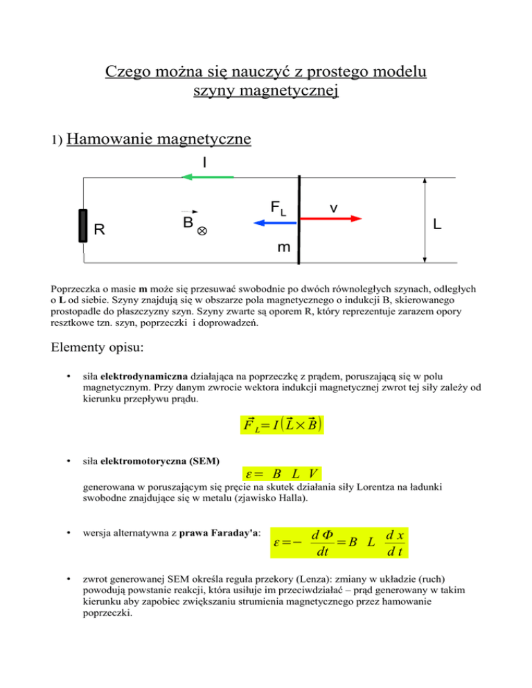 Czego można się nauczyć z prostego modelu szyny magnetycznej 1) Hamowanie magnetyczne I R B FL v L ⊗ m Poprzeczka o masie m może się przesuwać swobodnie po dwóch równoległych szynach, odległych o L od siebie. Szyny znajdują się w obszarze pola magnetycznego o indukcji B, skierowanego prostopadle do płaszczyzny szyn. Szyny zwarte są oporem R, który reprezentuje zarazem opory resztkowe tzn. szyn, poprzeczki i doprowadzeń. Elementy opisu: • siła elektrodynamiczna działająca na poprzeczkę z prądem, poruszającą się w polu magnetycznym. Przy danym zwrocie wektora indukcji magnetycznej zwrot tej siły zależy od kierunku przepływu prądu. FL= I L B • siła elektromotoryczna (SEM) ε= B L V generowana w poruszającym się pręcie na skutek działania siły Lorentza na ładunki swobodne znajdujące się w metalu (zjawisko Halla). • wersja alternatywna z prawa Faraday'a: • zwrot generowanej SEM określa reguła przekory (Lenza): zmiany w układzie (ruch) powodują powstanie reakcji, która usiłuje im przeciwdziałać – prąd generowany w takim kierunku aby zapobiec zwiększaniu strumienia magnetycznego przez hamowanie poprzeczki. ε =− dΦ dx =B L dt dt Rozwiązanie: V (t )=V o e −λ t 2 B L λ= mR 2 Bilans energetyczny: Energia kinetyczna Ciepło Joula-Lorenza 2) Prądnica magnetyczna prądu stałego I B R FL F L ⊗ m Elementy opisu: • • • jw. + warunek Vo=0 dodatkowo zewnętrzna siła napędzająca F , wykonująca pracę nad układem i wprowadzająca do niego energię ewentualna obecność mechanicznych sił oporu, które na razie zostaną pominięte Równanie ruchu: ( dV m = ( F −F L ) = dt 2 2 B L F− V R ) Rozwiązanie: V (t )=V k ( 1−e−λ t ) V k= FR 2 2 B L W stanie ustalonym: 2 • Moc wprowadzana do układu: P = F V k 2 2 2 F R = 2 2 B L 2 B L Vk F2R ε = = 2 2 • Moc wydzielana: P r = R R B L Bilans energetyczny: Praca mechaniczna Energia kinetyczna Ciepło Joula-Lorenza 3) Prosty a w miarę realistyczny model działania silnika elektrycznego prądu stałego (może też być modelem działa elektromagnetycznego ;-) I Uo + - B R v ⊗ m FL L Poprzeczka o masie m może się przesuwać swobodnie po dwóch równoległych szynach, odległych o L od siebie. Szyny znajdują się w obszarze pola magnetycznego o indukcji B, skierowanego prostopadle do płaszczyzny szyn. Do tych szyn podłączono źródło zasilania o napięciu Uo przez opornik o wartości R (opornik ten zawiera w sobie wszystkie opory resztkowe tzn. szyn, poprzeczki i doprowadzeń). Na dynamikę ruchu poprzeczki mają wpływ następujące elementy: • siła elektrodynamiczna działająca na poprzeczkę z prądem, poruszającą się w polu magnetycznym. Przy danym zwrocie wektora indukcji magnetycznej zwrot tej siły zależy od kierunku przepływu prądu. F⃗L= I ( ⃗L ⃗ B) • siła oporu poprzeczki, zawierająca składową tarcia poprzeczki o szyny oraz ewentualną siłę oporu powietrza, zależną od prędkości poprzeczki. Zwrot siły oporu jest zawsze przeciwny do zwrotu wektora prędkości. F T = m g b V • siła elektromotoryczna, generowana w poprzeczce przy jej ruchu w polu magnetycznym. =B L V Zwrot tej siły względem napięcia zasilającego Uo jest określony przez tzw. regułę przekory albo regułę Lenza. Mówi ona, że generowana siła elektromotoryczna ma taki zwrot, aby zapobiegać zmianom w układzie, w szczególności naszej sytuacji będzie zawsze skutkowała hamowaniem ruchu poprzeczki. • generowanie prądu w obwodzie pod wpływem wypadkowej siły elektromotorycznej, tzn. złożenia Uo i , określonego przez prawo Ohma z wartością oporności R. Napięcie zasilające jest podłączone tak, aby wymuszać ruch poprzeczki w prawo. I= Uo− R Działanie tych czynników określa kompletną postać równania ruchu poprzeczki po szynach. m dV Uo−B L V = F L− F T = B L − m g − bV dt R Po drobnych przekształceniach dostajemy: dV = a o− g −k V dt gdzie odpowiednie stałe dane są wzorami: 2 B LU o ao = mR 2 B L b k = mR m Równanie to opisuje ruch poprzeczki, co oznacza, że dla prędkości początkowej Vo=0 równanie można stosować dla a o większego od g , kiedy poprzeczka sama rusza do przodu, albo w sytuacji V > 0. Rozwiązanie równania dla Vo=0 ma postać: V t = V k 1−e− t gdzie: Vk = a o− g B L U o − m g R BL g = = Uo − k kmR kmR k Po wstawieniu wartości stałej k otrzymujemy: Vk = B LU o 2 2 B L b R − mg R 2 2 B L b R Prąd pobierany w czasie ruchu poprzeczki wynosi: Ik = 2 2 U o−B L V k Uo Uo B L gBL bR mg BL = 1− = 2 2 2 2 R R kmR kR R B L b R B L b R Pomijamy opór powietrza (b=0) W sytuacji gdy pominiemy opór powietrza dostajemy: Ik = m g BL Oznacza to, że układ zużywa prąd tylko na pokonanie oporów tarcia (sił przeciwdziałających ruchowi silnika), natomiast sam ruch bez oporów (bieg swobodny silnika) nie powoduje żadnego zużycia energii ani wydzielania ciepła. Zamiast siły tarcia może tu wystąpić dowolna siła hamująca niezależna od prędkości np. siła wykonująca pracę użyteczną. Dodatkowo dla tego przypadku równanie na prędkość końcową przyjmuje postać: Vk = Uo mg R − 2 2 BL B L Po uwzględnieniu wartości na prąd końcowy dostajemy prostą i zrozumiałą relację: Vk = U o− R I k BL Po prostu prędkość musi osiągnąć wartość przy której indukowana siła elektromotoryczna równoważy napięcie zasilania pomniejszone o spadek napięcia na oporach w obwodzie: B LV k = U o − R Ik Ponowne przyjrzenie się pełnym równaniom na prędkość i prąd końcowy prowadzi do istotnego wniosku, że napisane powyżej równanie jest prawdziwe ogólnie, nie tylko dla b=0 ! Oznacza to tylko tyle, że cała rola sił oporu, zarówno sił tarcia jak i sił oporu powietrza zostaje w pełni uwzględniona przez wartość prądu w stanie końcowym i wniosek końcowy wiążące wielkości mierzone w stanie końcowym prowadzi do prostego i oczywistego równania, którego sensem jest drugi