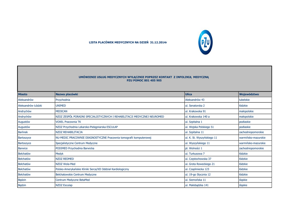 LISTA PLACÓWEK MEDYCZNYCH NA DZIEŃ 31.12.2014r UMÓWIENIE USŁUG MEDYCZNYCH WYŁĄCZNIE POPRZEZ KONTAKT Z INFOLINIĄ MEDYCZNĄ PZU POMOC 801 405 905 Miasto Nazwa placówki Ulica Województwo Aleksandrów Przychodnia Aleksandrów 43 lubelskie Aleksandrów Łódzki UNIMED ul. Senatorska 2 łódzkie Andrychów MEDICAN ul. Krakowska 91 małopolskie Andrychów NZOZ ZESPÓŁ PORADNI SPECJALISTYCZNYCH I REHABILITACJI MEDYCZNEJ NEUROMED ul. Krakowska 140 a małopolskie Augustów VOXEL Pracownia TK ul. Szpitalna 1 podlaskie Augustów NZOZ Przychodnia Lekarsko-Pielęgniarska ESCULAP ul. Wojska Polskiego 51 podlaskie Barlinek NZOZ REHABILITACJA ul. Szpitalna 11 zachodniopomorskie Bartoszyce NU-MEDIC PRACOWNIE DIAGNOSTYCZNE Pracownia tomografii komputerowej ul. K. St. Wyszyńskiego 11 warmińsko-mazurskie Bartoszyce Specjalistyczne Centrum Medyczne ul. Wyszyńskiego 11 warmińsko-mazurskie Barwice PODIMED Przychodnia Barwicka pl. Wolności 1 zachodniopomorskie Bełchatów Medyk ul. Turkusowa 7 łódzkie Bełchatów NZOZ REDMED ul. Częstochowska 37 łódzkie Bełchatów NZOZ Wola-Med ul. Grota Roweckiego 21 łódzkie Bełchatów Polsko-Amerykańskie Kliniki Serca/XII Oddział Kardiologiczny ul. Czapliniecka 123 łódzkie Bełchatów Bełchatowskie Centrum Medyczne ul. 19-go Stycznia 12 łódzkie Będzin Centrum Medyczne BetaMed ul. Siemońska 11 śląskie Będzin NZOZ Esculap ul. Małobądzka 141 śląskie Będzin Centrum Medyczne INTER-MED ul. Krasickiego 14 śląskie Będzin NZOZ Niepubliczne Poradnie Lekarskie MEDICA ul. ZBOWiD-u 21A śląskie Biała Podlaska NZOZ MEDYK ul. Królowej Jadwigi 2 lubelskie Biała Podlaska Specjalityczny Zespół Medyczny INTERMED ul. Kraszewskiego 6 lubelskie Białośliwie Centrum Medyczne Mutmed ul. Ks. Kordeckiego 3 wielkopolskie Biały Bór PODIMED Przychodnia Medycyny Rodzinnnej ul. Nadrzeczna 2A/1 zachodniopomorskie Białystok Centrum Medyczne BetaMed ul. Stanisława Bukowskiego 1/2 podlaskie Białystok Centrum Medyczne Hansa-Rehabilitacja ul. Choroszczańska 24 podlaskie Białystok Centrum Zdrowia MEDYCYNA ul. KEN 50/U4 podlaskie Białystok Centrum Zdrowia MEDYCYNA ul. Mickiewicz 39/U7 podlaskie Białystok Lekarska Specjalistyczna Spółdzielnia Pracy Eskulap ul. Malmeda 6 podlaskie Białystok Lekarska Specjalistyczna Spółdzielnia Pracy Eskulap ul. Nowy Świat 11 c podlaskie Białystok Lekarska Specjalistyczna Spółdzielnia Pracy Eskulap ul. Białówny 9/1 podlaskie Białystok NZOZ Podlaskie Centrum Medyczne ul. Transportowa 4 podlaskie Białystok Specjalistyczny Niepubliczny Zakład Opieki Zdrowotnej LEGE ARTIS ul. Młynowa 17 podlaskie Białystok Centrum Zdrowia MEDYCYNA ul. Tysiąclecia P. P. 10 podlaskie Bielawa Przychodnia Lekarsko-Rehabilitacyjna ZDROVIT ul. Jana III Sobieskiego 19a/2 dolnośląskie Bielsko-Biała Centrum Medyczne BetaMed ul. Prusa 61 śląskie Bielsko-Biała Biel-Med ul. Szara 5 śląskie Bielsko-Biała Danea CENTRUM MEDYCZNE ul. Jaworzańska 40 śląskie Bielsko-Biała Polsko-Amerykańskie Kliniki Serca/II Oddział Kardiologiczny ul. Armii Krajowej 101 śląskie Bielsko-Biała Klinika Św. Łukasza ul. Bystarzańska 94 b śląskie Bielsko-Biała NZOZ Centrum Medyczne BIMED ul. Krasińskiego 24/7B śląskie Bielsko-Biała NZOZ Ultramedic Centrum Medyczne ul. Broniewskiego 48 śląskie Bielsko-Biała NZOZ Zdrowie i Rehabilitacja ul. Karpacka 24 śląskie Bielsko-Biała Przychodnia Rehabilitacyjna Domena ul. Kustronia 40/40a śląskie Bielsko-Biała Zdrowie i Rehabilitacja ul. Powstańców Śl 8 śląskie Bielsko-Biała Rehabilitacja Św. Łukasza ul. Bystrzańska 94B śląskie Bielsko-Biała Euroklinika ul. Żółkiewskiego 40 śląskie Bielsko-Biała Euroklinika ul. Piotra Skargi 9 śląskie Bielsko-Biała Was-Med. Centrum Terapii Manualnej Rehabilitacji i Krioterapii ul. Harcerska 7 śląskie Biłgoraj Centrum Medyczne Luxmed ul. Kościuszki 18 lubelskie Biłgoraj Przychodnia Lekarska Twój Lekarz ul. Dr. S. Pojaska 3 lubelskie Błażowa Promedica ul. Armii Krajowej 30 podkarpackie Błonie Centrum Medyczne Credomed ul. Traugutta 14 mazowieckie Bochnia Medikarte ul. Proszowska 1 małopolskie Bochnia Centrum Medyczne CenterMed ul. Kazimierza Wielkiego 13 małopolskie Boguchwała Centrum Medyczne Medyk ul. Przemysłowa 2C podkarpackie Bolesławiec NZOZ Podstawowo-Specjalistyczna Przychodnia Lekarska CHUMED al. Tysiąclecia 10 a/b dolnośląskie Bolesławiec Przychodnia Lekarz Domowy ul. Zgorzelecka 12 dolnosląskie Bożków SALUS Centrum Medyczne Bożków 53 dolnośląskie Bralin Zakład Podstawowej Opieki Zdrowotnej MEDICA ul. 3-go Maja 9 wielkopolskie Braniewo Nasz lekarz ul. Żeromskiego 14A warmińsko-mazurskie Brodnica NZOZ Ars Medica ul. Aleja Leśna 1 a kujawsko-pomorskie Brudzowice NZOZ PROIMUS ul. Szkolna 12 śląskie Brzeg NZOZ ARS-MED Transport Sanitarny ul. Herberta 1 opolskie Brzeg Dolny Dolnobrzeskie Specjalistyczne Centrum Medyczne ul. Wilcza 6 dolnośląskie Brzesko CenterMed Brzeskie Centrum Medyczne ul. Browarna 5C małopolskie Brzeszcze NZOZ VITA ul. Piłsudskiego 6 małopolskie Brzeszcze NZOZ VITA ul. Nosala 7 małopolskie Brzeziny NZOZ Bremed ul. Sienkiewicza 87 łódzkie Brzozów Prywatny Gabinet Lekarski - Lekarz Marian Owoc ul. Asnyka 4 podkarpackie Busko-Zdrój Indywidualna Specjalistyczna Praktyka Rodzinna Badania Kierowców Wanda Skórska ul. Bohaterów Warszawy 106 świętokrzyskie Bydgoszcz Elmed ul. Karłowicza 7 kujawsko-pomorskie Bydgoszcz Laboratorium Medyczne Synevo ul. Monte Casino 30 kujawsko-pomorskie Bydgoszcz Centrum Medyczne Eskulap ul. Cicha 41 kujawsko-pomorskie Bydgoszcz Centrum Medyczne Gizińscy ul. Leśna 9 kujawsko-pomorskie Bydgoszcz Laboratorium Medyczne Synevo ul. Powstańców Wielkopolskich 26 kujawsko-pomorskie Bydgoszcz Laboratorium Medyczne Synevo ul. Łomżyńska 51a kujawsko-pomorskie Bydgoszcz NZOZ ELMED ul. Karłowicza 3-5 kujawsko-pomorskie Bydgoszcz NZOZ Przychodnia ROMET ul. Fordońska 246 kujawsko-pomorskie Bydgoszcz NZOZ REH-MED. ul. Zapolskiej 18 kujawsko-pomorskie Bydgo