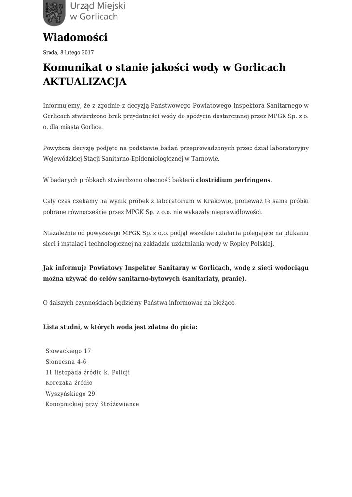 Wiadomości Środa, 8 lutego 2017 Komunikat o stanie jakości wody w Gorlicach AKTUALIZACJA Informujemy, że z zgodnie z decyzją Państwowego Powiatowego Inspektora Sanitarnego w Gorlicach stwierdzono brak przydatności wody do spożycia dostarczanej przez MPGK Sp. z o. o. dla miasta Gorlice. Powyższą decyzję podjęto na podstawie badań przeprowadzonych przez dział laboratoryjny Wojewódzkiej Stacji Sanitarno-Epidemiologicznej w Tarnowie. W badanych próbkach stwierdzono obecność bakterii clostridium perfringens. Cały czas czekamy na wynik próbek z laboratorium w Krakowie, ponieważ te same próbki pobrane równocześnie przez MPGK Sp. z o.o. nie wykazały nieprawidłowości. Niezależnie od powyższego MPGK Sp. z o.o. podjął wszelkie działania polegające na płukaniu sieci i instalacji technologicznej na zakładzie uzdatniania wody w Ropicy Polskiej. Jak informuje Powiatowy Inspektor Sanitarny w Gorlicach, wodę z sieci wodociągu można używać do celów sanitarno-bytowych (sanitariaty, pranie). O dalszych czynnościach będziemy Państwa informować na bieżąco. Lista studni, w których woda jest zdatna do picia: Słowackiego 17 Słoneczna 4-6 11 listopada źródło k. Policji Korczaka źródło Wyszyńskiego 29 Konopnickiej przy Stróżowiance