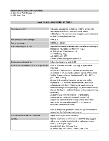 Starostwo Powiatowe w Nowym Targu ul. Bolesława Wstydliwego 14 34-400 Nowy Targ KARTA USŁUGI PUBLICZNEJ Nazwa procedury: Przyjęcie zgłoszenia instalacji, z której emisja nie wymaga pozwolenia, mogącej negatywnie oddziaływać na środowisko z uwagi na wprowadzanie gazów i pyłów do powietrza Kod procesu nadrzędnego: U.UOŚ.6 Kod procedury: U.UOŚ.6-14.OŚ.1 Komórka merytoryczna: Wydział Ochrony Środowiska i Zasobów Naturalnych Starostwo Powiatowe w Nowym Targu ul. Bolesława Wstydliwego 14 34-400 Nowy Targ tel.: (18) 26 61 355 e-mail: [email protected] Osoba odpowiedzialna: Sylwester Magiera, pok. 3.24 Kroki w procedurze/sposób postępowania: Krok 1: Złożenie wniosku o przyjęcie zgłoszenia instalacji Załącznik 1: Zgłoszenie – spełniające wymagania określone w art. 152 ust 2 ustawy z dnia 27 kwietnia 2001 r. Prawo ochrony środowiska (Dz. U. z 2013 r., poz. 1232 ze zm.) Załącznik 2: oryginał dowodu wniesienia opłaty skarbowej – za wydanie zezwolenia na zbieranie odpadów (może to być także wydruk dokumentu elektronicznego sporządzonego na podstawie ustawy Prawo Bankowe – potwierdzający wykonaną operację przelewu). Załącznik 3: pełnomocnictwo - w przypadku ustanowienia pełnomocnictwa (oryginał lub urzędowo potwierdzona kopia) wraz z dowodem uiszczenia stosownej opłaty (17 zł od jednego stosunku pełnomocnictwa). Krok 2: Przyjęcie zgłoszenia lub decyzja o wniesieniu sprzeciwu do złożonego zgłoszenia. Formularze/wnioski do pobrania: Wytyczne – zgłoszenie instalacji Opłaty: Opłatę skarbową w wysokości 120,00 zł za przyjęcie zgłoszenia instalacji należy uiścić na konto Urzędu Miasta w Nowym Targu: Bank PEKAO S.A. O/Nowy Targ nr konta: 68124015741111000007897564 Wpłaty można dokonać także w Kasie Urzędu Miasta w Nowym Targu przy ul. Krzywej 1 lub w kasie Starostwa Powiatowego w Nowym Targu przy ul. Bolesława Wstydliwego 14 Miejsce składania dokumentów/ godziny Dokumenty można: przyjmowania: 1. Przesyłać na adres - Starostwo Powiatowe w Nowym Targu, ul. Bolesława Wstydliwego 14, 34 – 400 Nowy Targ 2. Składać osobiście na Dzienniku Podawczym w Starostwie Powiatowym w Nowym Targu, ul. Bolesława Wstydliwego 14, 34 – 400 Nowy Targ w godzinach pracy Urzędu: pn.-pt. 730-1530 3. Przesłać na elektroniczną skrzynkę podawczą e-PUAP Termin załatwienia sprawy: 30 dni Podstawa prawna: 1. Art. 152 ustawy z dznia 27 kwietnia 2001 r. Prawo ochrony środowiska (Dz. U. Z 2013 r., poz. 1232, z późn. zm.) 2. Rozporządzenie Ministra Środowiska z dnia 2 lipca 2010 r. w sprawie rodzajów instalacji, których eksploatacja wymaga zgłoszenia (Dz. U. Nr 130, poz. 880) 3. Rozporządzenie Ministra Środowiska z dnia 2 lipca 2010 r. w sprawie przypadków, w których wprowadzanie gazów lub pyłów do powietrza z instalacji nie wymaga pozwolenia (Dz. U. Nr 130, poz. 881) 4. Ustawa z dnia 16 listopada 2006r o opłacie skarbowej (Dz. U. z 2012r. , poz. 1282 z późn. zm) Tryb odwoławczy: Od decyzji przysługuje odwołanie do Samorządowego Kolegium Odwoławczego w Nowym Sączu, ul. Gorzkowska 30, 33 – 300 Nowy Sącz, za pośrednictwem Starosty Nowotarskiego, wniesione w terminie 14 dni od daty otrzymania decyzji. Usługi/dodatkowe informacje: Do rozpoczęcia eksploatacji instalacji można przystąpić jeżeli organ w terminie 30 dni od dnia doręczenia zgłoszenia nie wniesie sprzeciwu w drodze decyzji. Produkty procedury: Data sporządzenia: 04.09.2014 r. Sporządził: Sylwester Magiera ---------