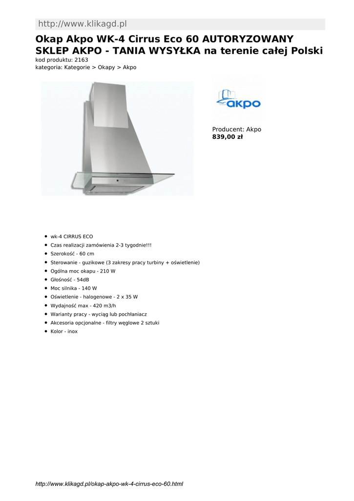 http://www.klikagd.pl Okap Akpo WK-4 Cirrus Eco 60 AUTORYZOWANY SKLEP AKPO - TANIA WYSYŁKA na terenie całej Polski kod produktu: 2163 kategoria: Kategorie > Okapy > Akpo Producent: Akpo 839,00 zł wk-4 CIRRUS ECO Czas realizacji zamówienia 2-3 tygodnie!!! Szerokość - 60 cm Sterowanie - guzikowe (3 zakresy pracy turbiny + oświetlenie) Ogólna moc okapu - 210 W Głośność - 54dB Moc silnika - 140 W Oświetlenie - halogenowe - 2 x 35 W Wydajność max - 420 m3/h Warianty pracy - wyciąg lub pochłaniacz Akcesoria opcjonalne - filtry węglowe 2 sztuki Kolor - inox http://www.klikagd.pl/okap-akpo-wk-4-cirrus-eco-60.html
