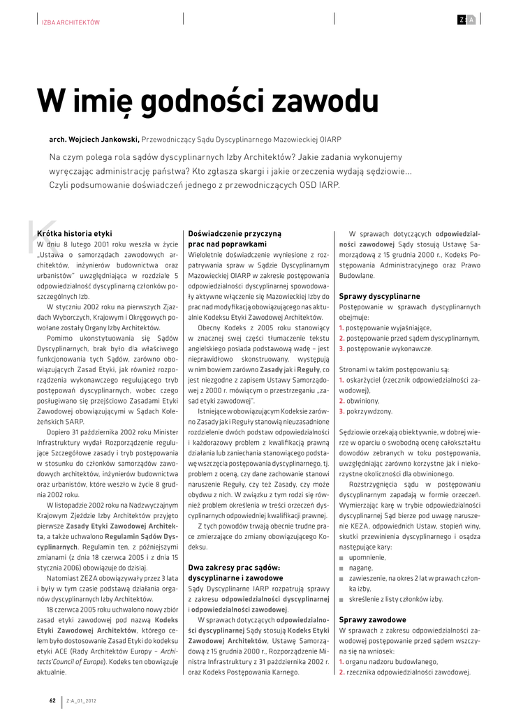 IZBA ARCHITEKTÓW W imię godności zawodu arch. Wojciech Jankowski, Przewodniczący Sądu Dyscyplinarnego Mazowieckiej OIARP Na czym polega rola sądów dyscyplinarnych Izby Architektów? Jakie zadania wykonujemy wyręczając administrację państwa? Kto zgłasza skargi i jakie orzeczenia wydają sędziowie... Czyli podsumowanie doświadczeń jednego z przewodniczących OSD IARP. K Krótka historia etyki W dniu 8 lutego 2001 roku weszła w życie „Ustawa o samorządach zawodowych architektów, inżynierów budownictwa oraz urbanistów” uwzględniająca w rozdziale 5 odpowiedzialność dyscyplinarną członków poszczególnych Izb. W styczniu 2002 roku na pierwszych Zjazdach Wyborczych, Krajowym i Okręgowych powołane zostały Organy Izby Architektów. Pomimo ukonstytuowania się Sądów Dyscyplinarnych, brak było dla właściwego funkcjonowania tych Sądów, zarówno obowiązujących Zasad Etyki, jak również rozporządzenia wykonawczego regulującego tryb postępowań dyscyplinarnych, wobec czego posługiwano się przejściowo Zasadami Etyki Zawodowej obowiązującymi w Sądach Koleżeńskich SARP. Dopiero 31 października 2002 roku Minister Infrastruktury wydał Rozporządzenie regulujące Szczegółowe zasady i tryb postępowania w stosunku do członków samorządów zawodowych architektów, inżynierów budownictwa oraz urbanistów, które weszło w życie 8 grudnia 2002 roku. W listopadzie 2002 roku na Nadzwyczajnym Krajowym Zjeździe Izby Architektów przyjęto pierwsze Zasady Etyki Zawodowej Architekta, a także uchwalono Regulamin Sądów Dyscyplinarnych. Regulamin ten, z późniejszymi zmianami (z dnia 18 czerwca 2005 i z dnia 15 stycznia 2006) obowiązuje do dzisiaj. Natomiast ZEZA obowiązywały przez 3 lata i były w tym czasie podstawą działania organów dyscyplinarnych Izby Architektów. 18 czerwca 2005 roku uchwalono nowy zbiór zasad etyki zawodowej pod nazwą Kodeks Etyki Zawodowej Architektów, którego celem było dostosowanie Zasad Etyki do kodeksu etyki ACE (Rady Architektów Europy – Architects’Council of Europe). Kodeks ten obowiązuje aktualnie. 62 Z:A _01_2012 Doświadczenie przyczyną prac nad poprawkami Wieloletnie doświadczenie wyniesione z rozpatrywania spraw w Sądzie Dyscyplinarnym Mazowieckiej OIARP w zakresie postępowania odpowiedzialności dyscyplinarnej spowodowały aktywne włączenie się Mazowieckiej Izby do prac nad modyfikacją obowiązującego nas aktualnie Kodeksu Etyki Zawodowej Architektów. Obecny Kodeks z 2005 roku stanowiący w znacznej swej części tłumaczenie tekstu angielskiego posiada podstawową wadę – jest nieprawidłowo skonstruowany, występują w nim bowiem zarówno Zasady jak i Reguły, co jest niezgodne z zapisem Ustawy Samorządowej z 2000 r. mówiącym o przestrzeganiu „zasad etyki zawodowej”. Istniejące w obowiązującym Kodeksie zarówno Zasady jak i Reguły stanowią nieuzasadnione rozdzielenie dwóch podstaw odpowiedzialności i każdorazowy problem z kwalifikacją prawną działania lub zaniechania stanowiącego podstawę wszczęcia postępowania dyscyplinarnego, tj. problem z oceną, czy dane zachowanie stanowi naruszenie Reguły, czy też Zasady, czy może obydwu z nich. W związku z tym rodzi się również problem określenia w treści orzeczeń dyscyplinarnych odpowiedniej kwalifikacji prawnej. Z tych powodów trwają obecnie trudne prace zmierzające do zmiany obowiązującego Kodeksu. Dwa zakresy prac sądów: dyscyplinarne i zawodowe Sądy Dyscyplinarne IARP rozpatrują sprawy z zakresu odpowiedzialności dyscyplinarnej i odpowiedzialności zawodowej. W sprawach dotyczących odpowiedzialności dyscyplinarnej Sądy stosują Kodeks Etyki Zawodowej Architektów, Ustawę Samorządową z 15 grudnia 2000 r., Rozporządzenie Ministra Infrastruktury z 31 października 2002 r. oraz Kodeks Postępowania Karnego. W sprawach dotyczących odpowiedzialności zawodowej Sądy stosują Ustawę Samorządową z 15 grudnia 2000 r., Kodeks Postępowania Administracyjnego oraz Prawo Budowlane. Sprawy dyscyplinarne Postępowanie w sprawach dyscyplinarnych obejmuje: 1. postępowanie wyjaśniające, 2. postępowanie przed sądem dyscyplinarnym, 3. postępowanie wykonawcze. Stronami w takim postępowaniu są: 1. oskarżyciel (rzecznik odpowiedzialności zawodowej), 2. obwiniony, 3. pokrzywdzony. Sędziowie orzekają obiektywnie, w dobrej wierze w oparciu o swobodną ocenę całokształtu dowodów zebranych w toku postępowania, uwzględniając zarówno korzystne jak i niekorzystne okoliczności dla obwinionego. Rozstrzygnięcia sądu w postępowaniu dyscyplinarnym zapadają w formie orzeczeń. Wymierzając karę w trybie odpowiedzialności dyscyplinarnej Sąd bierze pod uwagę naruszenie KEZA, odpowiednich Ustaw, stopień winy, skutki przewinienia dyscyplinarnego i osądza następujące kary: upomnienie, naganę, zawieszenie, na okres 2 lat w prawach członka izby, skreślenie z listy członków izby. Sprawy zawodowe W sprawach z zakresu odpowiedzialności zawodowej postępowanie przed sądem wszczyna się na wniosek: 1. organu nadzoru budowlanego, 2. rzecznika odpowiedzialności zawodowej. IZBA ARCHITEKTÓW Rozstrzygnięcia sądu zapadają w formie decyzji lub postanowień. Wymierzając karę za popełnienie czynu z zakresu odpowiedzialności zawodowej sąd bierze pod uwagę stopień błędów i zaniedbań obwinionego pod kątem naruszenia przepisów ustawy Prawo Budowlane, ich skutki oraz dotychczasową karalność z tytułu odpowiedzialności zawodowej w budownictwie osądzając: upomnienie, upomnienie z jednoczesnym nałożeniem obowiązku złożenia, w wyznaczonym terminie egzaminu, o którym mowa w art. 12 ust. 3 ustawy Prawo Budowlane, zakaz wykonywania samodzielnej funkcji technicznej w budownictwie, na okres od roku do 5 lat, połączony z obowiązkiem złożenia w wyznaczonym terminie egzaminu, o którym mowa w art. 12 ust. 3 Prawo Budowlane (karę zakazu wykonywania samodzielnej funkcji technicznej w budo